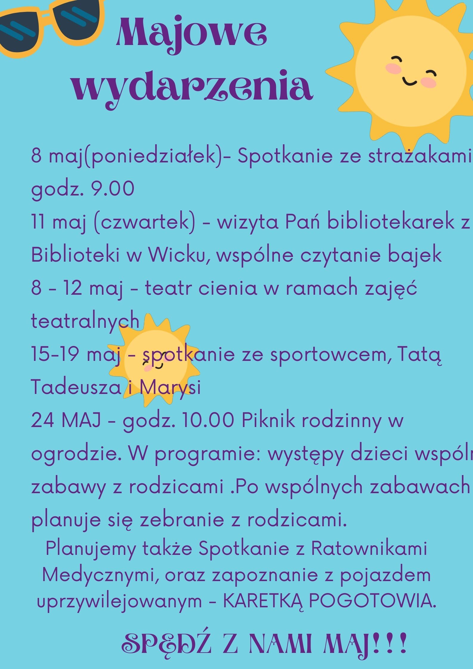 24 MAJ - godz. 10.00 Piknik rodzinny w ogrodzie. W programie: występy dzieci wspólne zabawy z rodzicami .