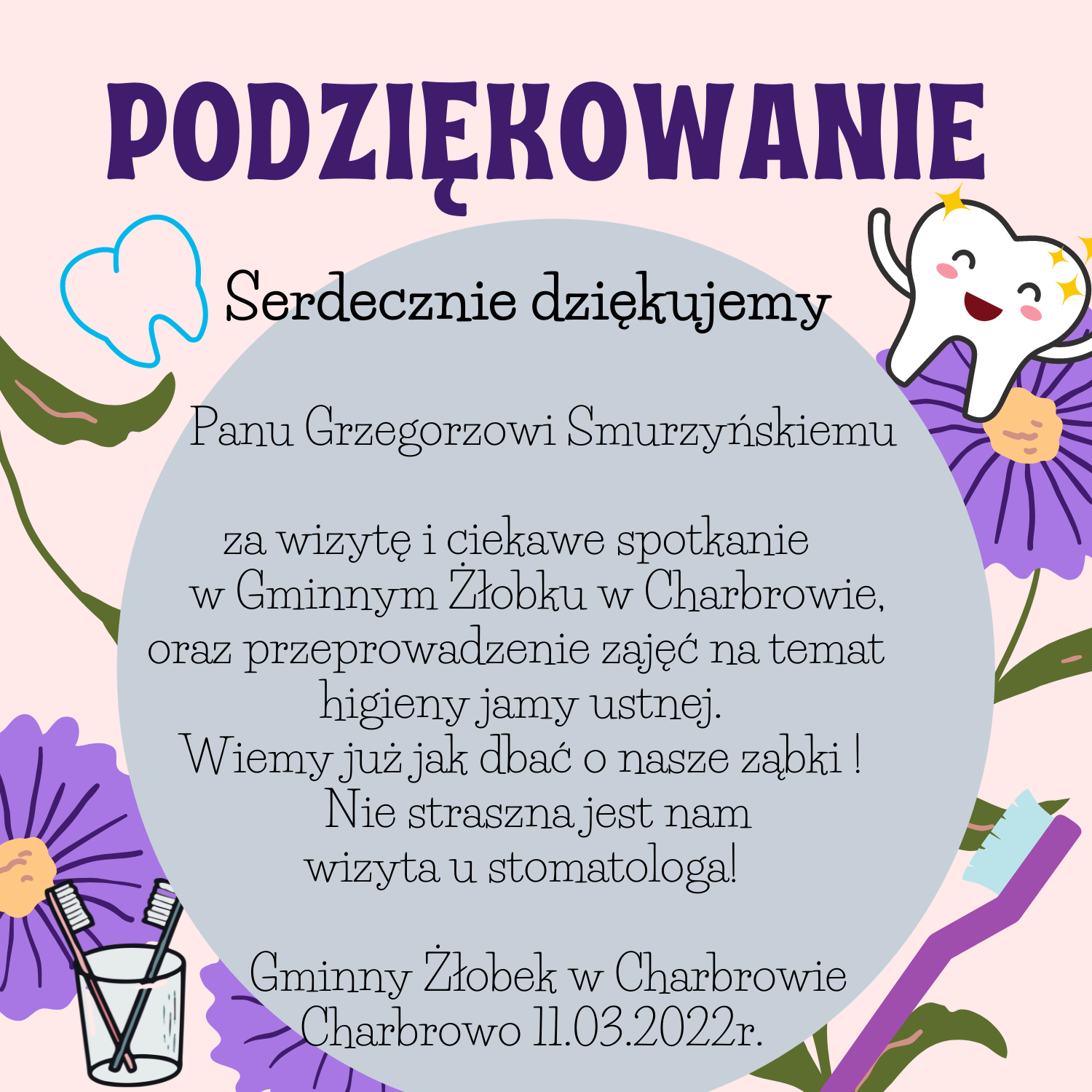 Serdeczne podziękowanie dla Pana Grzegorza Smurzyńskiego za wizytę w żłobku oraz przeprowadzenie zajęć o tematyce higieny jamy ustnej.