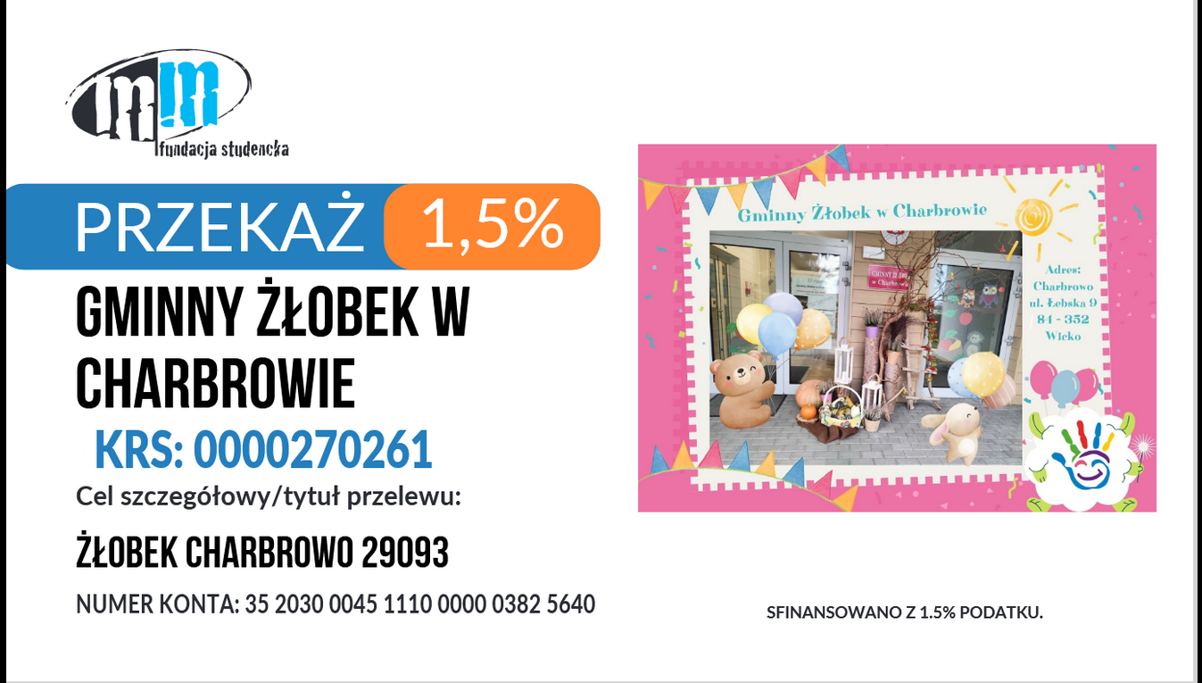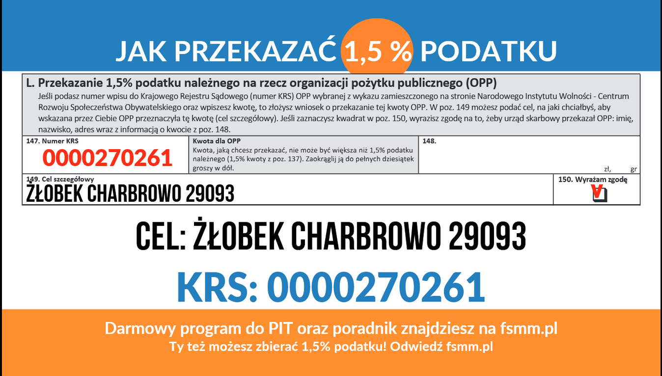Aby przekazać darowiznę , wystarczy w formularzu PIT wypełnić odpowiednią rubrykę , wpisując numer KRS 0000270261 Cel: szczegółowy ŻŁOBEK CHARBROWO 29093