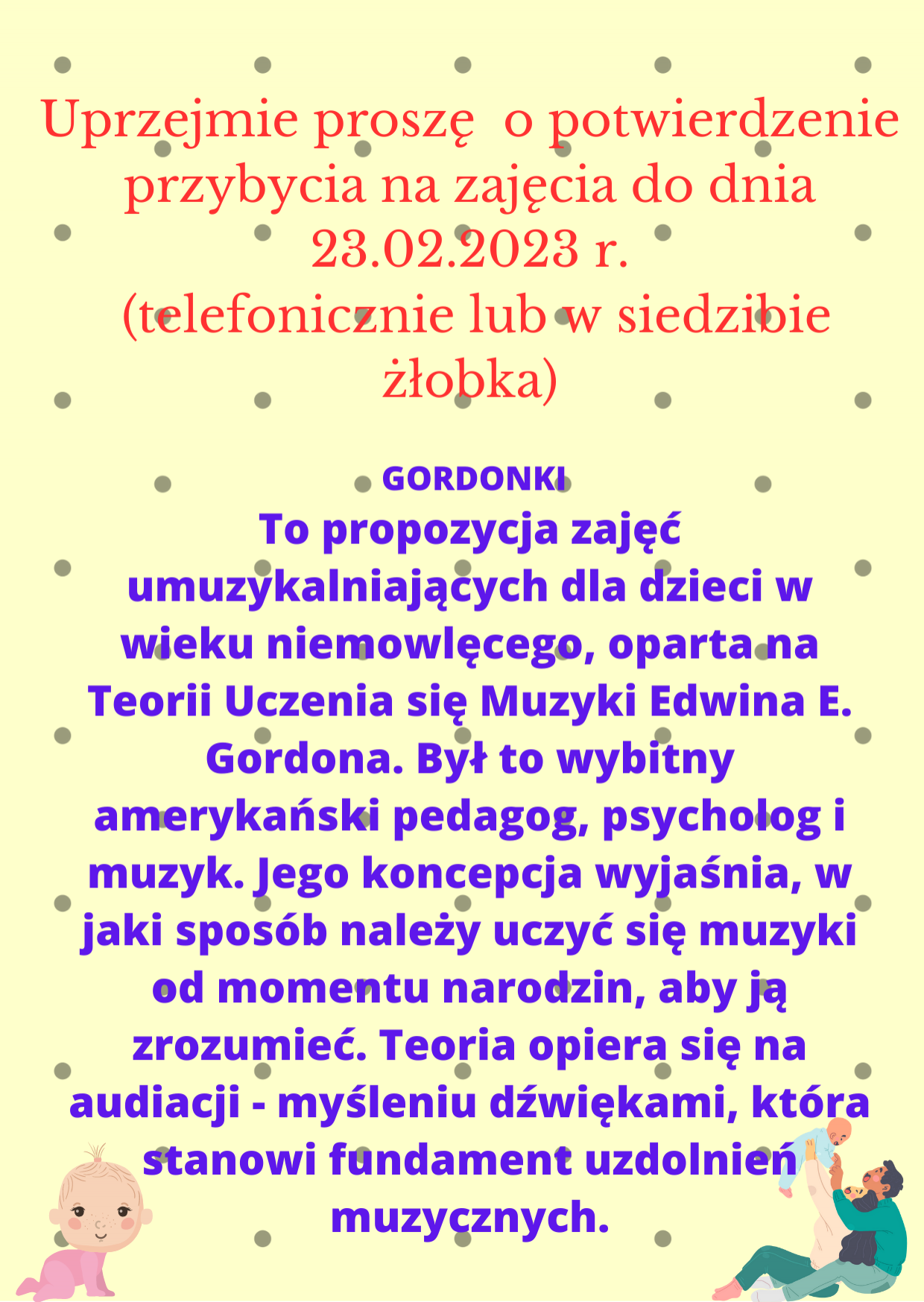 To propozycja zajęć umuzykalniających dla dzieci w wieku niemowlęcego, oparta na Teorii Uczenia się Muzyki Edwina E. Gordona. Był to wybitny amerykański pedagog, psycholog i muzyk. Jego koncepcja wyjaśnia, w jaki sposób należy uczyć się muzyki od momentu narodzin, aby ją zrozumieć. Teoria opiera się na audiacji - myśleniu dźwiękami, która stanowi fundament uzdolnień muzycznych.