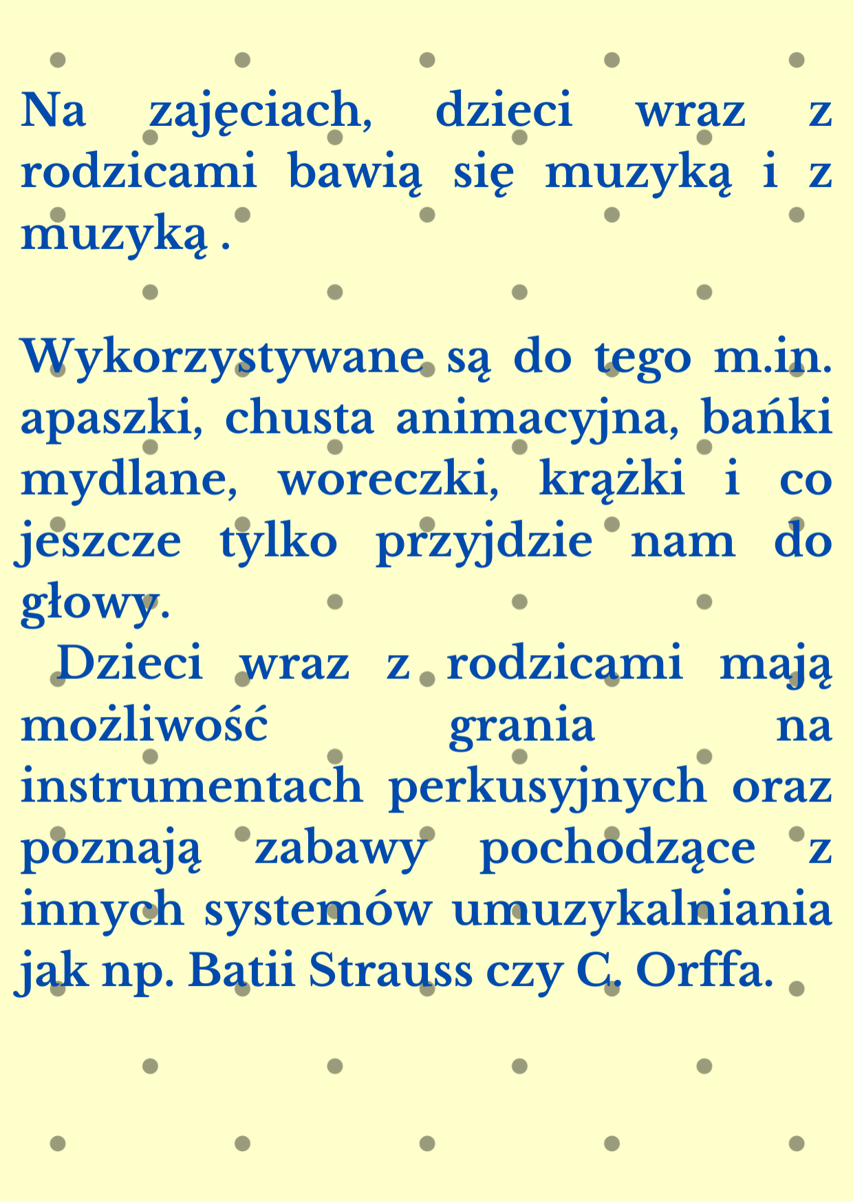 Wykorzystywane są do tego m.in. apaszki, chusta animacyjna, bańki mydlane, woreczki, krążki i co jeszcze tylko przyjdzie nam do głowy. Dzieci wraz z rodzicami mają możliwość grania na instrumentach perkusyjnych oraz poznają zabawy pochodzące z innych systemów umuzykalniania jak np. Batii Strauss czy C. Orffa.