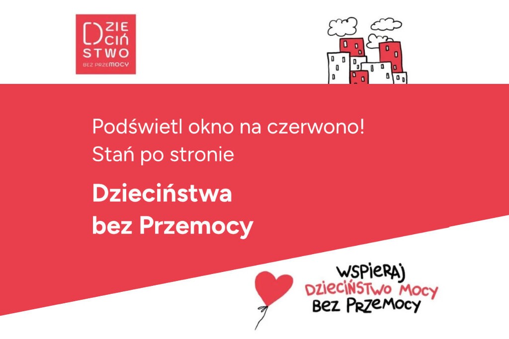Czerwone światło to symbol uwagi, ochrony i zaangażowania. Podświetlony budynek to widoczny znak: jesteśmy razem po stronie dzieci.