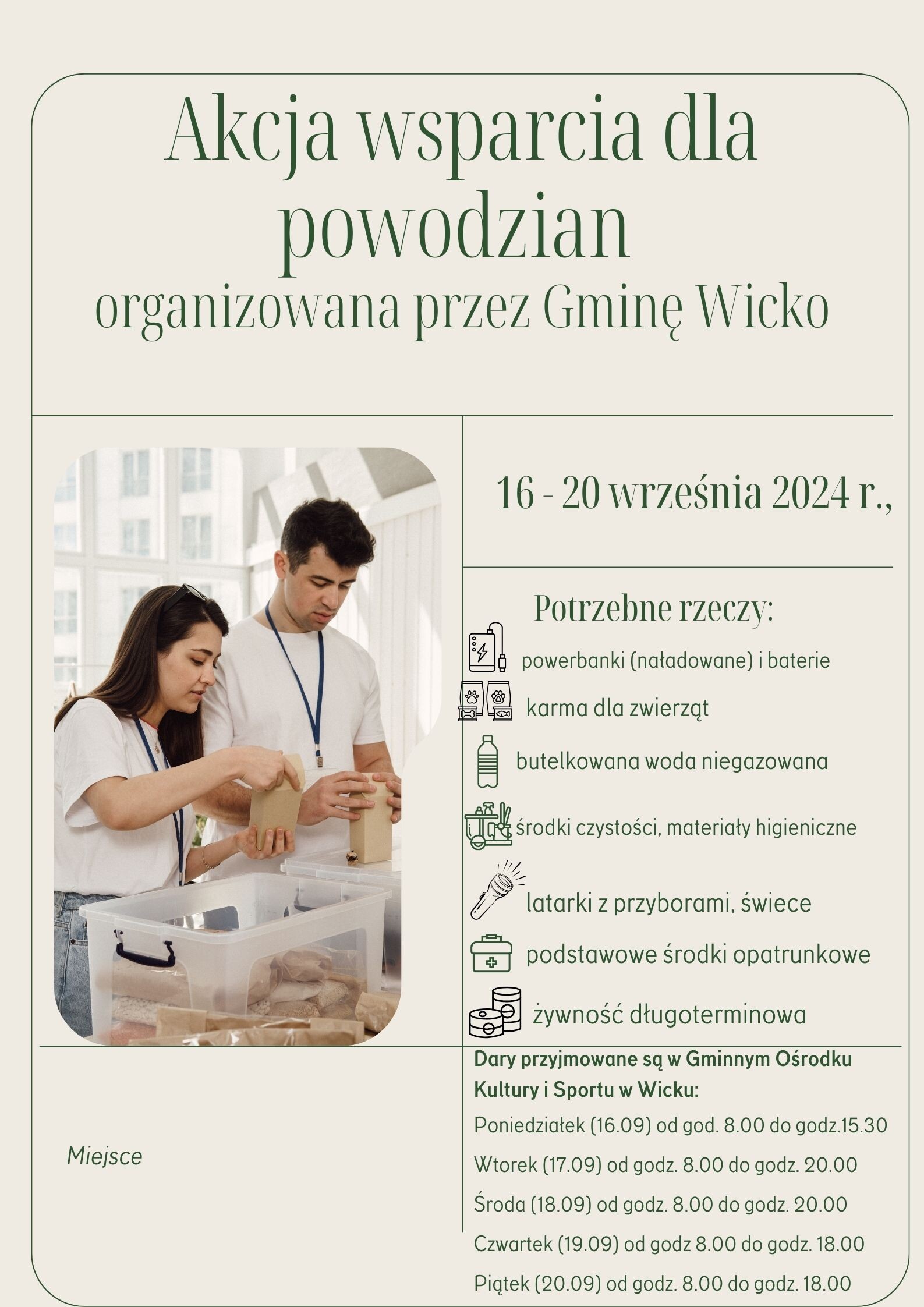 W placówkach oświatowych z terenu Gminy Wicko oraz w Gminnym Ośrodku Kultury i Sportu w Wicku rusza zbiórka środków dla powodzian.