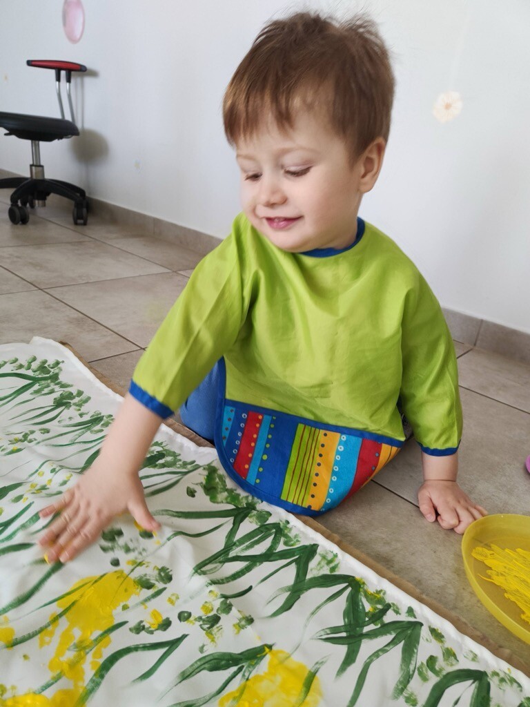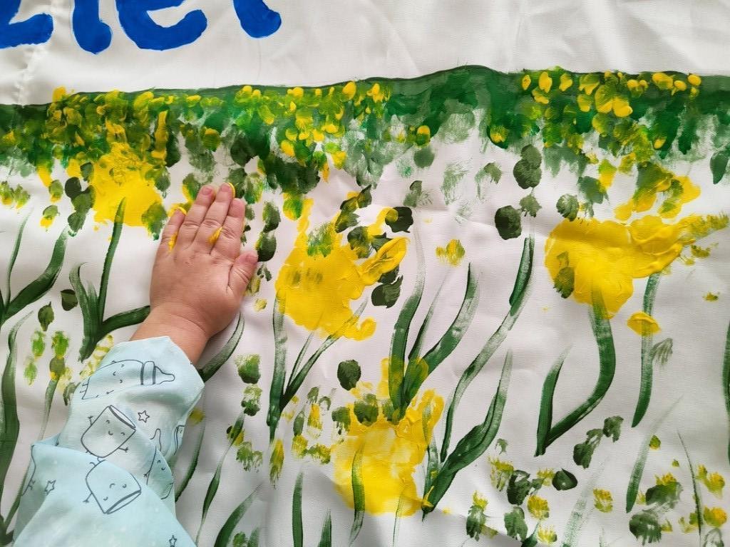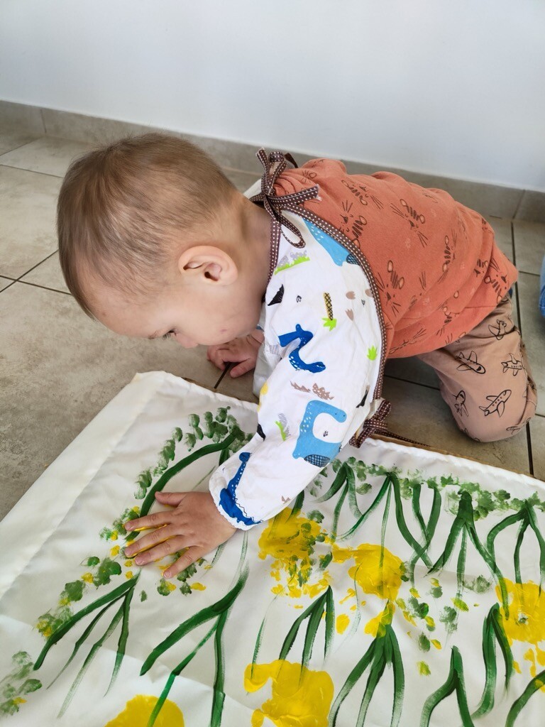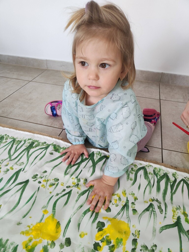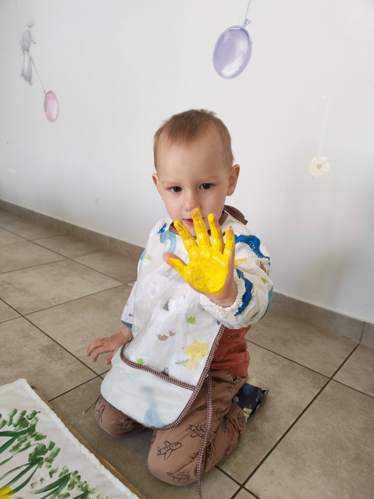 Z wielką ochotą dzieci żłobkowe pod asystą Pani Agnieszki Mądrej-Ostrowskiej wykonały plakat obrazujący pola żonkili, wykonane farbą za pomocą odbitych na płótnie dłoni dzieci.
