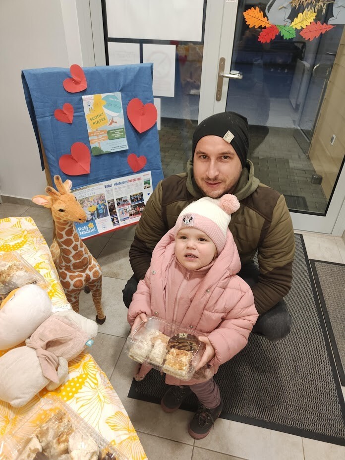 Dzięki włączeniu się w akcję POLA NADZIEI udało nam się zorganizować dwa słodkie piątki. Pracownicy żłobka chętnie upiekli ciasta, które kwestowaliśmy w siedzibie żłobka.