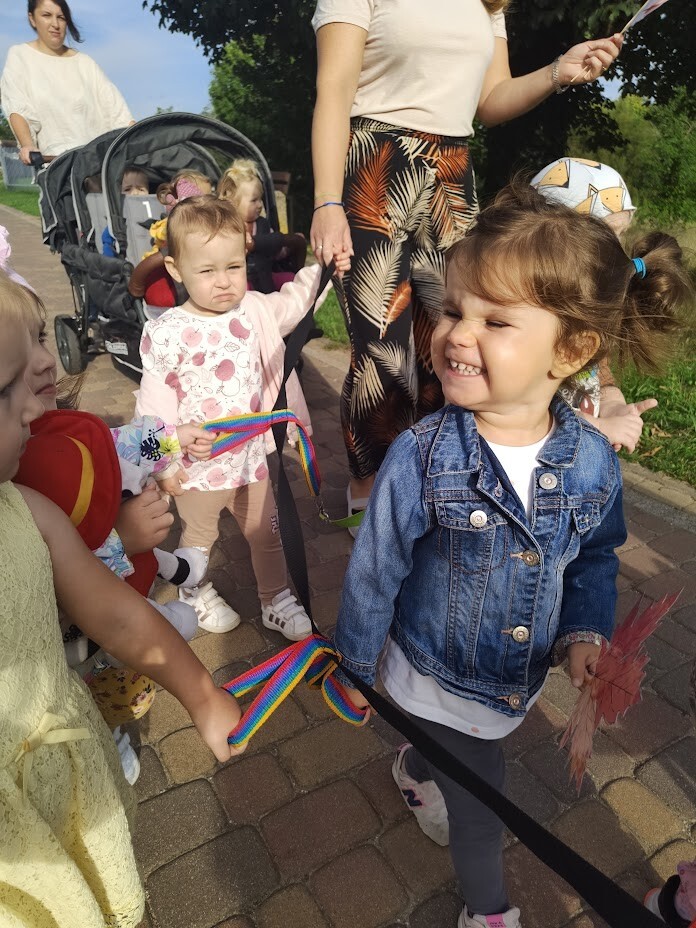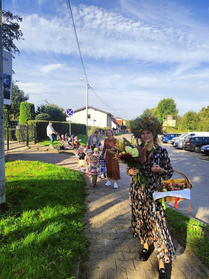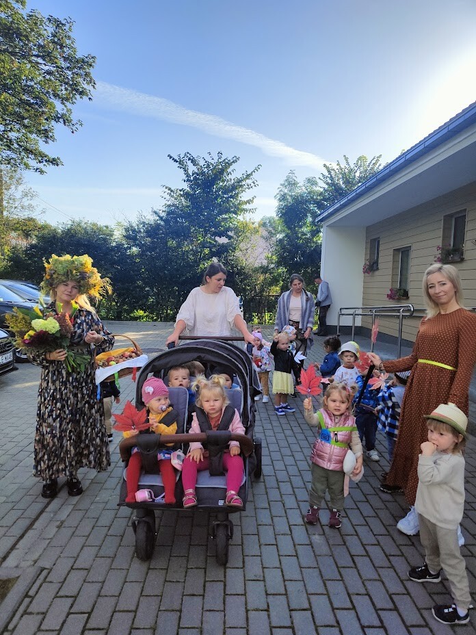 Tym razem radośnie i hucznie przywitaliśmy nową porę roku - JESIEŃ. W barwnym korowodzie, podczas jesiennych utworów spacerowaliśmy ulicami Charbrowa. Dzieci witały przechodniów machając do nich kolorowymi listkami. Pani jesień w kolorowej sukni, wianku oraz z darami, które nam przyniosła wędrowała ze żłobkowiczami oznajmiając o swoim przyjściu.