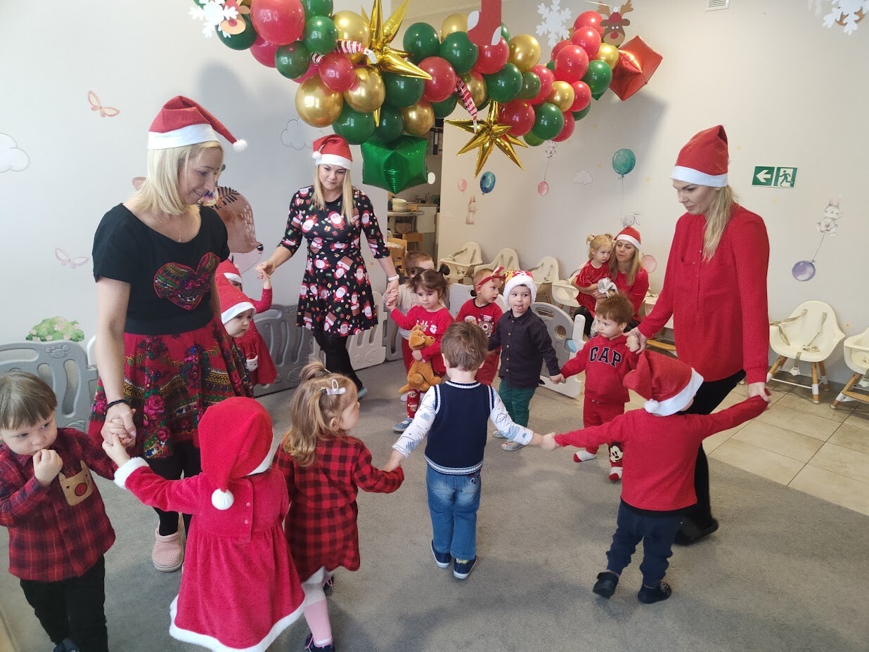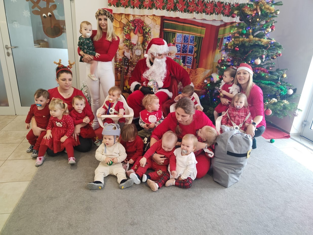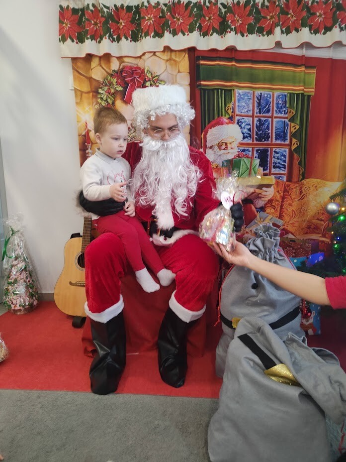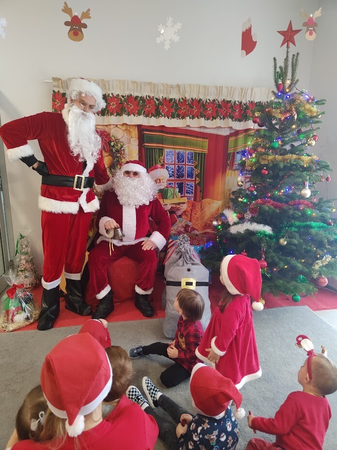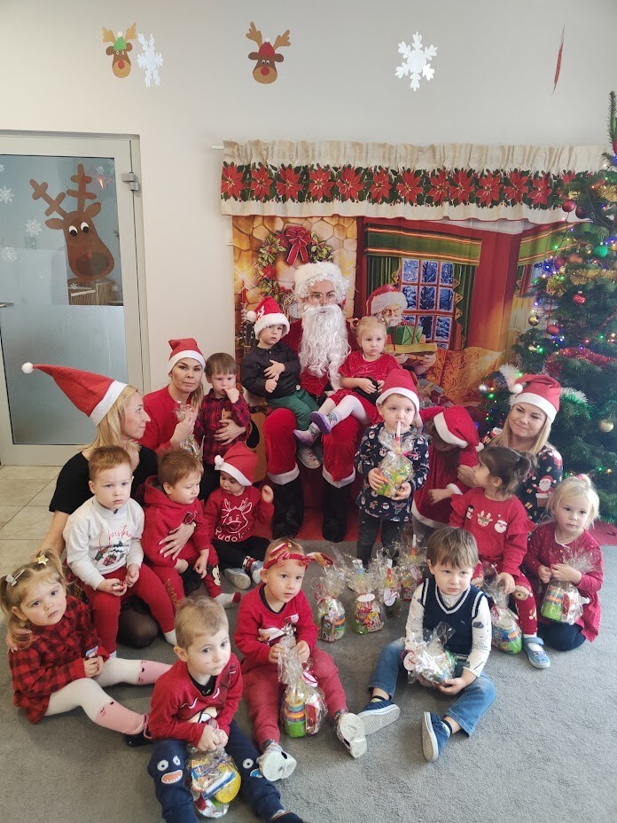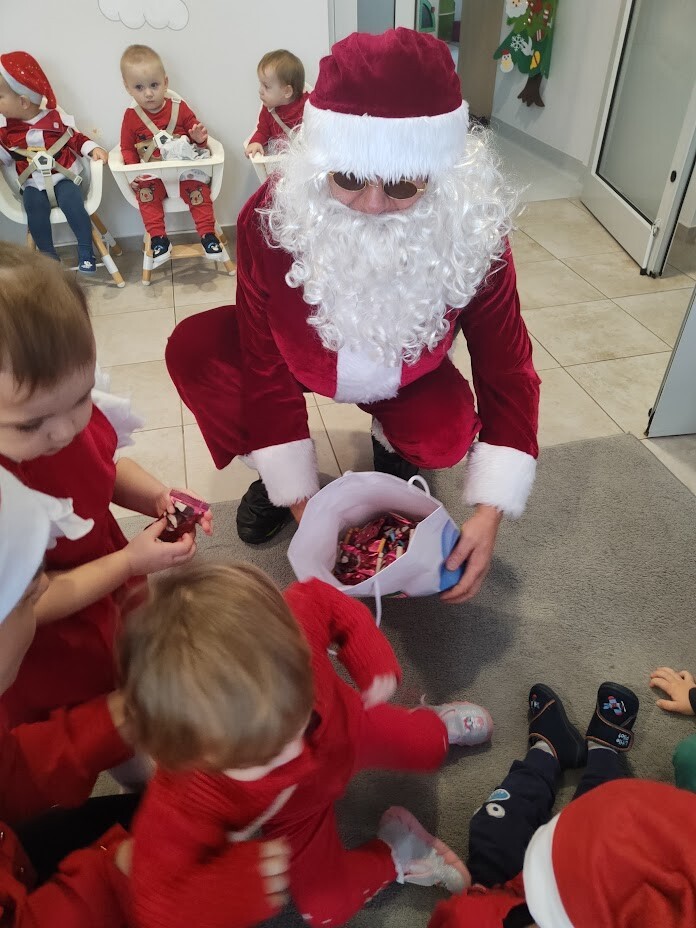 Wizyta Świętego Mikołaja w naszym żłobku to jeden z najbardziej oczekiwanych przez dzieci dni w roku. 6 grudnia 2023r. wszystkie dzieci już od samego rana z wielką niecierpliwością spoglądały na drzwi, nadsłuchiwały „mikołajkowych” dzwoneczków. Święty Mikołaj nie zawiódł dzieci i w godzinach porannych zaglądał do okien żłobka odwiedził wszystkie dzieci. Nasz gość zaczął swoją wizytę od wspólnego kolędowania, ponieważ był to wyjątkowy Święty Mikołaj, który grał na gitarze. Niektóre dzieci po raz pierwszy witały Mikołaja w żłobku. Wszystkie bardzo przeżywały to spotkanie. Na niejednej twarzy można było zobaczyć niepewność i obawę, ale przede wszystkim radość. Dzieci z grupy starszej zatańczyły dla gościa a Mikołaj rozdawał prezenty, bo grzecznych dzieci u nas nie brakowało. Wielką niespodziankę sprawił dzieciom drugi Mikołaj, który rozdawał cukierki.