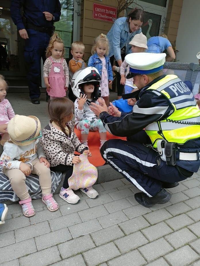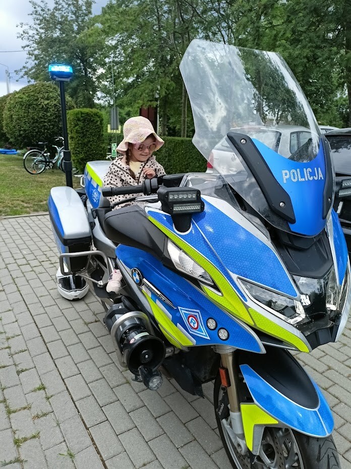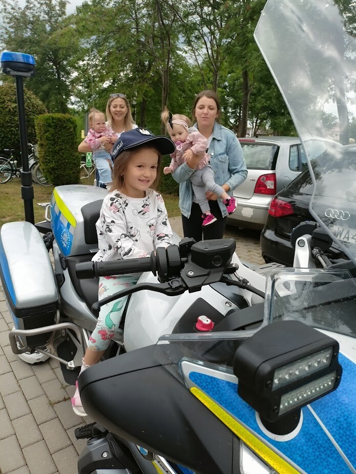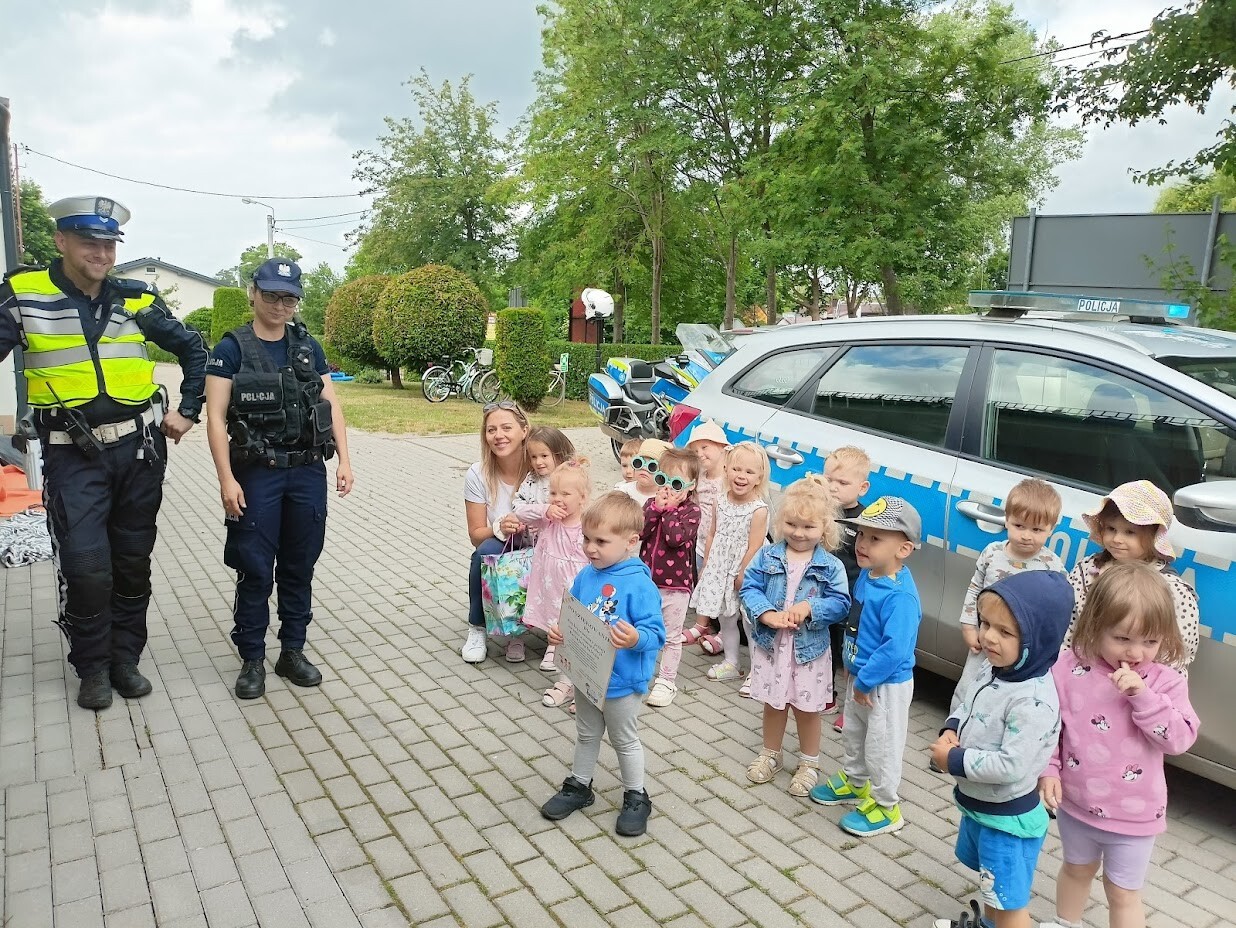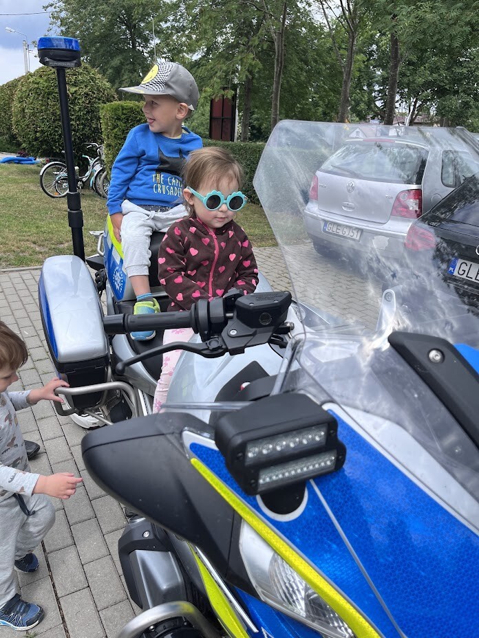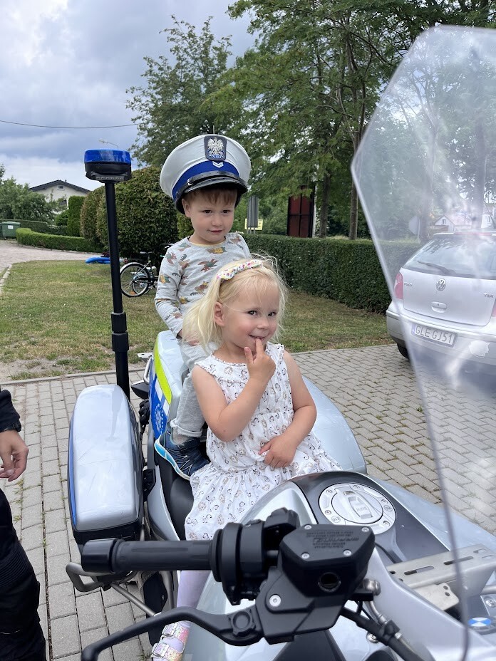 Dzięki uprzejmości Pani Julii Suleckiej - mamie Felicji dzieci ze żłobka miały możliwość spotkania się z funkcjonariuszami Policji z Lęborka. Tematem spotkania było "Bezpiecznie podczas wakacji". Dzieci zapoznały się z pojazdami takimi jak motocykl oraz wóz policyjny, rozpoznawały sygnały świetlne oraz ich kolorystykę.