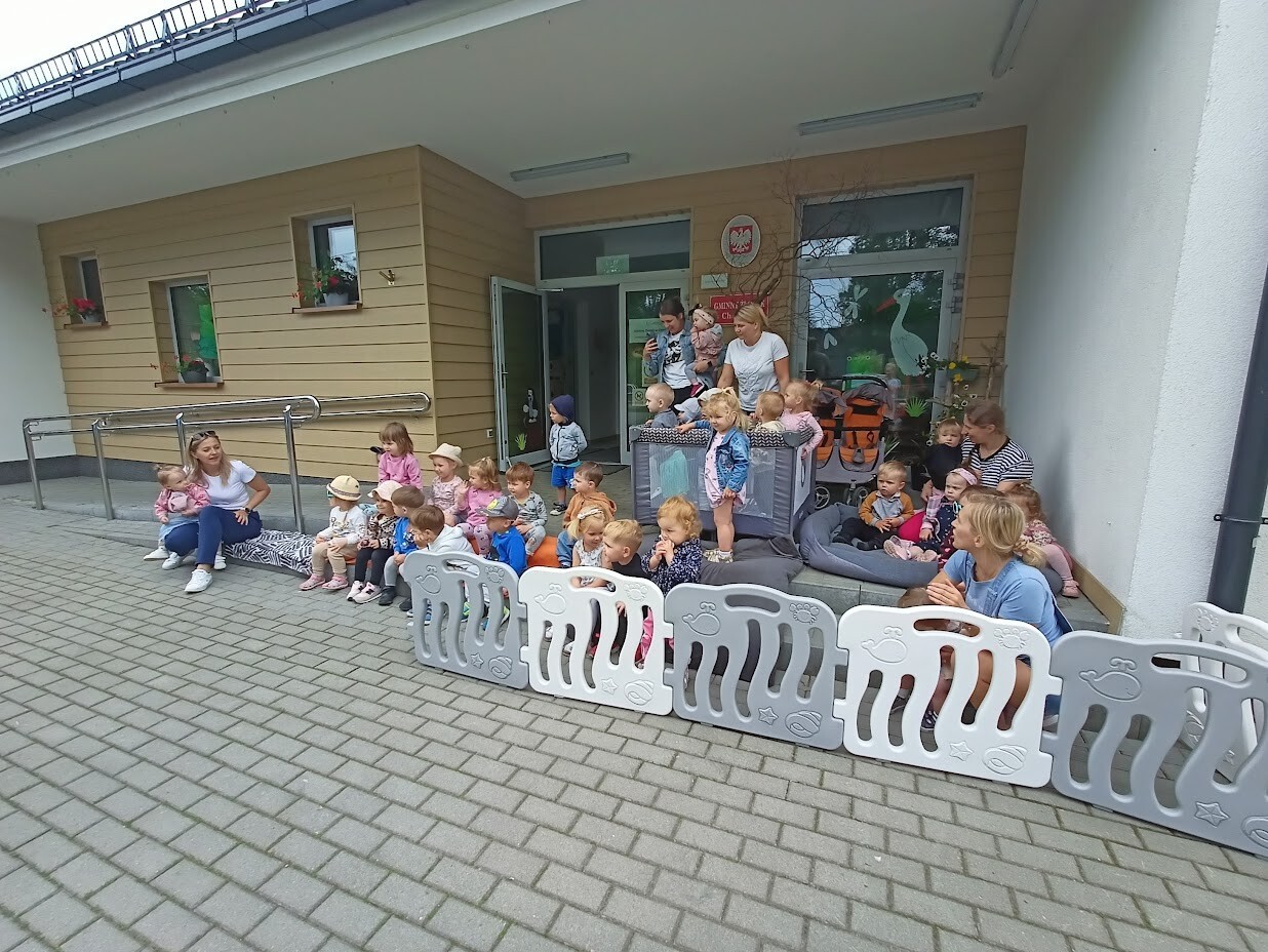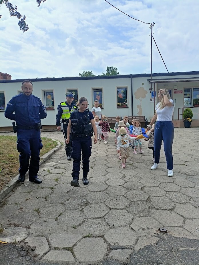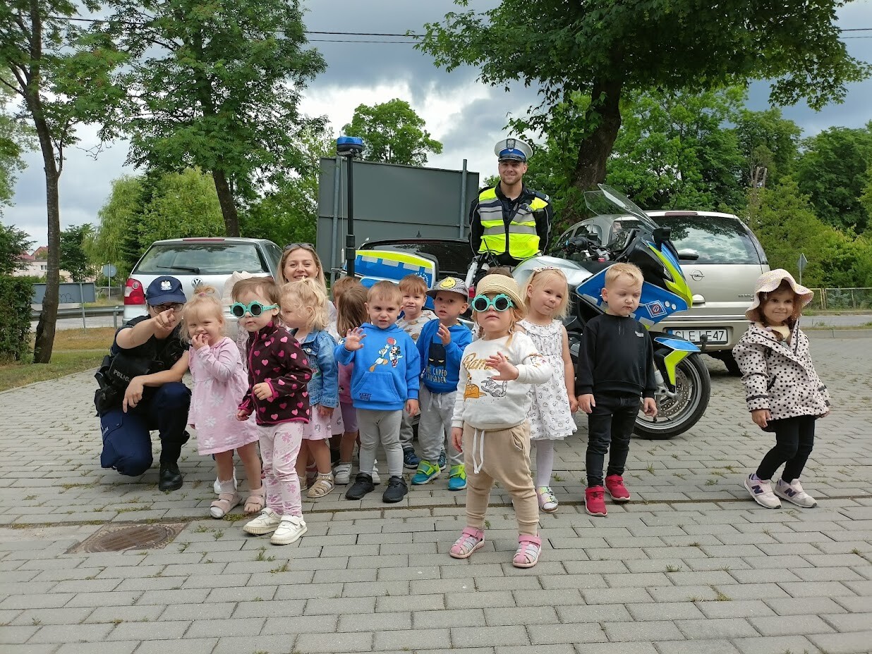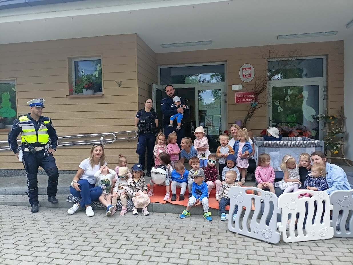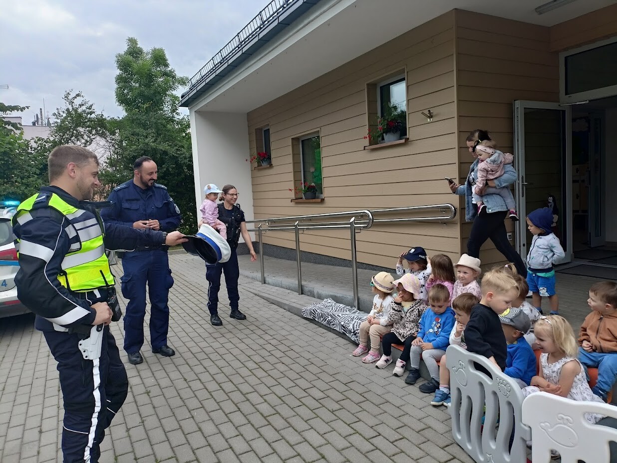 Dzięki uprzejmości Pani Julii Suleckiej - mamie Felicji dzieci ze żłobka miały możliwość spotkania się z funkcjonariuszami Policji z Lęborka. Tematem spotkania było "Bezpiecznie podczas wakacji". Dzieci zapoznały się z pojazdami takimi jak motocykl oraz wóz policyjny, rozpoznawały sygnały świetlne oraz ich kolorystykę.
