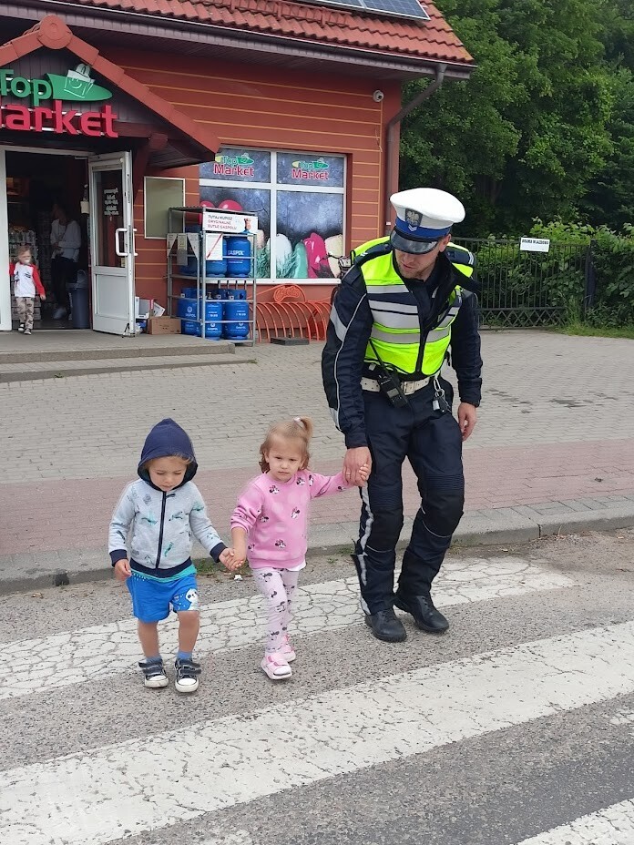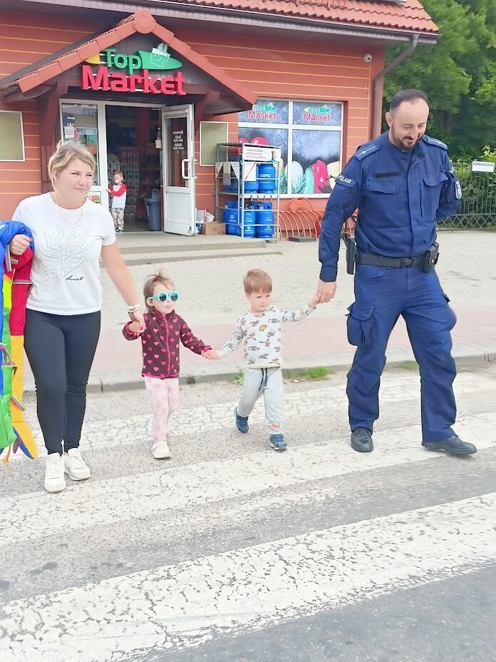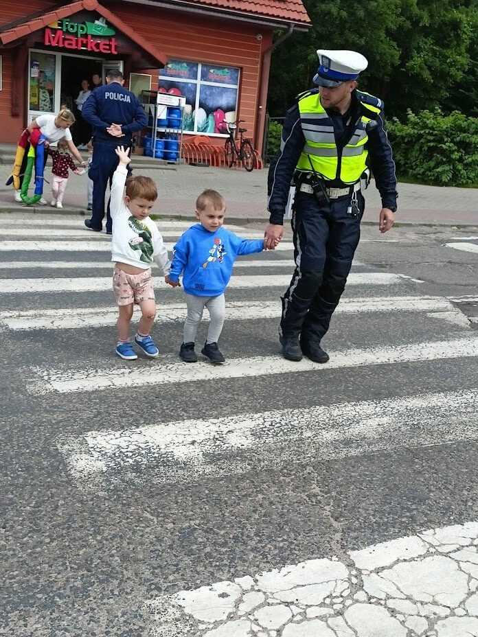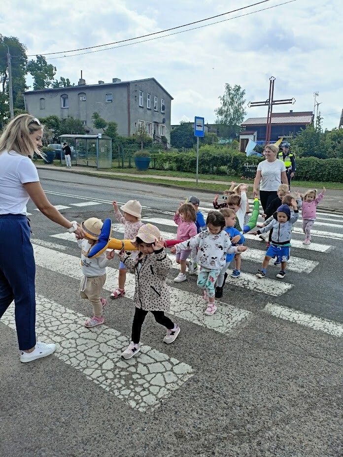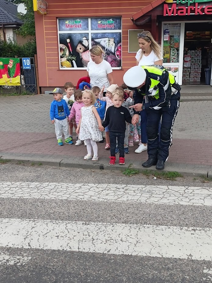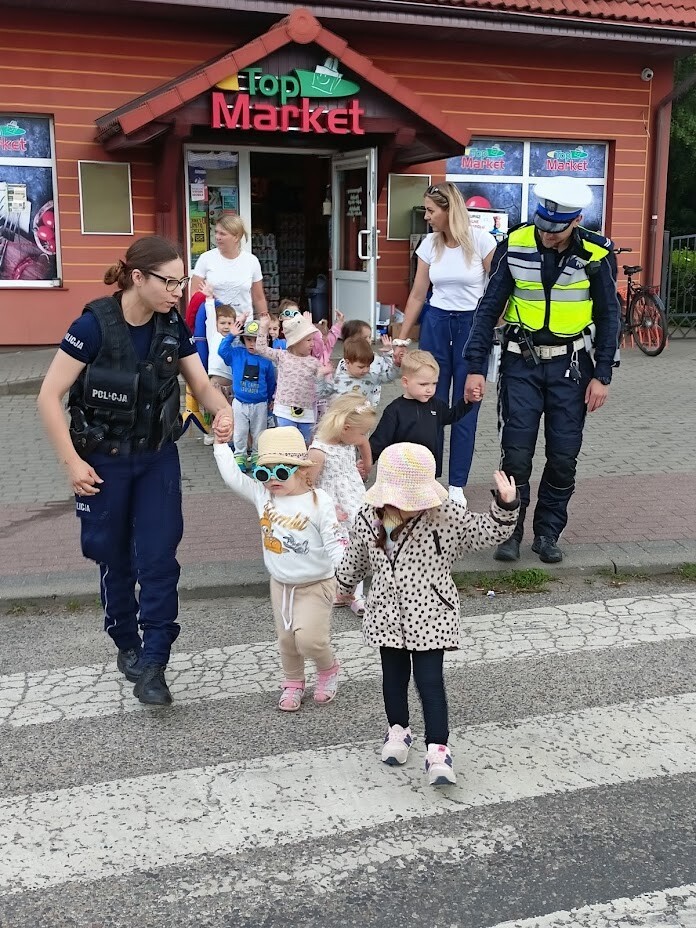 Starsze dzieci wybrały się pod eskortą funkcjonariuszy na pobliskie przejście dla pieszych, gdzie utrwalone zostały zasady prawidłowego poruszania się na zebrze.