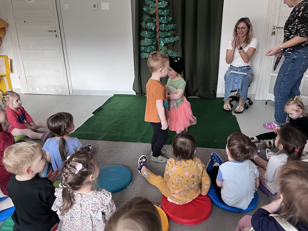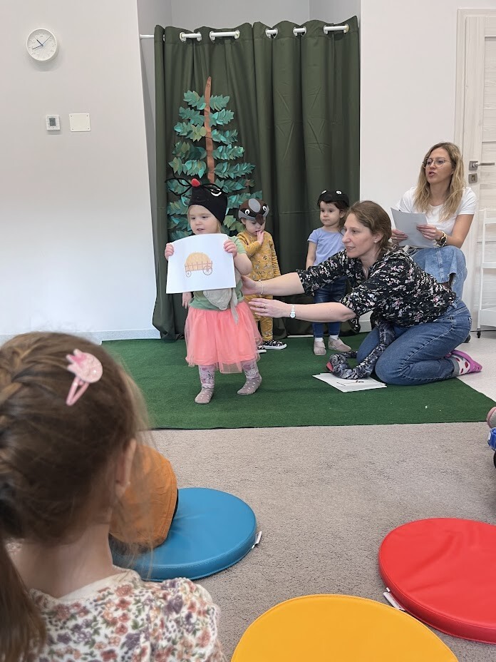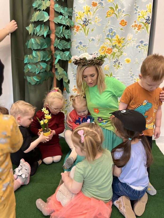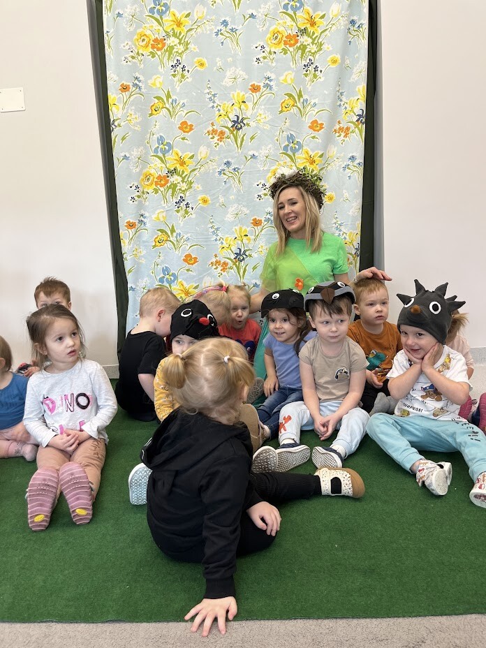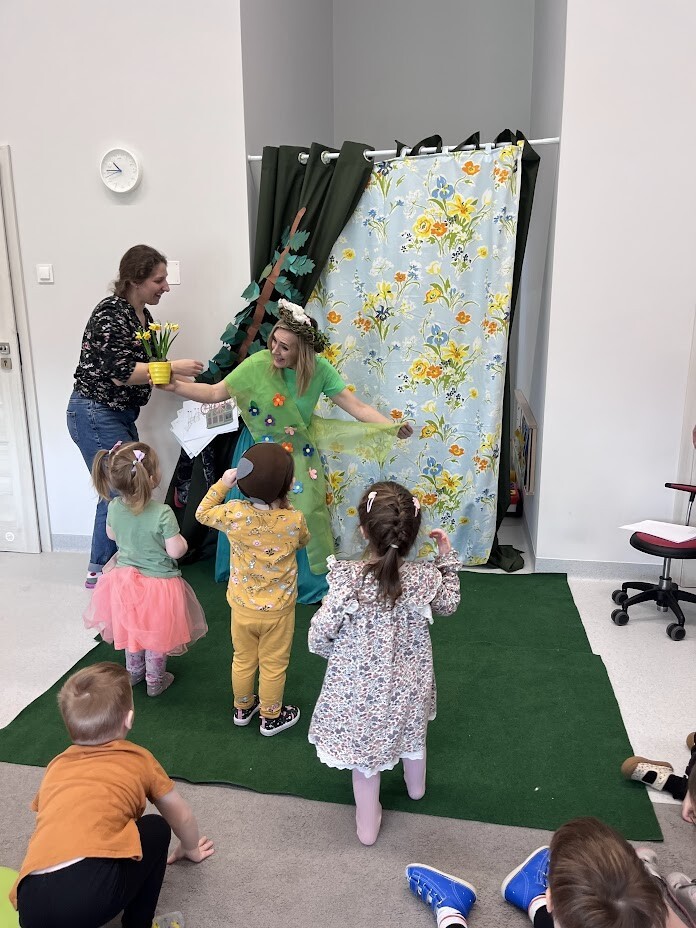 Teatrzyk w wykonaniu dzieci i cioć "Ach ta wiosna". Podczas kolejnych zajęć dodatkowych dzieci miały możliwość wcielenia się w postaci zwierząt biorących udział w przedstawieniu. Teatr w żywym aktorem to wspaniała forma teatralna, która zaktywizowała chętne dzieci do twórczego działania.