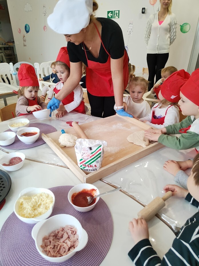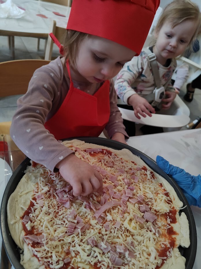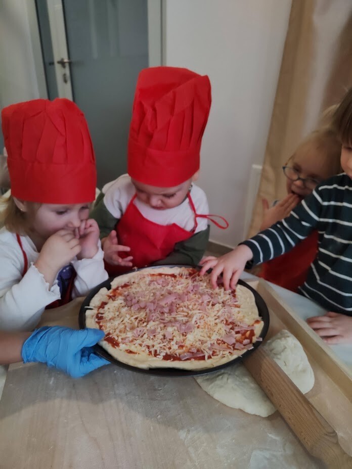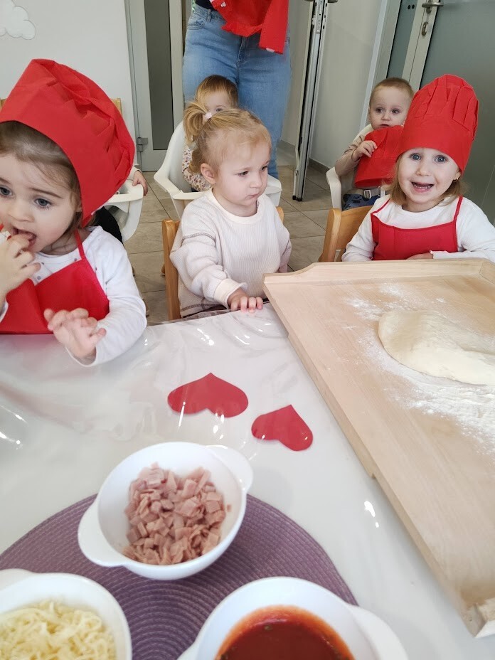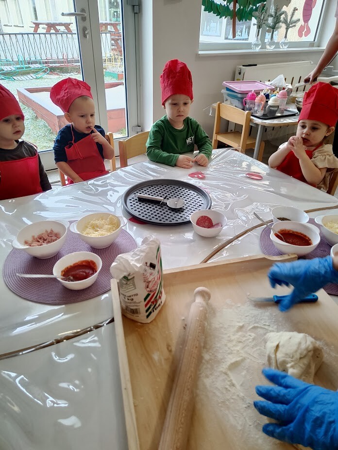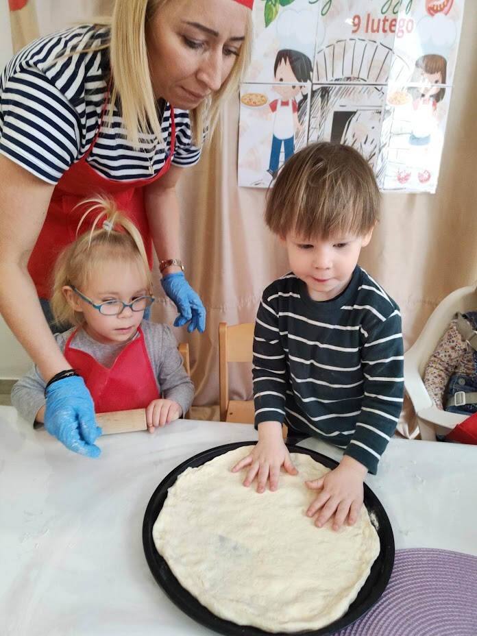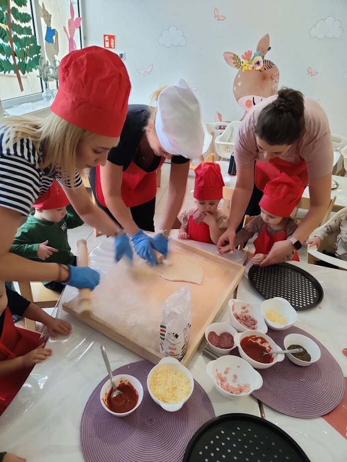 Z okazji obchodzonego 9 lutego Międzynarodowego Dnia Pizzy żłobkowicze podczas dodatkowych zajęć kulinarnych przeniosły się do pizzerii. Zajęcia miały na celu zapoznanie dzieci z zawodem kucharza oraz wyglądem, wyposażeniem pizzerii, a także sposobem przygotowania pizzy. Podczas warsztatów kulinarnych dzieci dowiedziały się skąd pochodzi tak lubiane przez wszystkich danie, poznały etapy wykonania pizzy, dowiedziały się jakie składniki są potrzebne do jej wykonania, a na zakończenie w strojach kucharskich samodzielnie przygotowały pizzę. Żłobkowicze wałkowały ciasto, smarowały sosem, komponowały ulubione dodatki. Warsztaty sprawiły dzieciom wiele radości, a samodzielnie przygotowana pizza smakowała wyśmienicie.