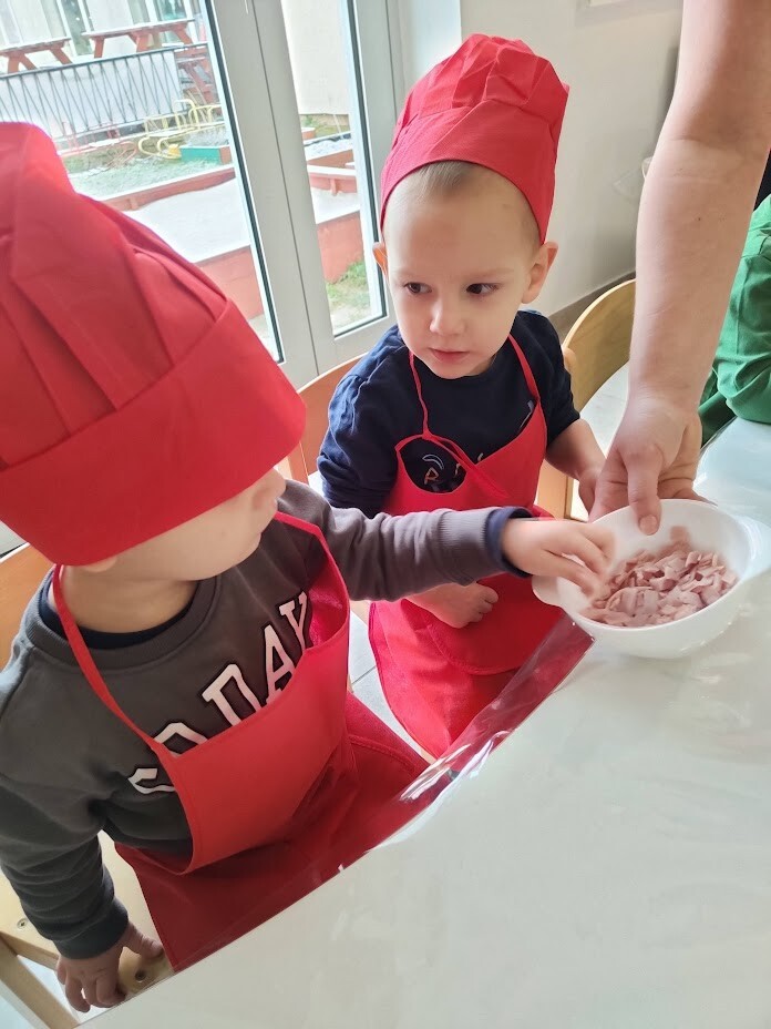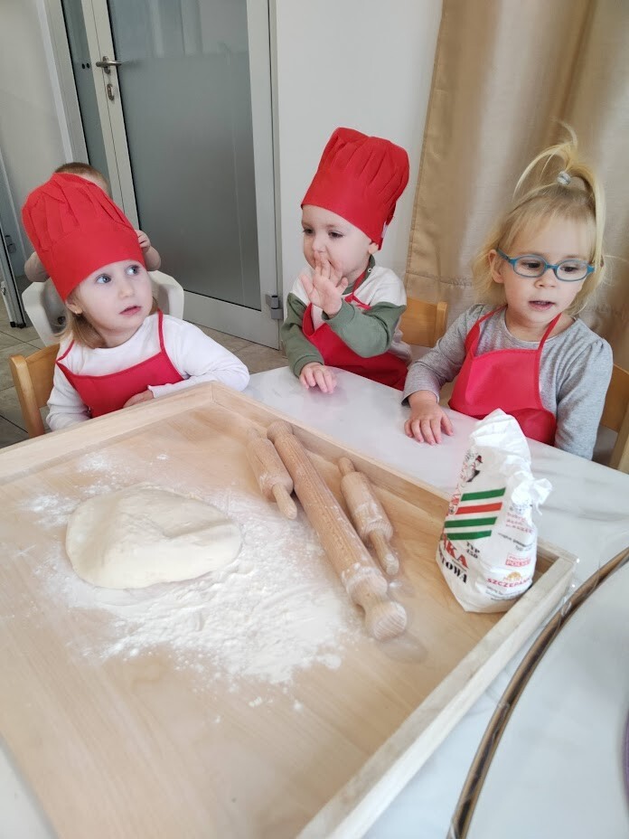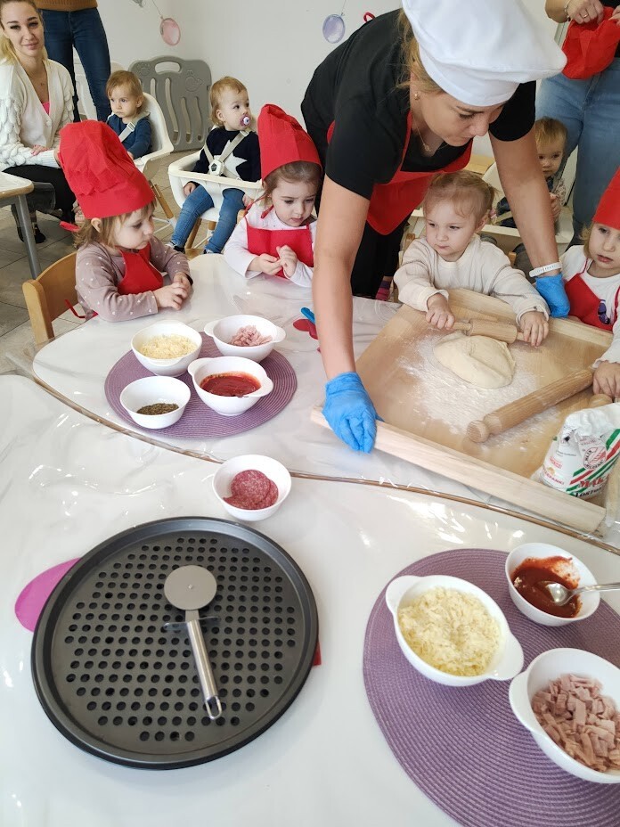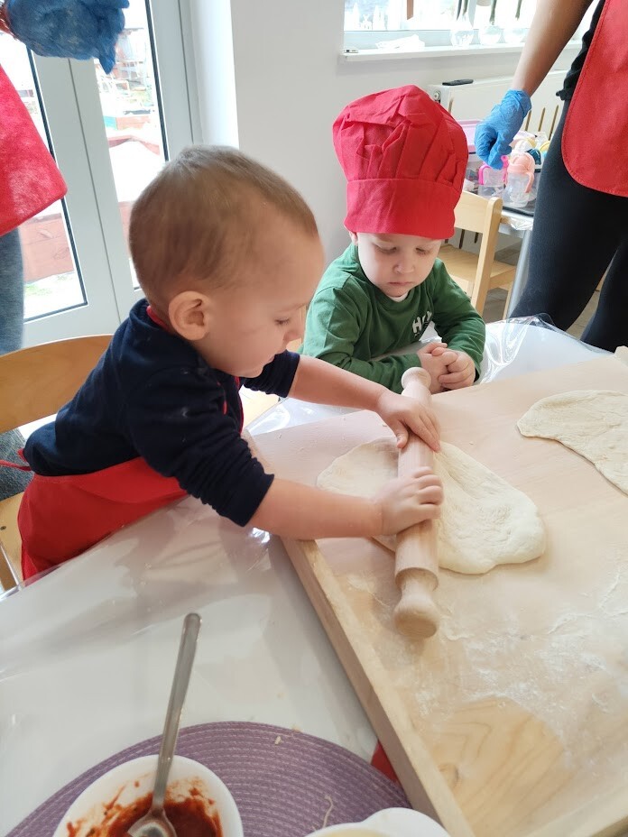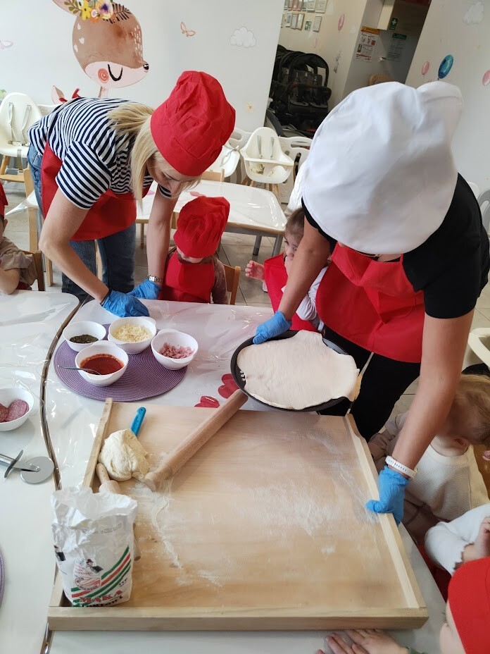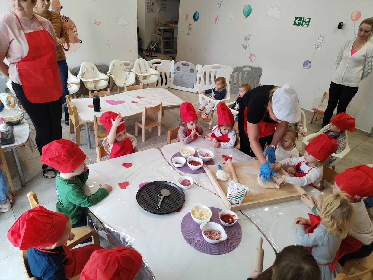 Z okazji obchodzonego 9 lutego Międzynarodowego Dnia Pizzy żłobkowicze podczas dodatkowych zajęć kulinarnych przeniosły się do pizzerii. Zajęcia miały na celu zapoznanie dzieci z zawodem kucharza oraz wyglądem, wyposażeniem pizzerii, a także sposobem przygotowania pizzy. Podczas warsztatów kulinarnych dzieci dowiedziały się skąd pochodzi tak lubiane przez wszystkich danie, poznały etapy wykonania pizzy, dowiedziały się jakie składniki są potrzebne do jej wykonania, a na zakończenie w strojach kucharskich samodzielnie przygotowały pizzę. Żłobkowicze wałkowały ciasto, smarowały sosem, komponowały ulubione dodatki. Warsztaty sprawiły dzieciom wiele radości, a samodzielnie przygotowana pizza smakowała wyśmienicie.