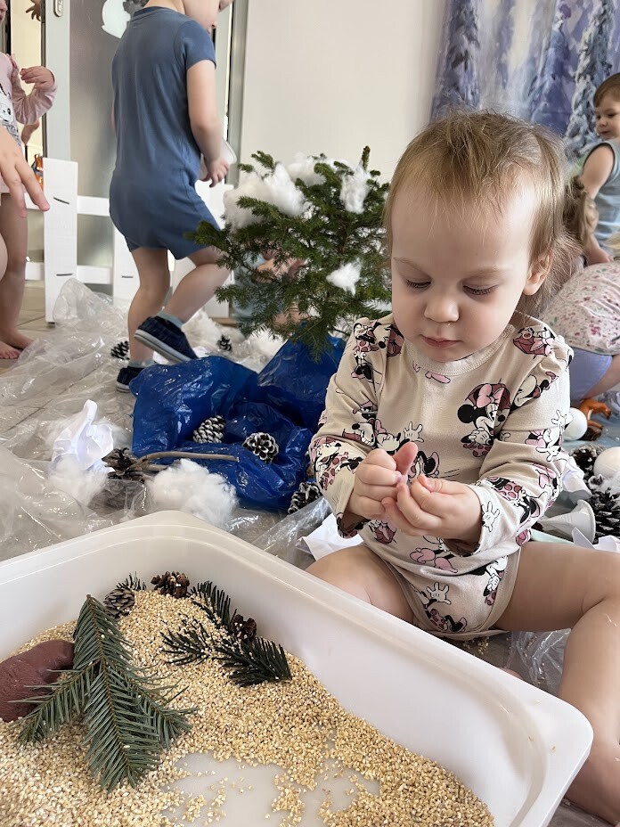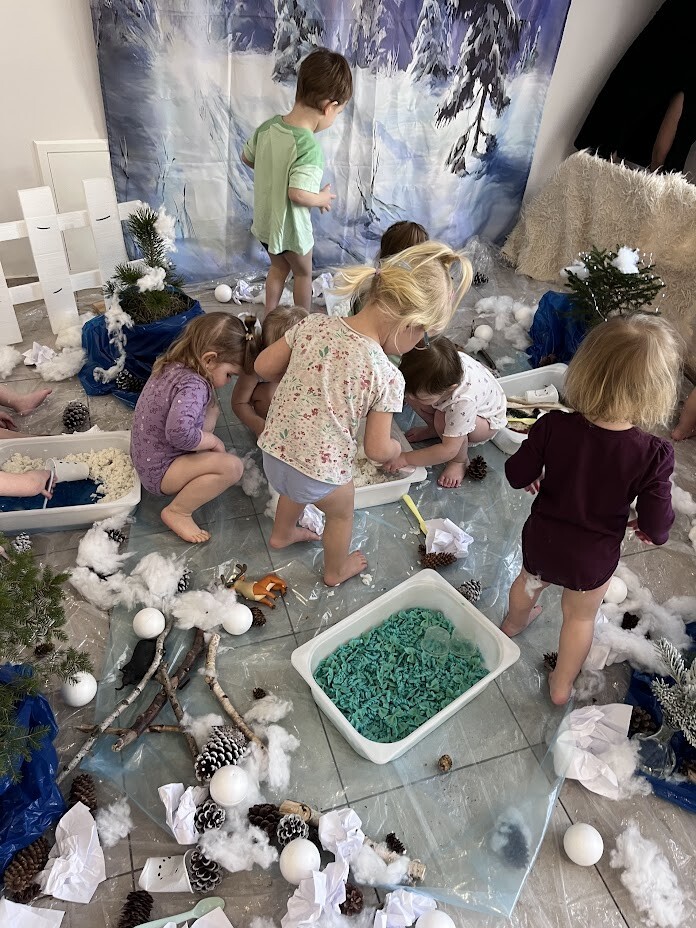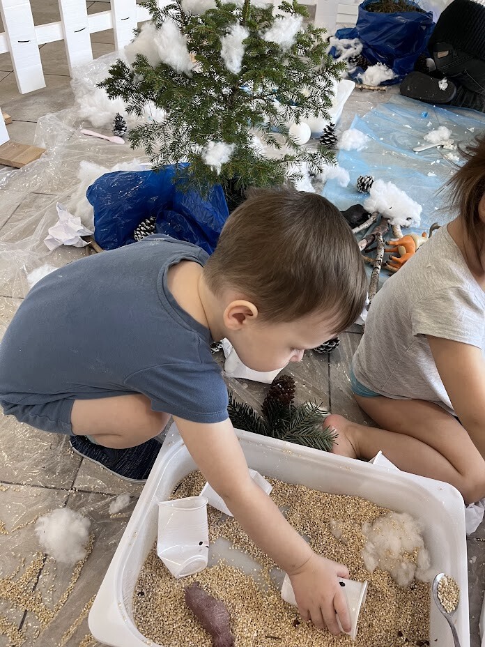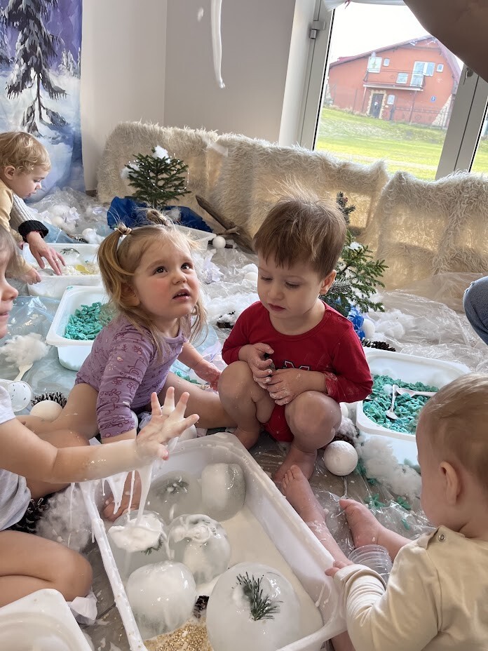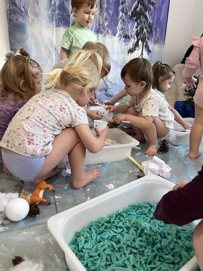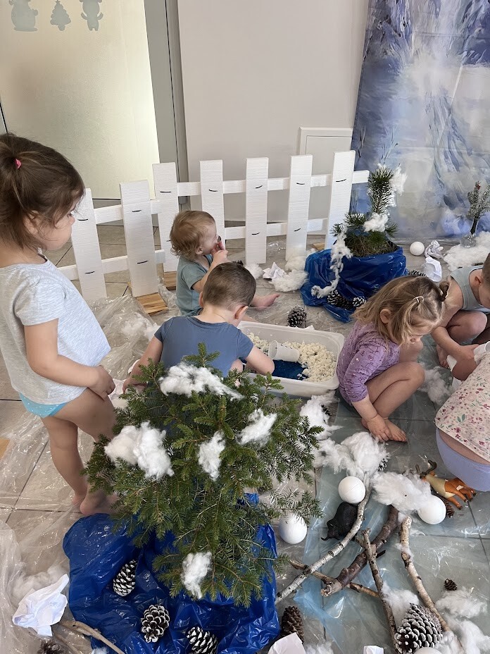 Co to była za rozkosz sensoryczna. Bogactwo kolorów, faktur, smaków, naturalnego materiału przyrodniczego oraz doznań muzycznych przeniosła wszystkich żłobkowiczów do zimowego lasu. Chętnych do zabawy nie brakowało. Tafla wody wykonana z niebieskiej galaretki, pokryta poduchą śnieżną wykonaną z białego ryżu - nie tylko wyglądała apetycznie ale i tak smakowała. Sztuczny śnieg wykonany z mąki ziemniaczanej okazał się niezwykle sypki a po dodaniu większej ilości wody zachowywał się jak błoto, odróżniając się tylko od niego kolorem. Zielony makaron znalazł także swoich ulubieńców, którzy nie odstępowali go na krok.