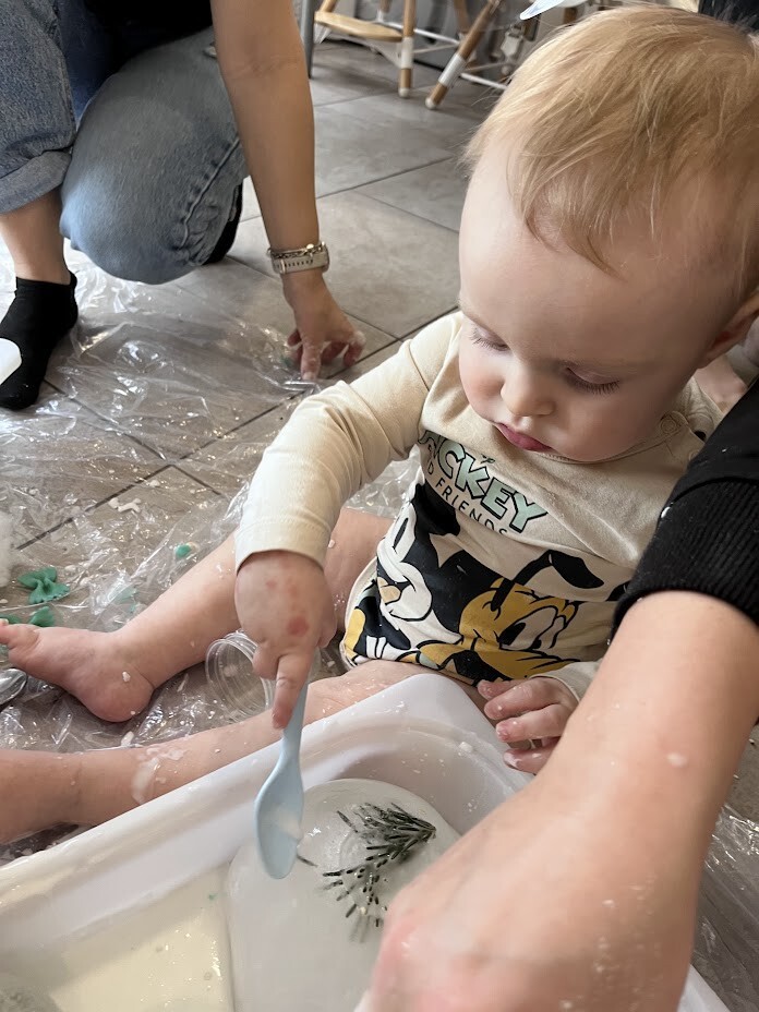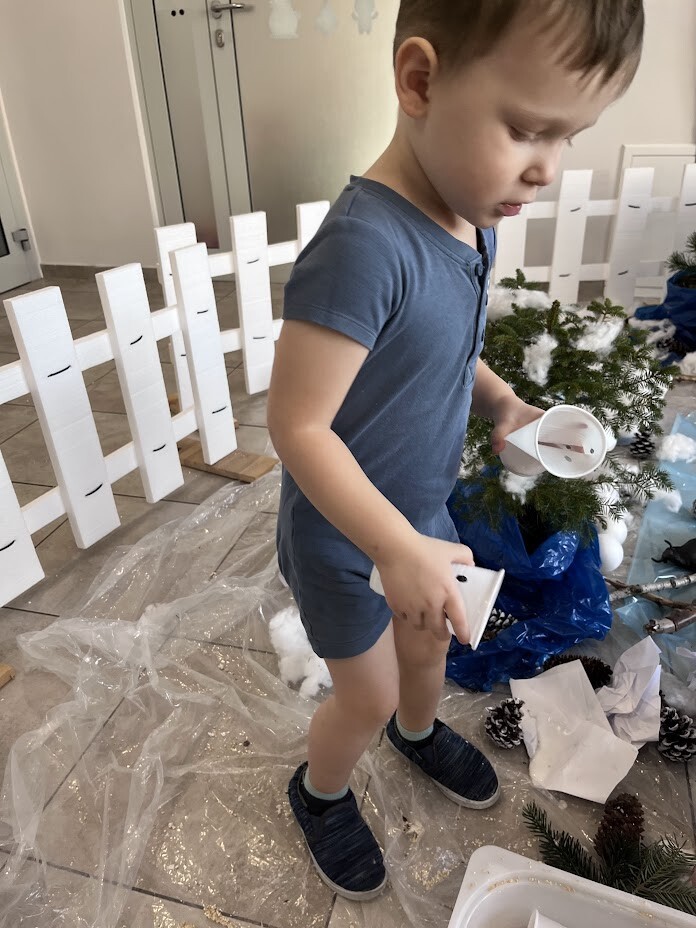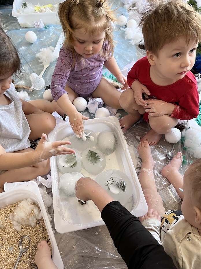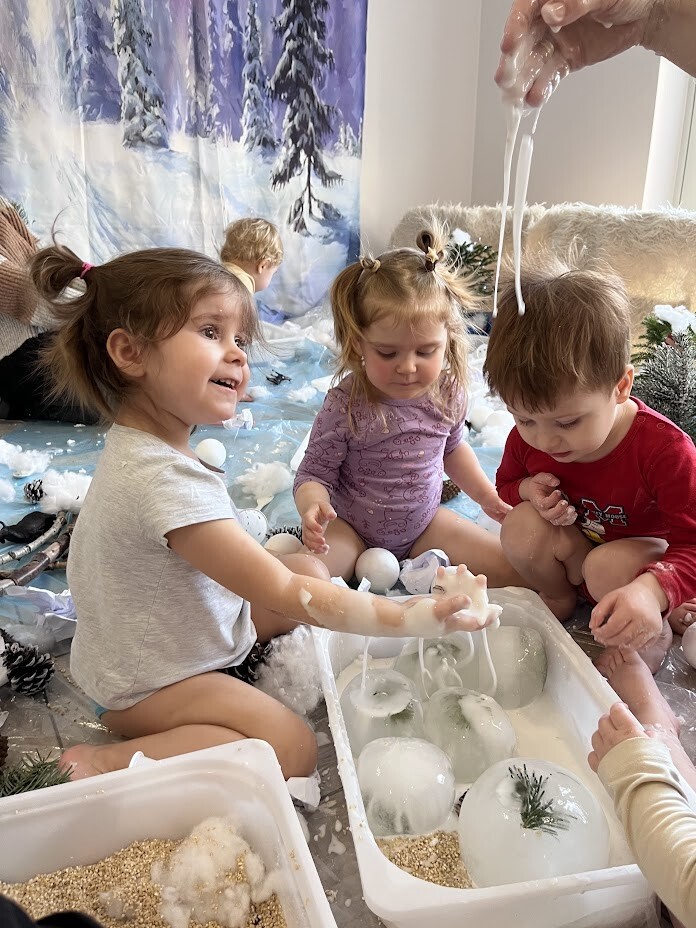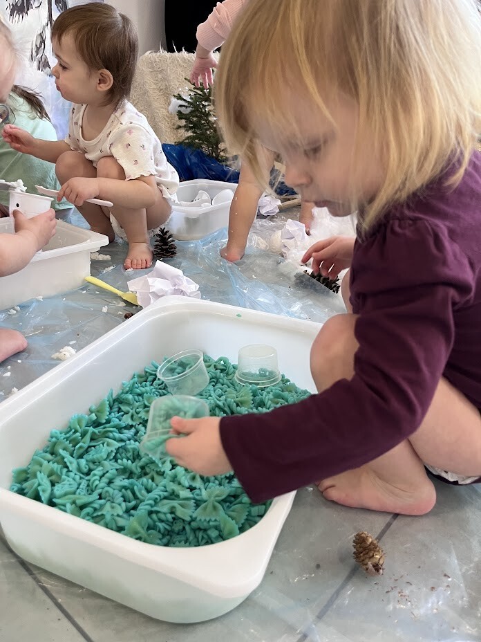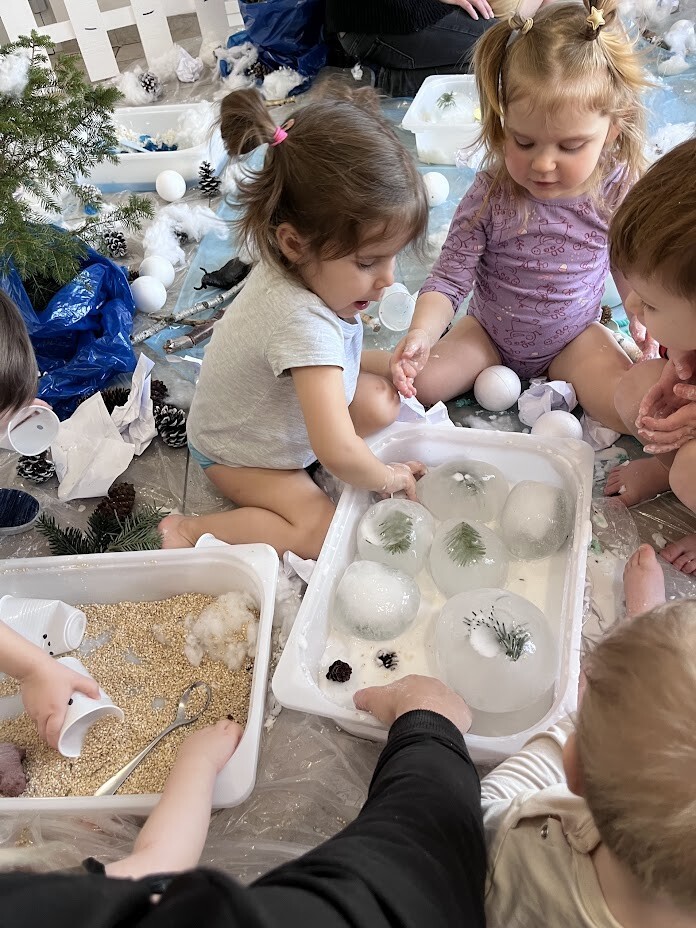 Co to była za rozkosz sensoryczna. Bogactwo kolorów, faktur, smaków, naturalnego materiału przyrodniczego oraz doznań muzycznych przeniosła wszystkich żłobkowiczów do zimowego lasu. Chętnych do zabawy nie brakowało. Tafla wody wykonana z niebieskiej galaretki, pokryta poduchą śnieżną wykonaną z białego ryżu - nie tylko wyglądała apetycznie ale i tak smakowała. Sztuczny śnieg wykonany z mąki ziemniaczanej okazał się niezwykle sypki a po dodaniu większej ilości wody zachowywał się jak błoto, odróżniając się tylko od niego kolorem. Zielony makaron znalazł także swoich ulubieńców, którzy nie odstępowali go na krok.