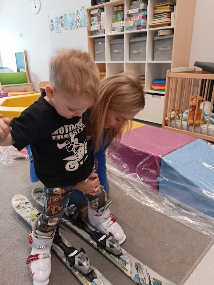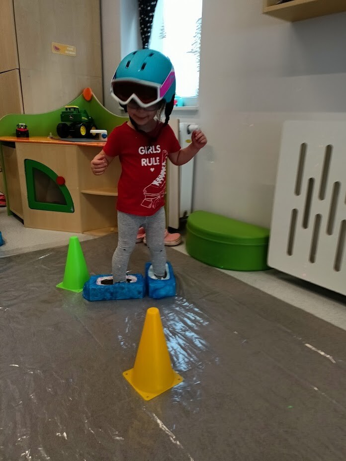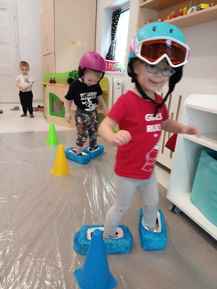Zabawy sportowe z wykorzystaniem różnych rekwizytów odzwierciedlające sporty zimowe takie jak: narciarstwo, łyżwiarstwo oraz inne zabawy na śniegu.