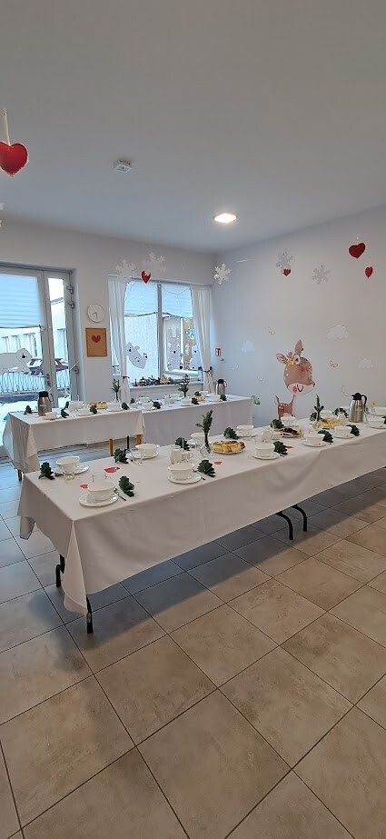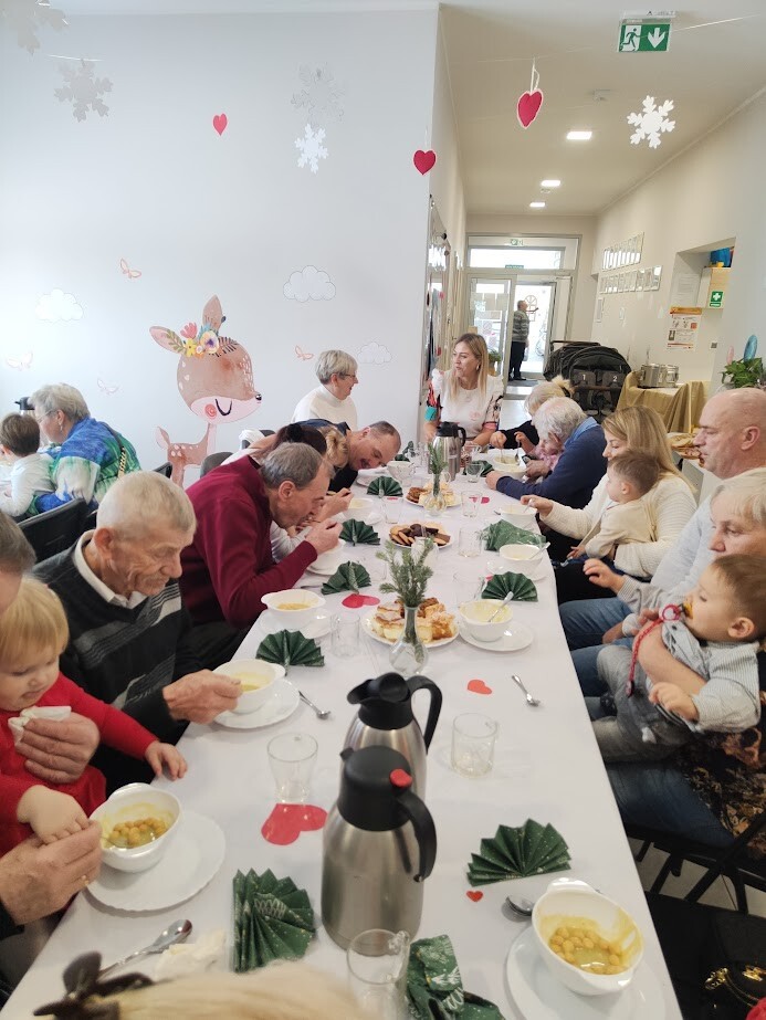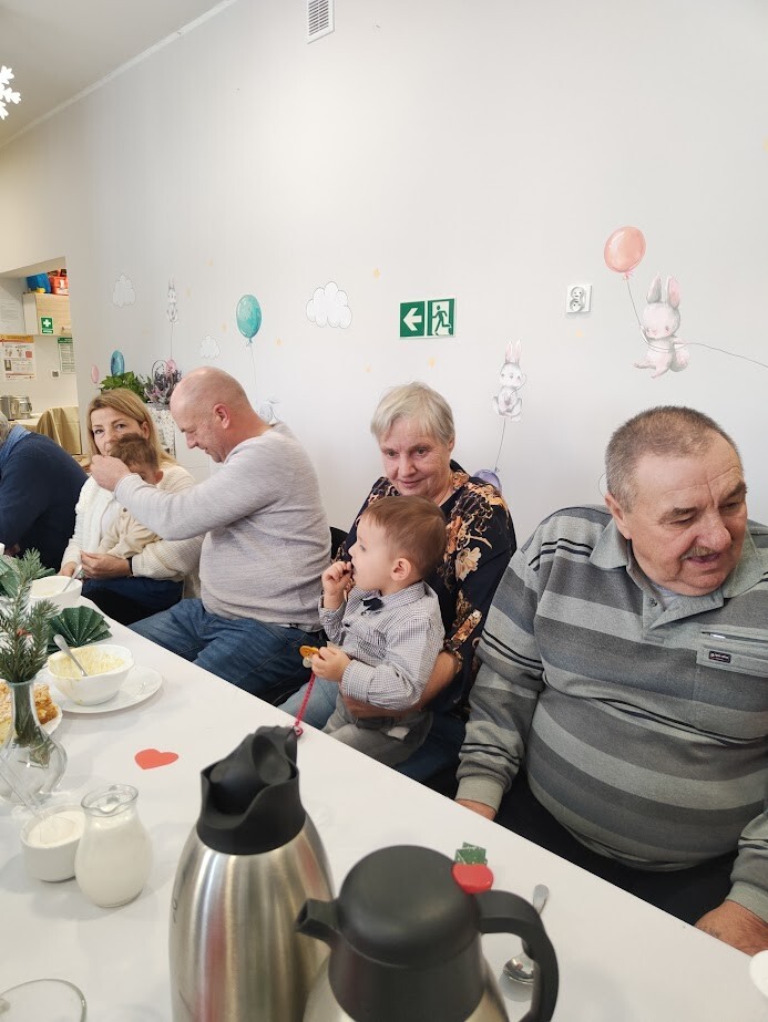 Po części warsztatowej zaproszono Babcie i Dziadków na poczęstunek w postaci zupy brokułowej przygotowanej przez członkini Klubu Seniora w Wicku - Panią Bożenę Klinkusz (wieloletnią kucharkę). Rodzice przygotowali przepyszne ciasta, smakołyki oraz napoje. Nie zabrakło kawy i herbaty a przede wszystkim rozmów przy dużym stole.