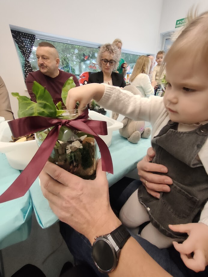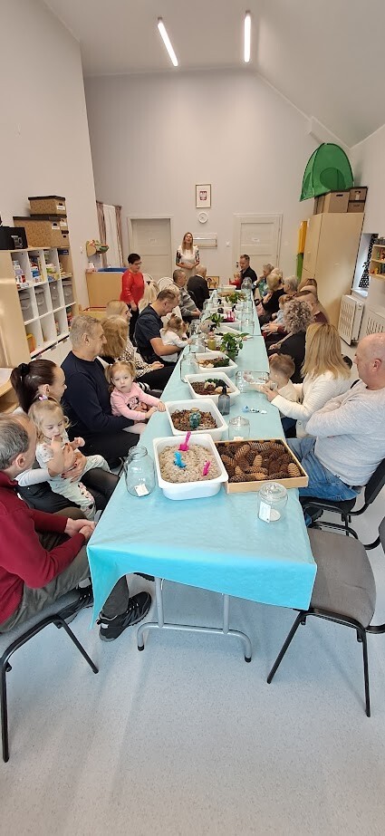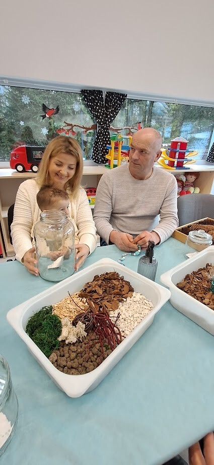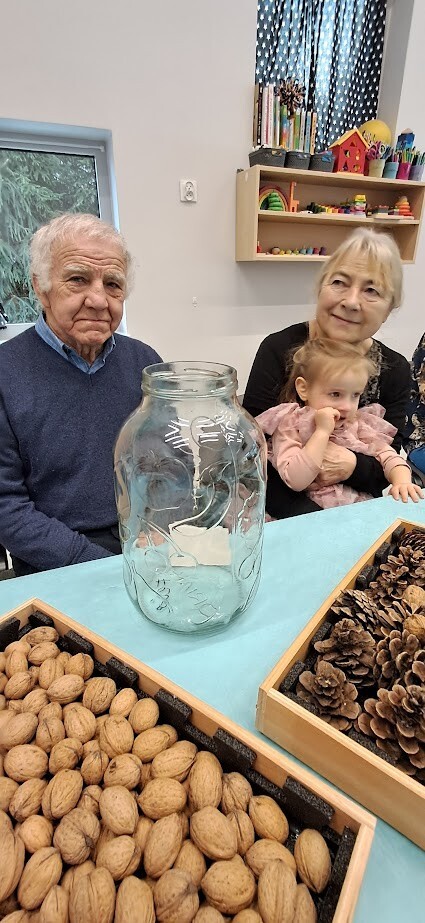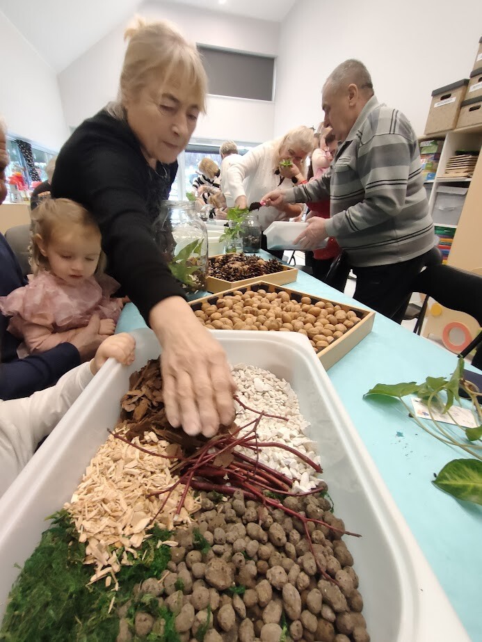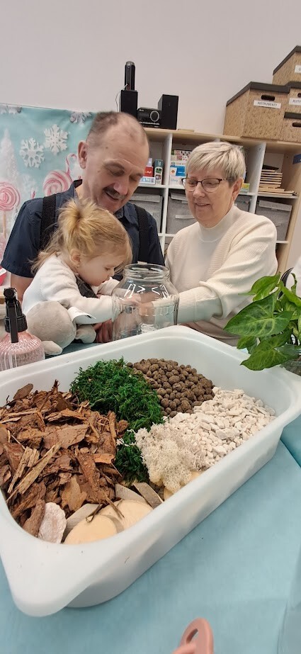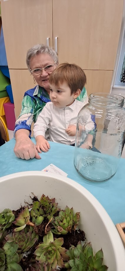 Jak to miło, że zaproszeni goście przybyli tak licznie pukając do bram żłobka. Dzieci z wielką niecierpliwością oczekiwały babuni, dziadziusia, którzy z okazji ich święta przyjęli zaproszenie. Pani dyrektor witała serdecznie gości w holu i zapraszała do strefy warsztatowej, poprzedzonej wykonaniem pamiątkowego zdjęcia z wnukiem/wnuczką w zaaranżowanej foto budce.Zadaniem gości było wspólne wykonanie z dzieckiem "Lasu w szkle/słoiku" z przygotowanych elementów ( ziemia, kamyki, kora, patyki, muszle, sadzonka kwiata itp.). Pomysłowości oraz kreatywności w wykonaniu zadania nie brakowało, każda kompozycja była wyjątkowa, ponieważ wypływała z głębi serca oraz wspólnie spędzonego czasu z dzieckiem.