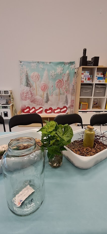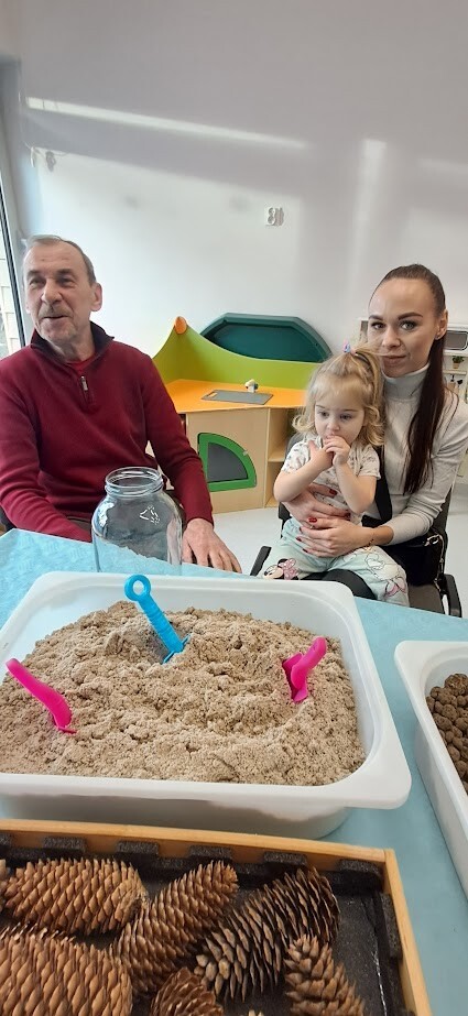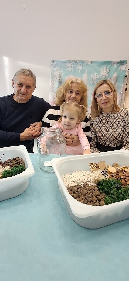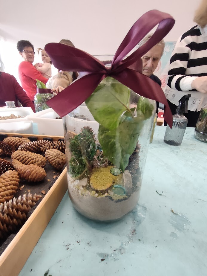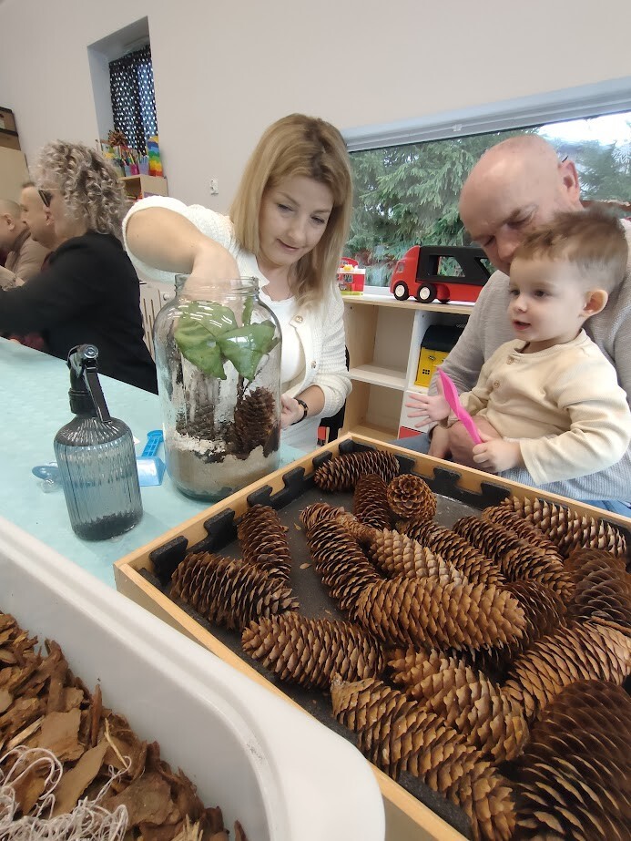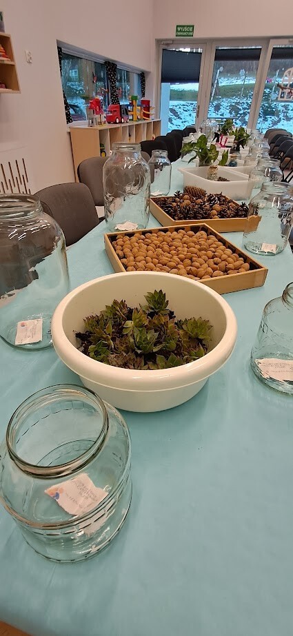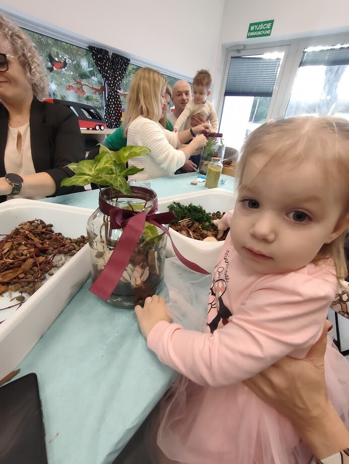 Jak to miło, że zaproszeni goście przybyli tak licznie pukając do bram żłobka. Dzieci z wielką niecierpliwością oczekiwały babuni, dziadziusia, którzy z okazji ich święta przyjęli zaproszenie. Pani dyrektor witała serdecznie gości w holu i zapraszała do strefy warsztatowej, poprzedzonej wykonaniem pamiątkowego zdjęcia z wnukiem/wnuczką w zaaranżowanej foto budce.Zadaniem gości było wspólne wykonanie z dzieckiem "Lasu w szkle/słoiku" z przygotowanych elementów ( ziemia, kamyki, kora, patyki, muszle, sadzonka kwiata itp.). Pomysłowości oraz kreatywności w wykonaniu zadania nie brakowało, każda kompozycja była wyjątkowa, ponieważ wypływała z głębi serca oraz wspólnie spędzonego czasu z dzieckiem.