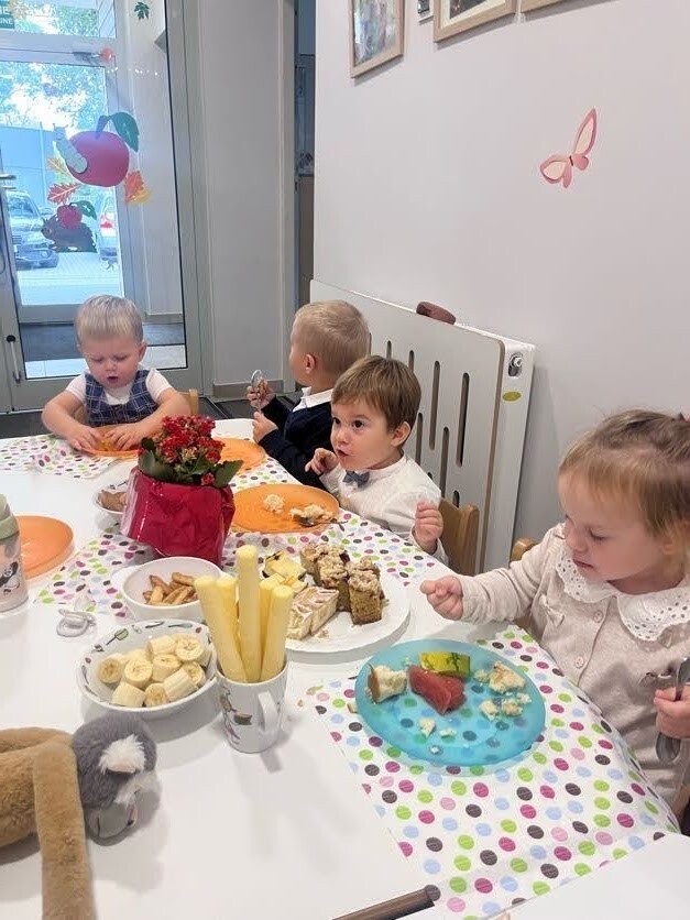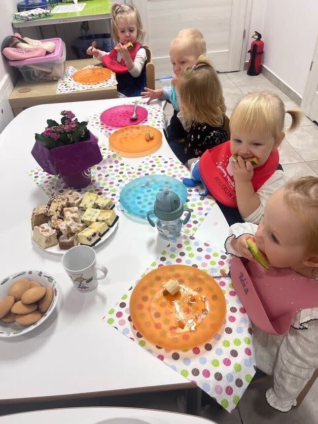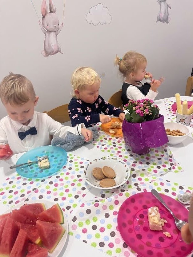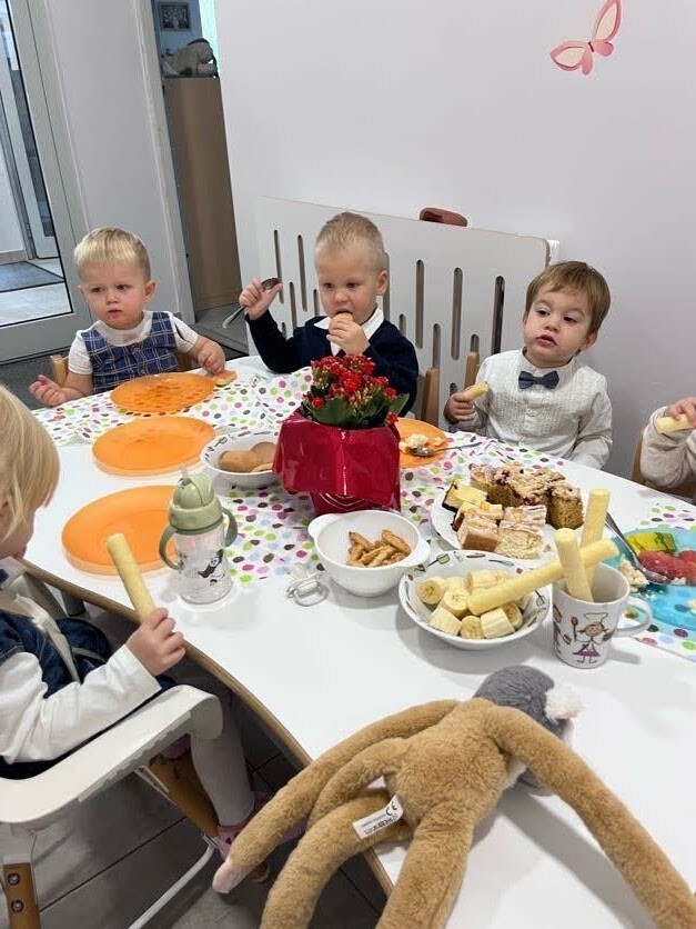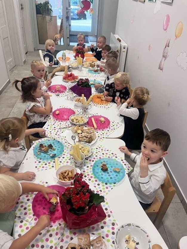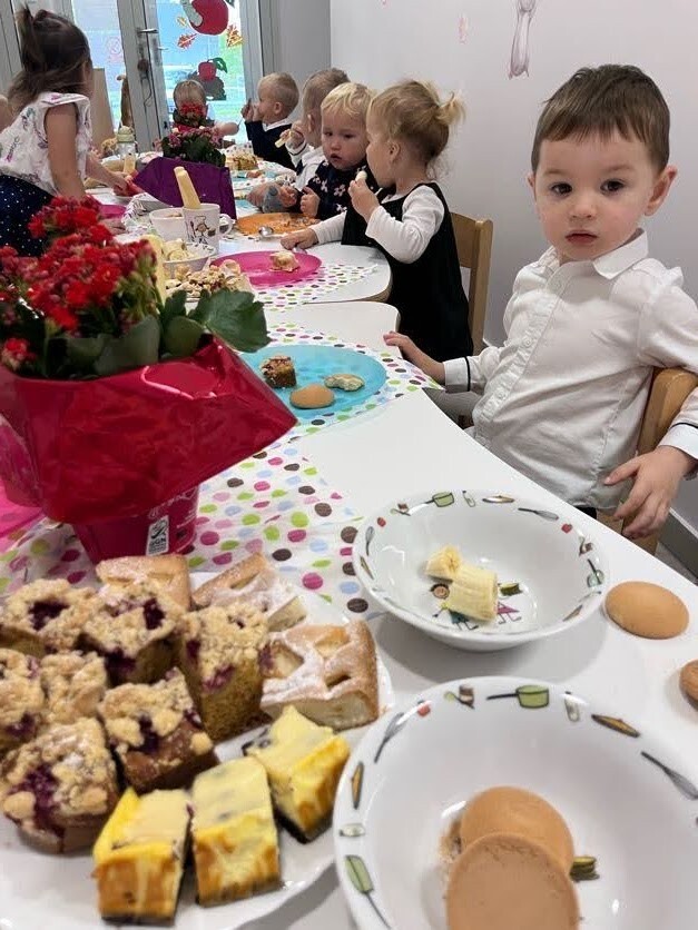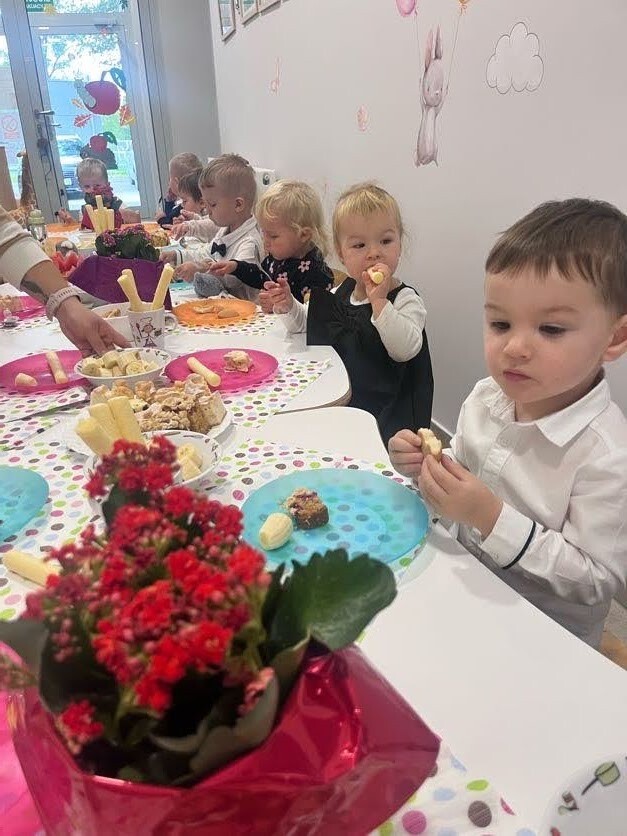 Dzieci ze starszej grupy zilustrowały tanecznie utwór "Ola i liście" , natomiast młodsi żłobkowicze zaprezentowały wyciszanki: "Tu paluszek tam paluszek", "Dwie małe ręce ".klaszczą". Każde dziecko tego dnia okazało ciociom wdzięczność tak jak tylko potrafiło, tuląc, ściskając z radością, przynosząc kwiaty, słodkości czy wypowiadając szeptem słowa: "najlepszego..."