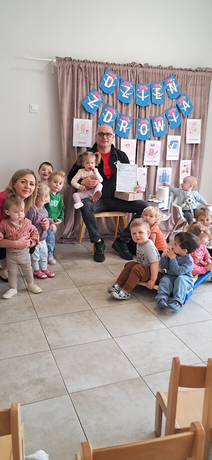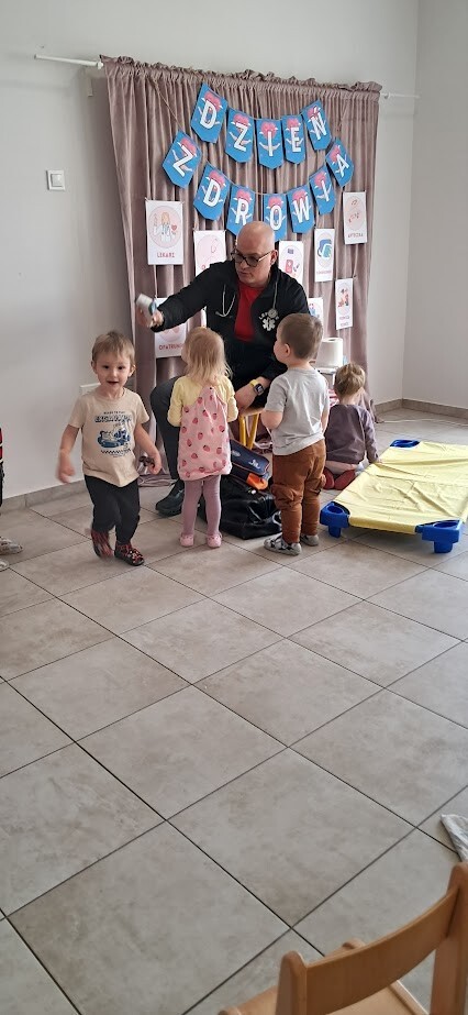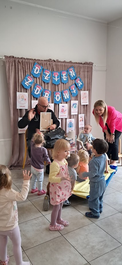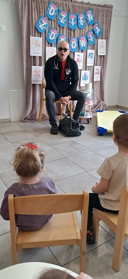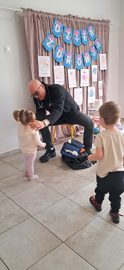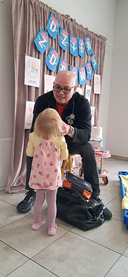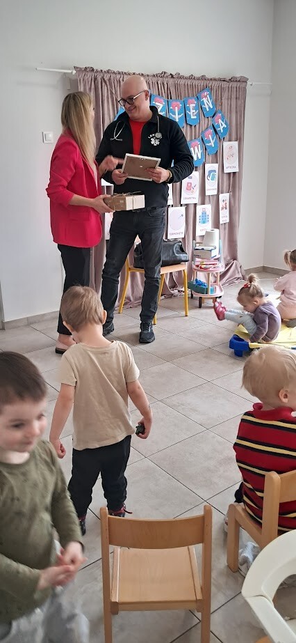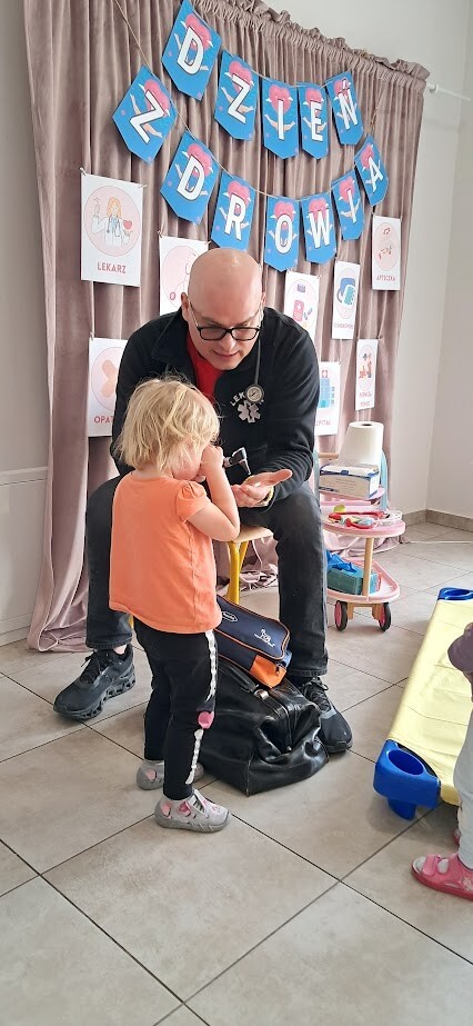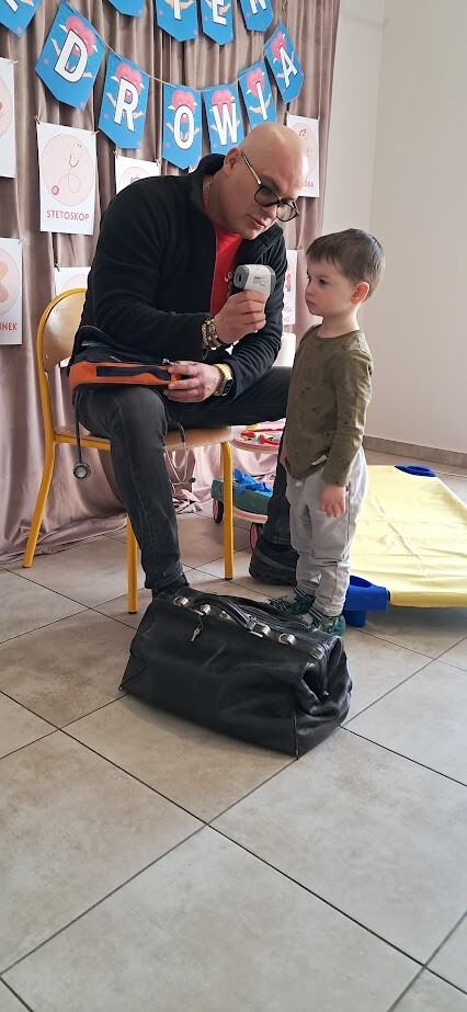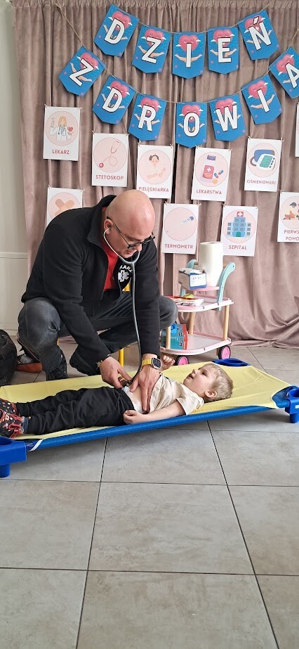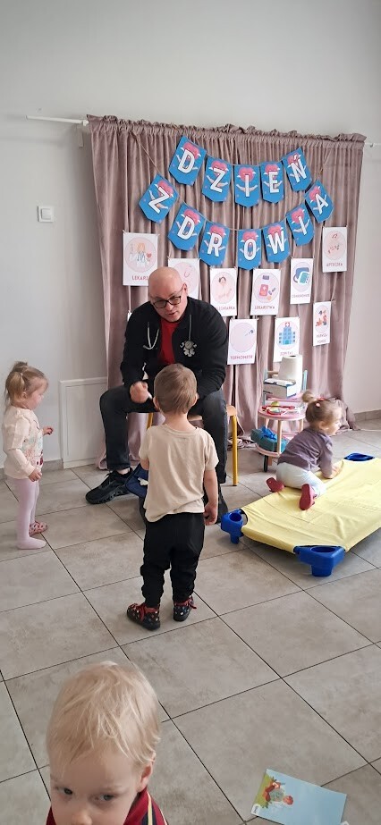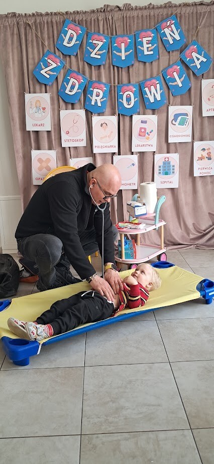 W dniu dzisiejszym z okazji Światowego DNIA SŁUŻY ZDROWIA, naszą placówkę odwiedził lekarz rodzinny Pan Tadeusz Czosnek Kierownik Ośrodka Zdrowia w Wicku, który zapoznał dzieci z zawodem i funkcją lekarza. Podczas spotkania maluchy miały okazję zobaczyć, jak wygląda badanie lekarskie – lekarz mierzył dzieciom temperaturę, a także delikatnie zbadał brzuszek, gardło i uszy. Dzieci z dużym zainteresowaniem obserwowały przebieg badania, oswajając się z obecnością lekarza i sprzętem medycznym. Wizyta miała na celu nie tylko profilaktykę zdrowotną, ale także budowanie poczucia bezpieczeństwa i zaufania wobec osób wykonujących ten ważny zawód.