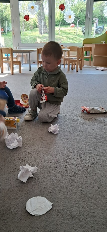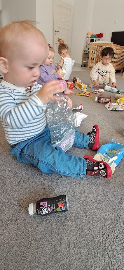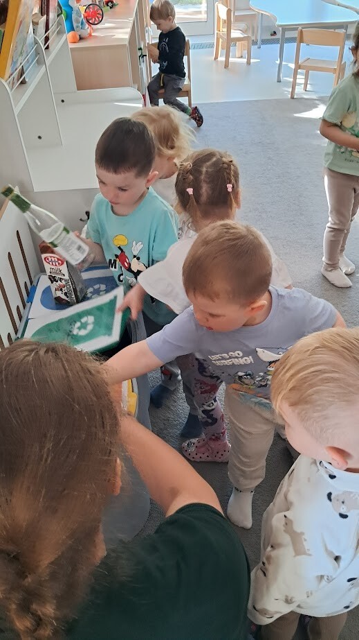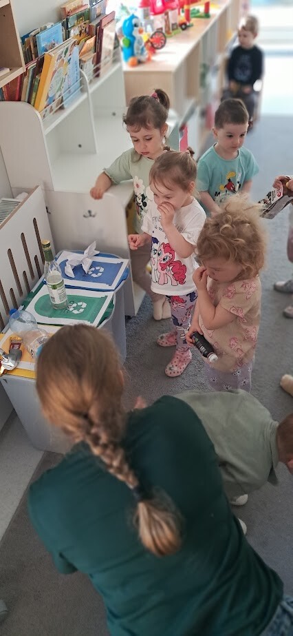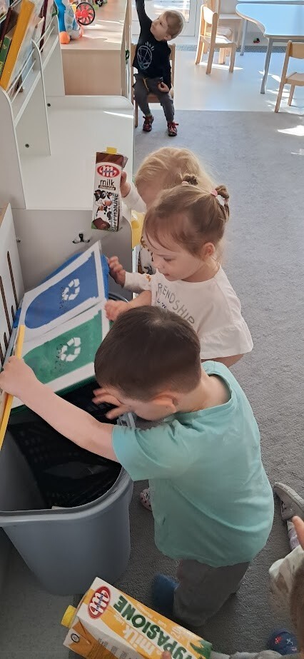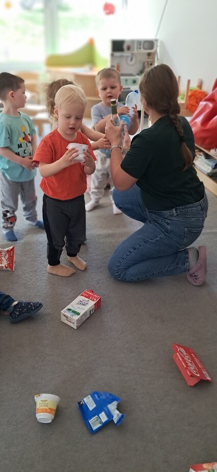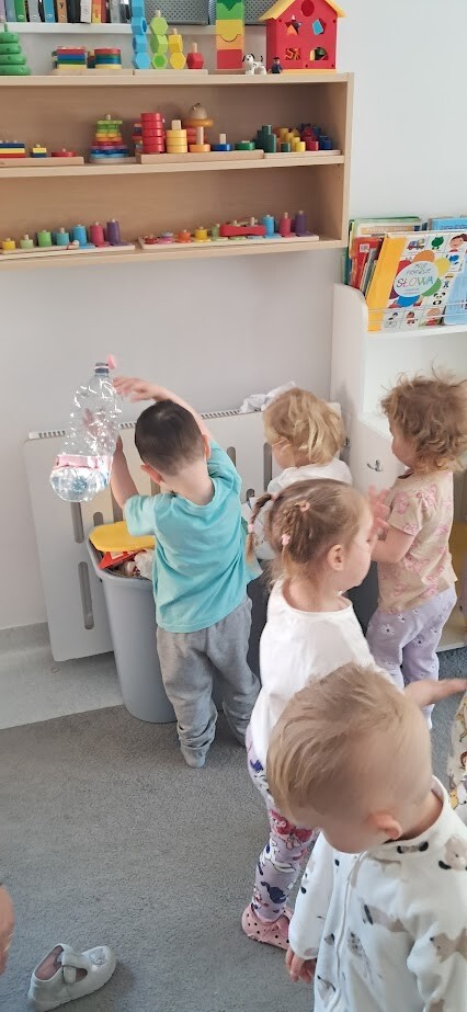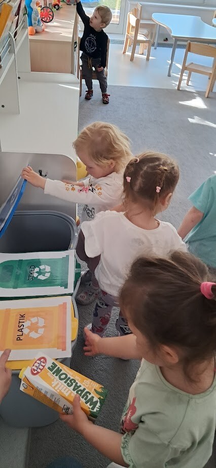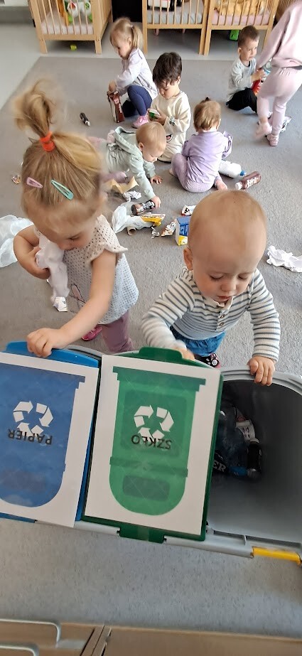 Podczas zabawy i prostych aktywności dzieci poznawały kolory pojemników, dowiadywały się, gdzie wrzucać papier, plastik, czy szkło. Z pomocą opiekunek segregowały odpady a przy okazji uczyły się szacunku do przyrody i odpowiedzialnych nawyków od najmłodszych lat.