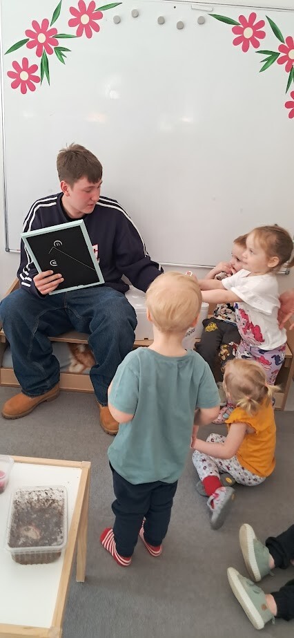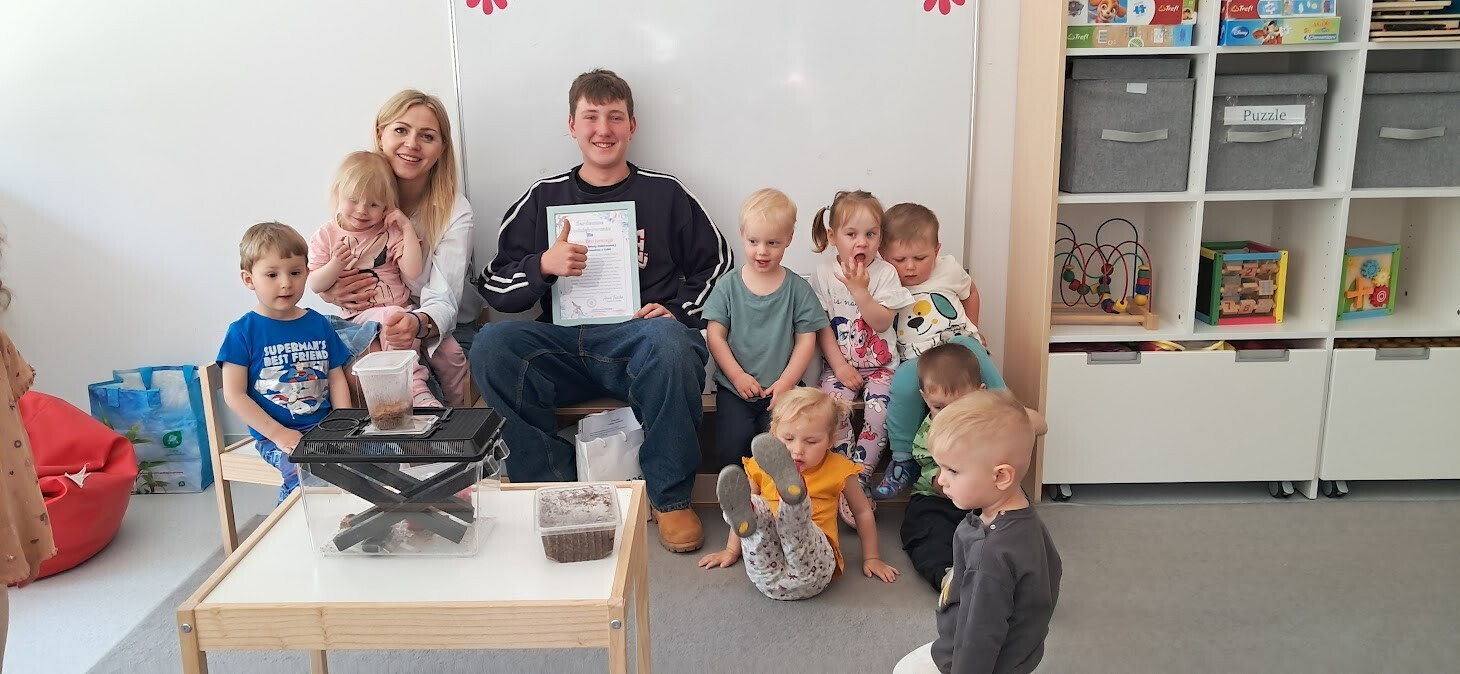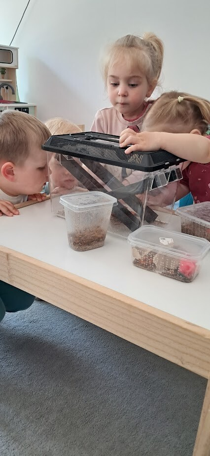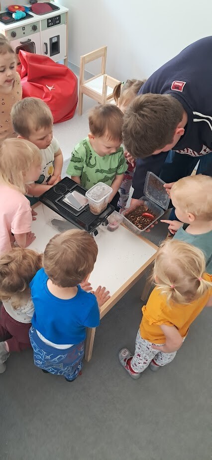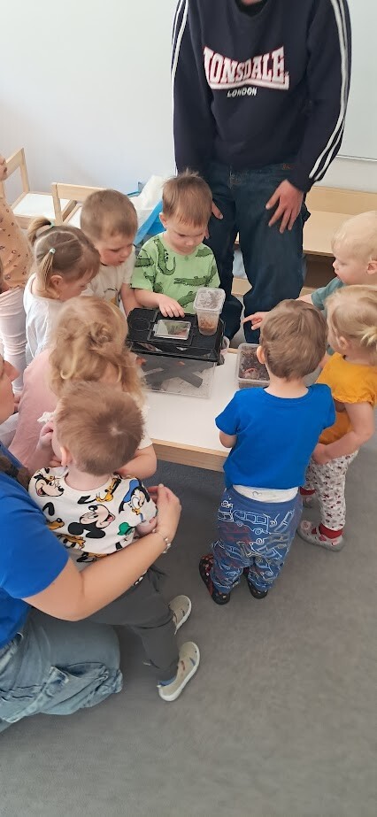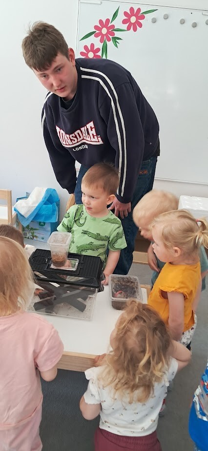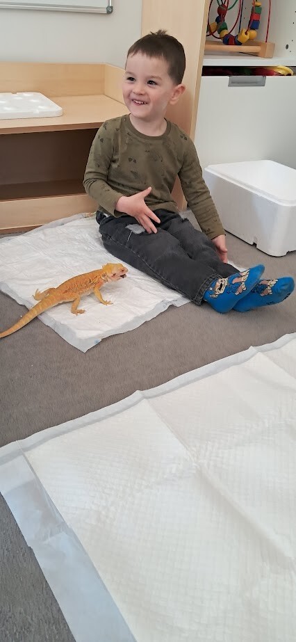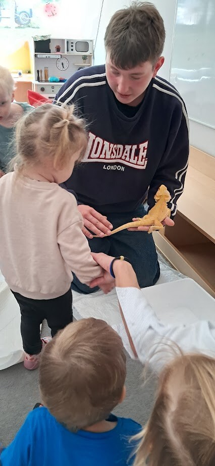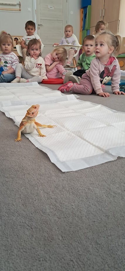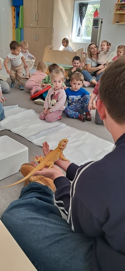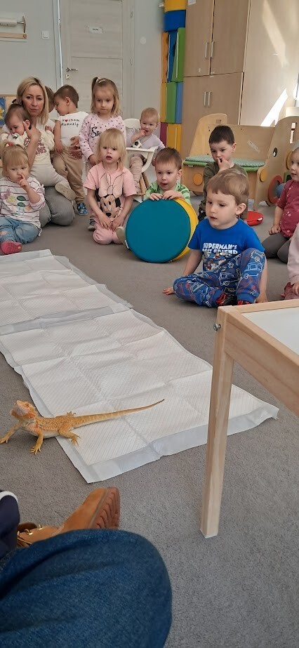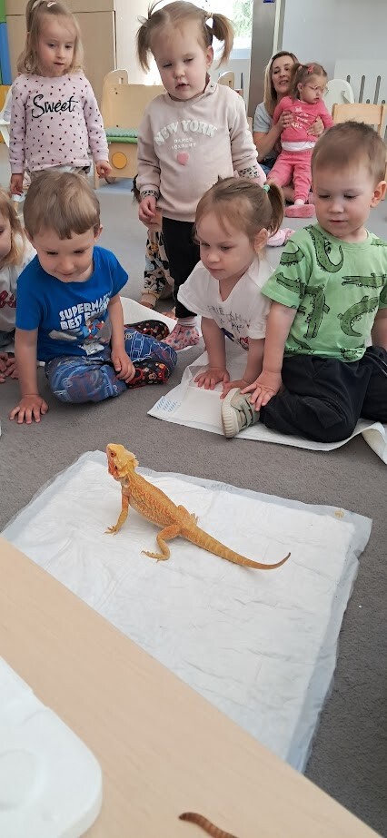Dzięki uprzejmości Stasia Trojańczyk - ucznia klasy 6 b, ze Szkoły Podstawowej w Łebie im. Adama Mickiewicza, dzieci z Gminnego Żłobka w Charbrowie mogły poznać jaszczurkę Agamę Brodatą o imieniu Agata. Od pierwszych minut spotkania można było poczuć pasję, troskę oraz sympatię nastolatka. Staś opowiadał o życiu Agamy, o jej przyzwyczajeniach, sposobie odżywiania, oraz spędzania czasu. Dzieci były niezwykle zainteresowane Agatą, która z uśmiechem na twarzy chętnie pozowała do zdjęć i pod skrzydłami Stasia demonstrowała sposób kosztowania przygotowanych smakołyków w postaci żywych odmian patyczaków i innych robaków.