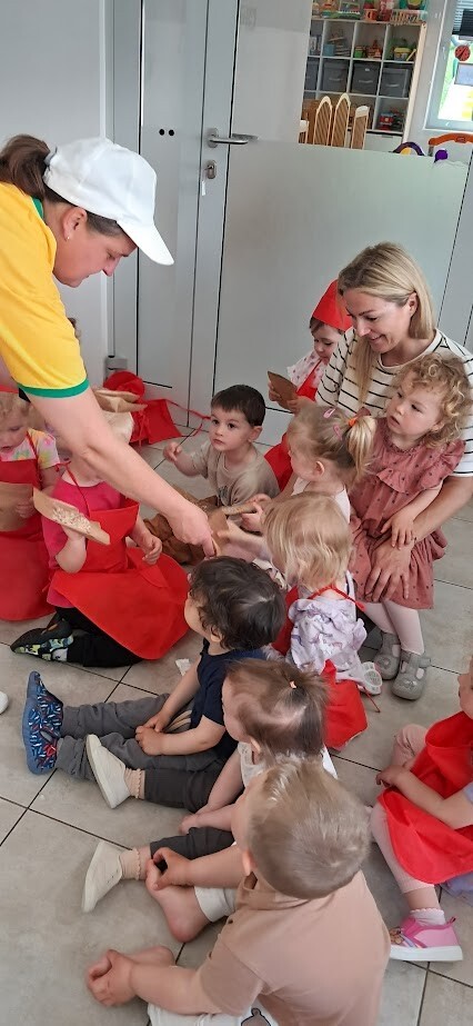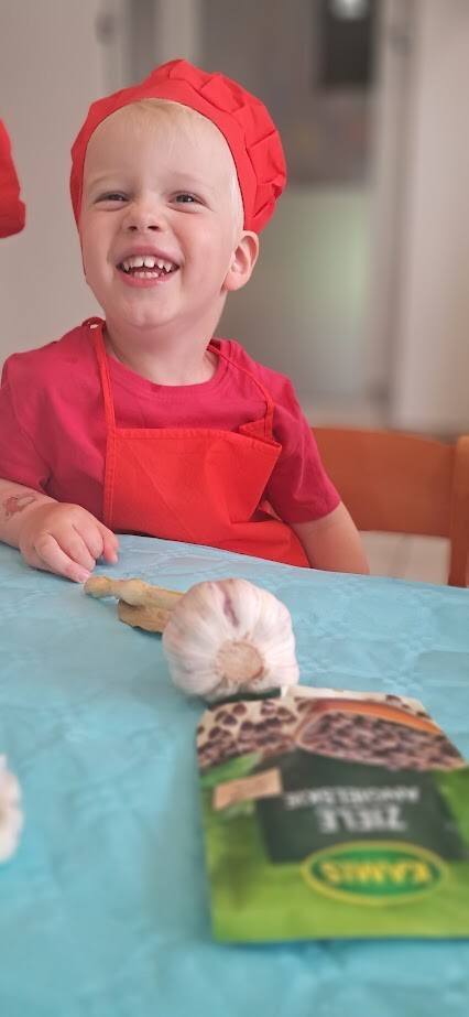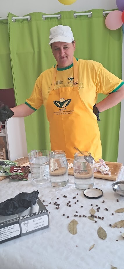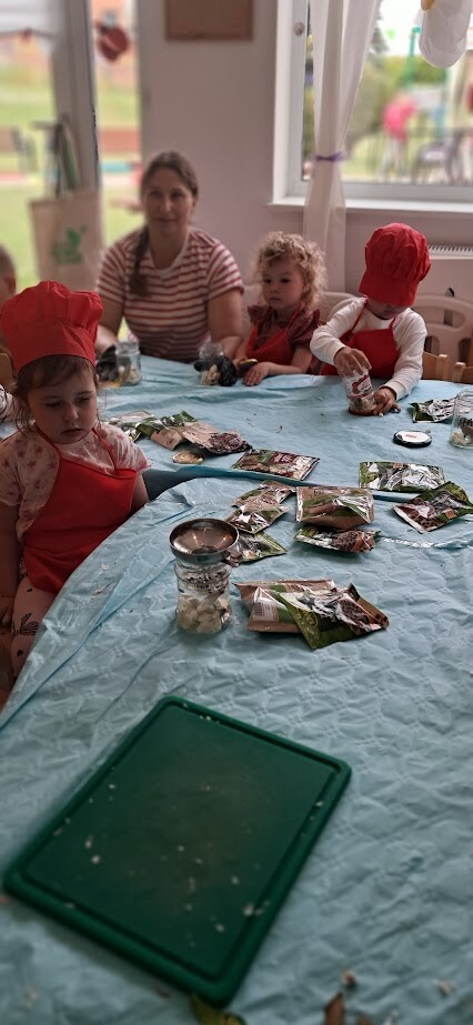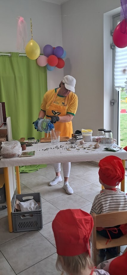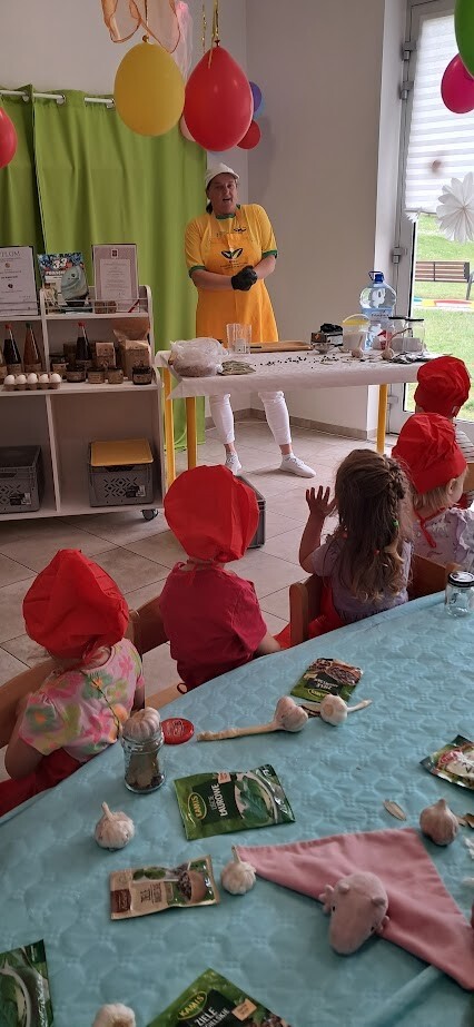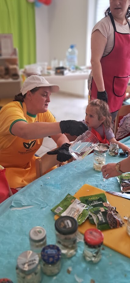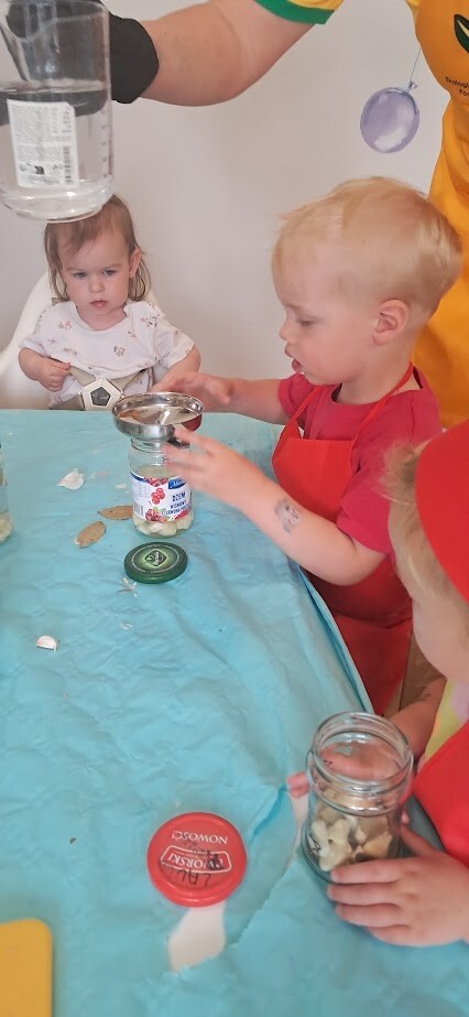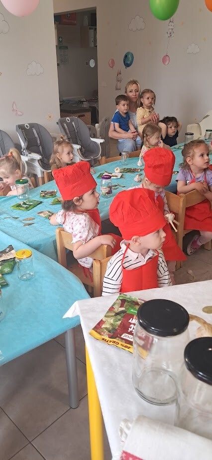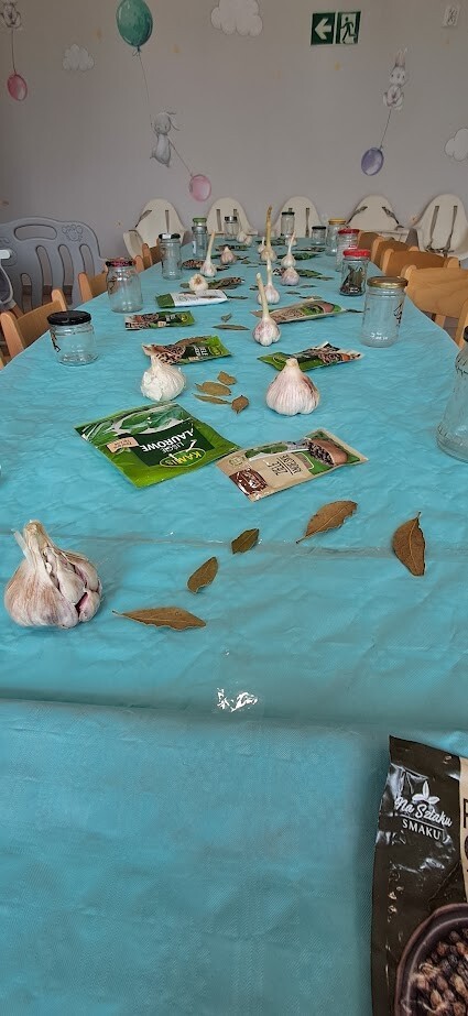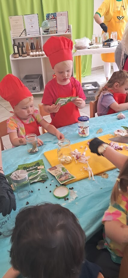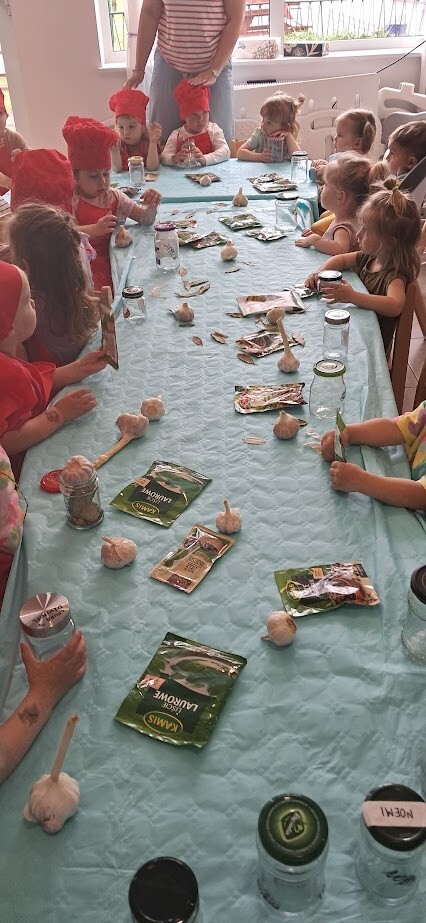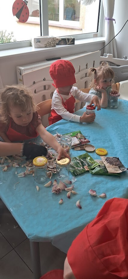 W pomieszczeniach żłobka unosiła się nuta ziela angielskiego, liści laurowych i przede wszystkim czosnku.Tematem przewodnim warsztatów było kiszenie czosnku - dzieci miały okazję nie tylko zobaczyć, jak wygląda proces kiszenia, ale również aktywnie w nim uczestniczyć. Pod czujnym okiem Pani Karoliny wkładały czosnek do słoików, dodawały przyprawy i zalewę a przy tym uczyły się, dlaczego kiszonki są takie zdrowe.
