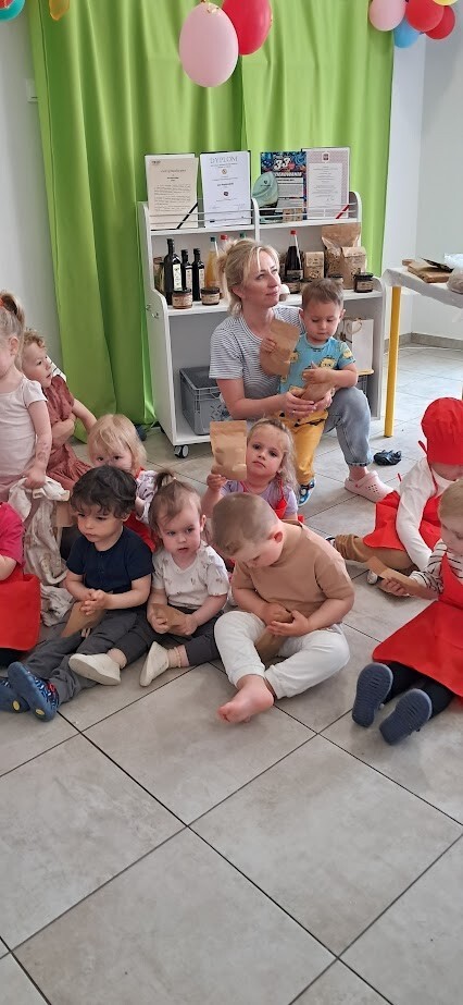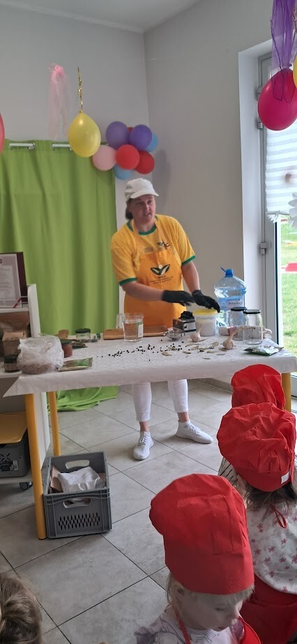 Każde dziecko otrzymało do domu prezent darowany przez gościnię, opakowanie ekologicznego grochu, oraz słoik z czosnkiem, zalanym zalewą i przyprawami.Na ręce pani Karoliny złożyliśmy podziękowania wraz z upominkiem.