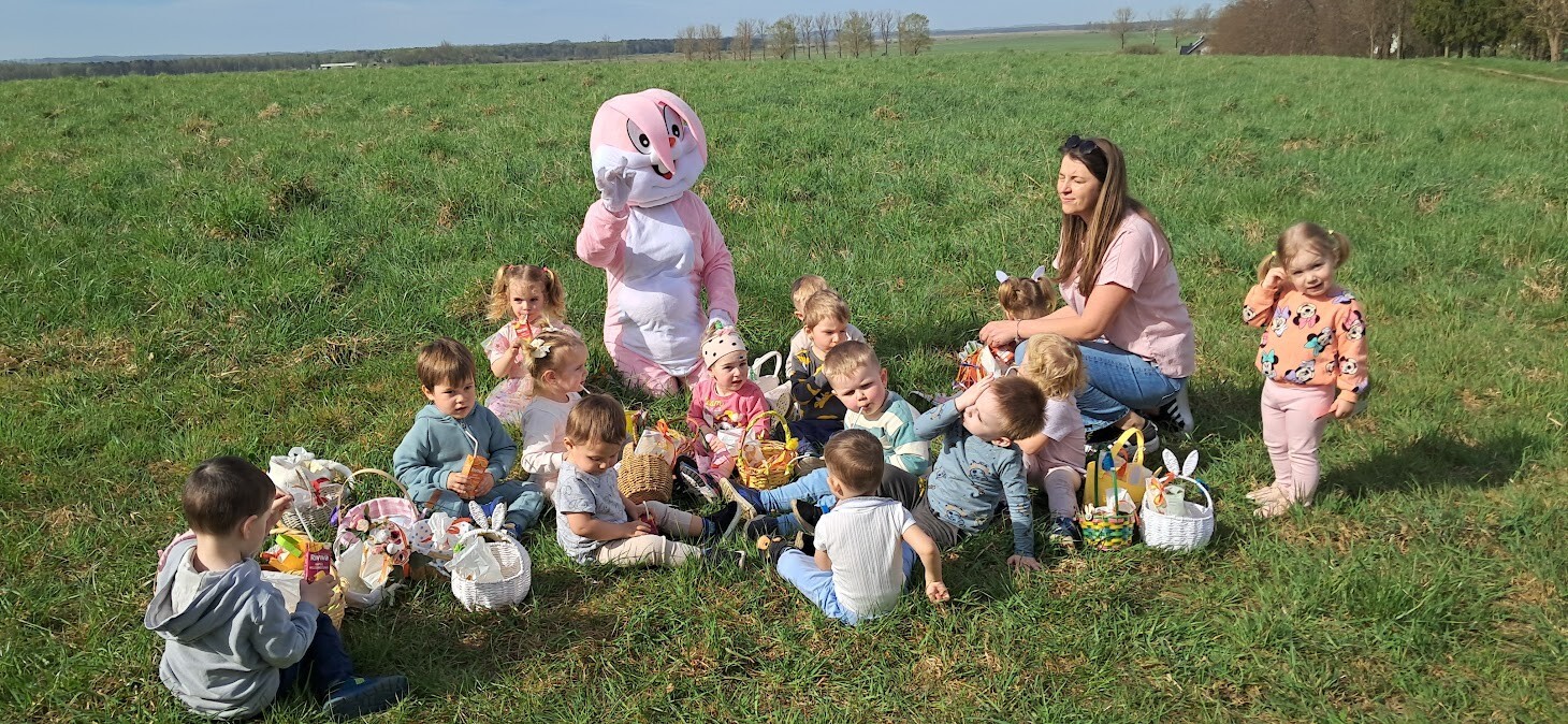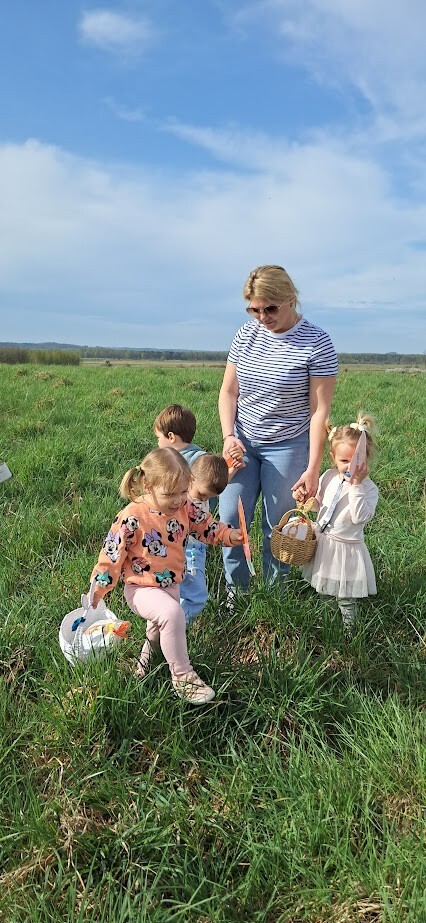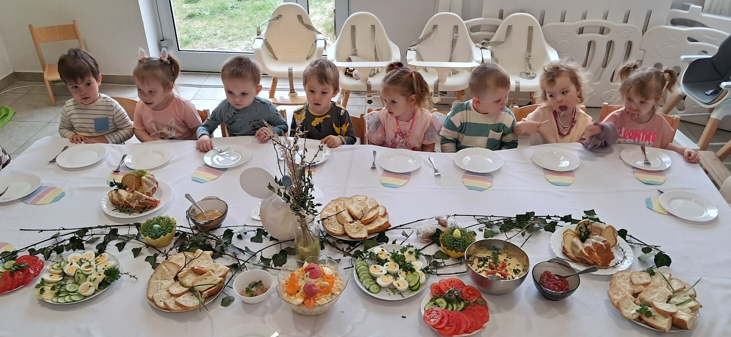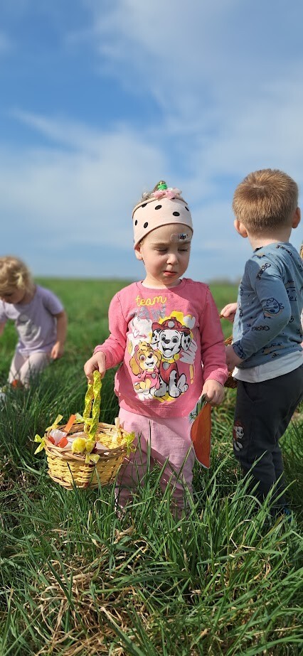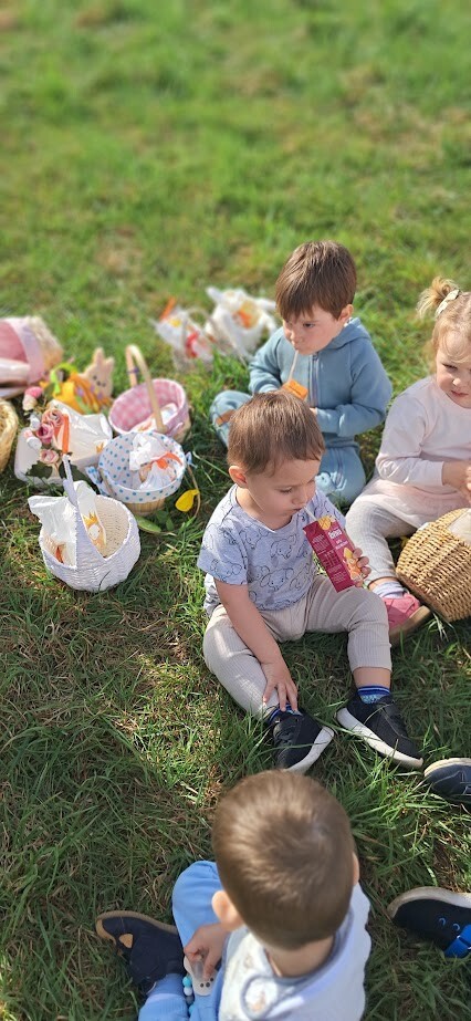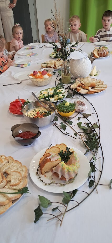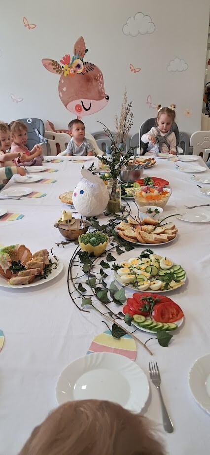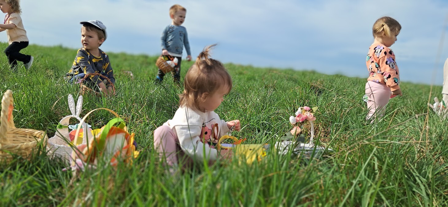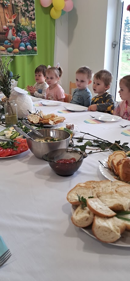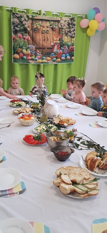 Dzisiejszy poranek rozpoczęliśmy od zjedzenia wspólnie śniadania wielkanocnego. Rodzice przygotowali sałatkę warzywną, pastę jajeczną, gotowane jajka oraz słodkie babeczki. Następnie dzieci udały się śladami zajączka na pobliską łączkę. Szarak czekał tam na dzieci z ukrytymi koszyczkami wypełnionymi niespodziankami. Każdy maluch szukał wśród zarośli swojego koszyczka. Nie było to łatwe, ale zajączek pomagał dzieciom i służył pomocą. Był to bardzo intensywny dzień, który zakończył się mile.