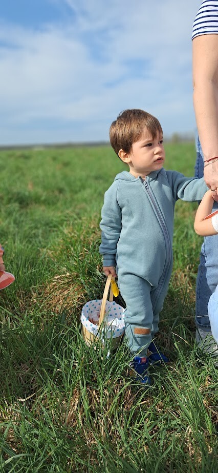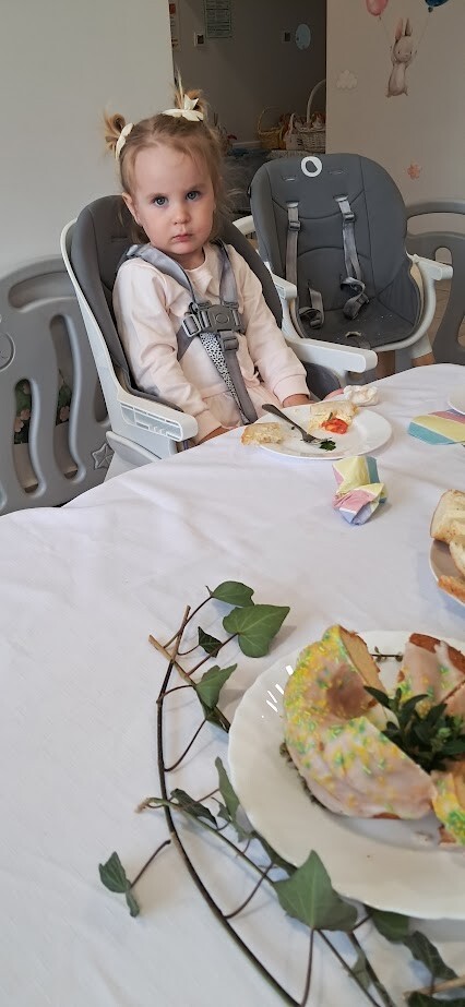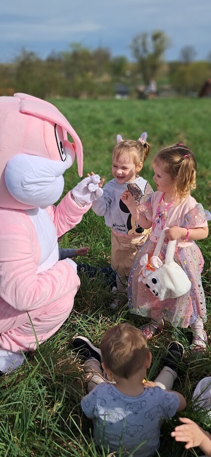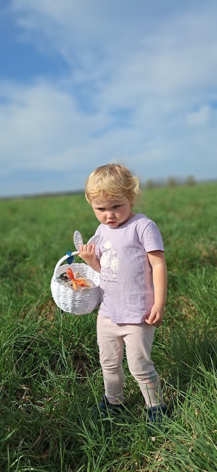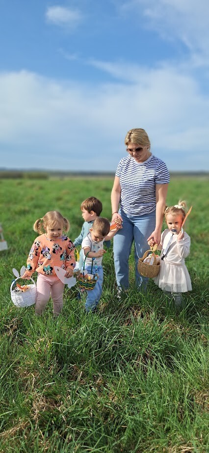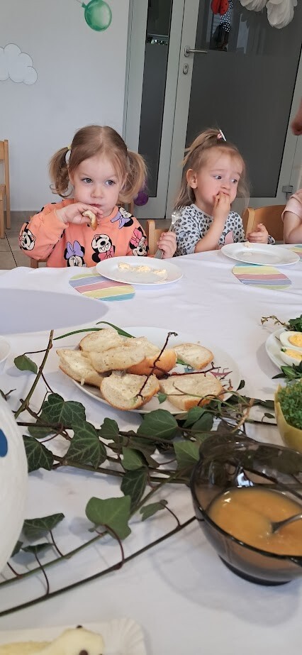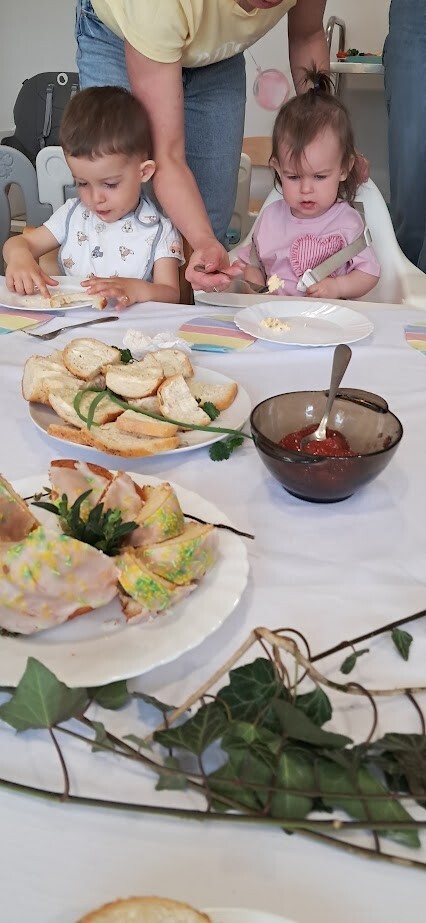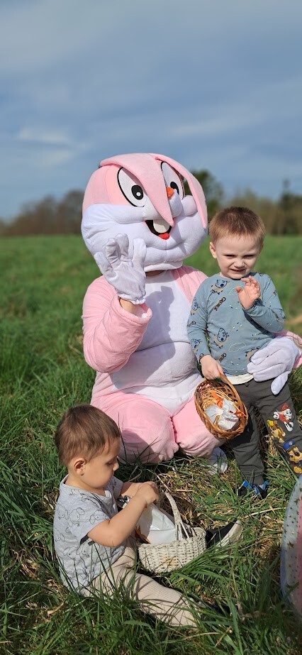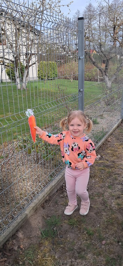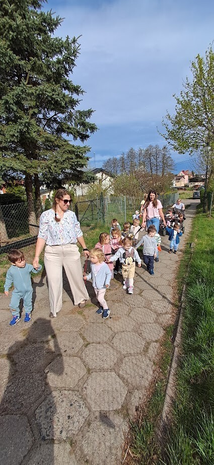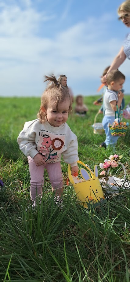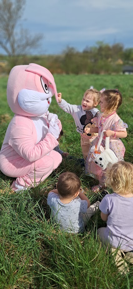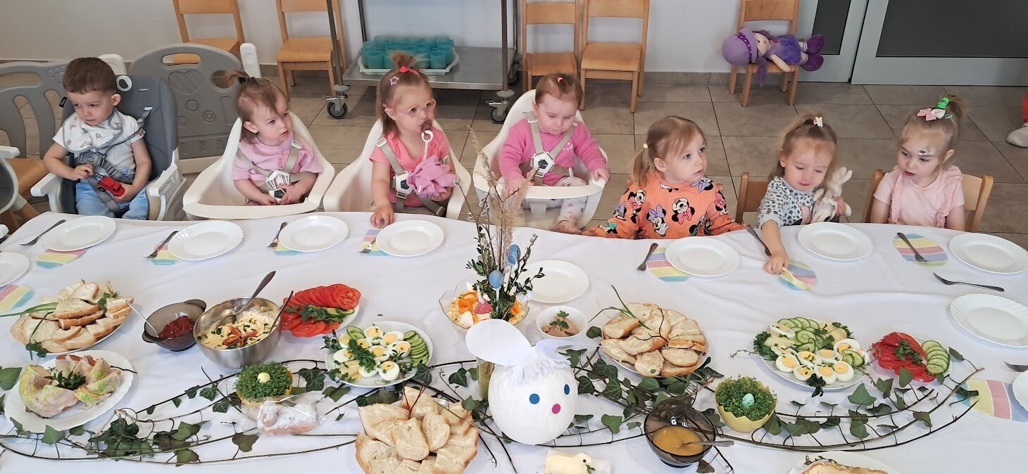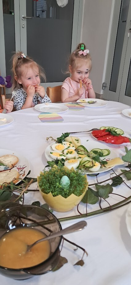 Dzisiejszy poranek rozpoczęliśmy od zjedzenia wspólnie śniadania wielkanocnego. Rodzice przygotowali sałatkę warzywną, pastę jajeczną, gotowane jajka oraz słodkie babeczki. Następnie dzieci udały się śladami zajączka na pobliską łączkę. Szarak czekał tam na dzieci z ukrytymi koszyczkami wypełnionymi niespodziankami. Każdy maluch szukał wśród zarośli swojego koszyczka. Nie było to łatwe, ale zajączek pomagał dzieciom i służył pomocą. Był to bardzo intensywny dzień, który zakończył się mile.