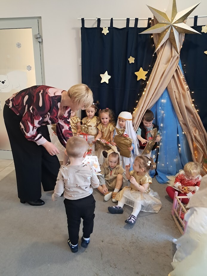 W dniu 12 grudnia mieliśmy okazję gościć w naszym żłobku Panią Katarzynę Piepiórkę - Dyrektor Żłobka Gminnego "Promyczek" w Lini. Pani Kasia była wysłanniczką Św. Mikołaja z powiatu wejherowskiego. Każde dziecko otrzymało prezent, z którym wróciło do domu, oraz prezent niespodziankę dla żłobka. Z wielka ochotą, zaprosiliśmy Panią Dyrektor na jasełka oraz zaprezentowaliśmy piosenki świąteczne. Takie spotkania przypominają nam o dobrych uczynkach oraz pomagają w wymianie doświadczeń, które są istotne w pracy z dziećmi.