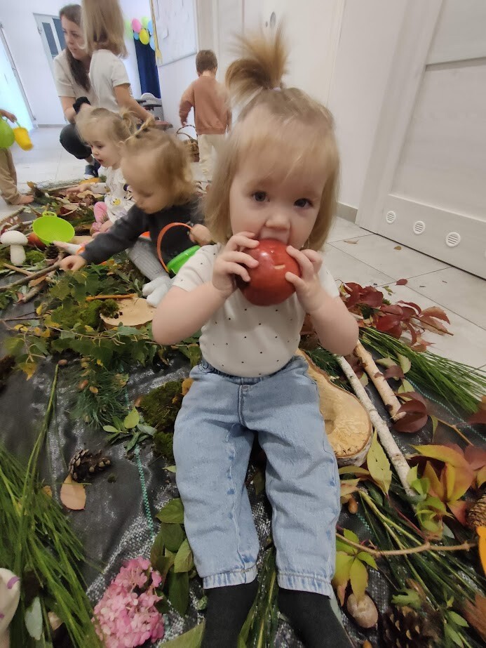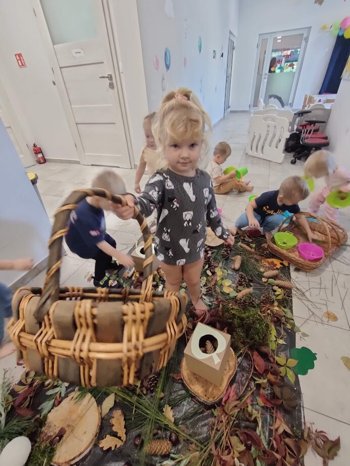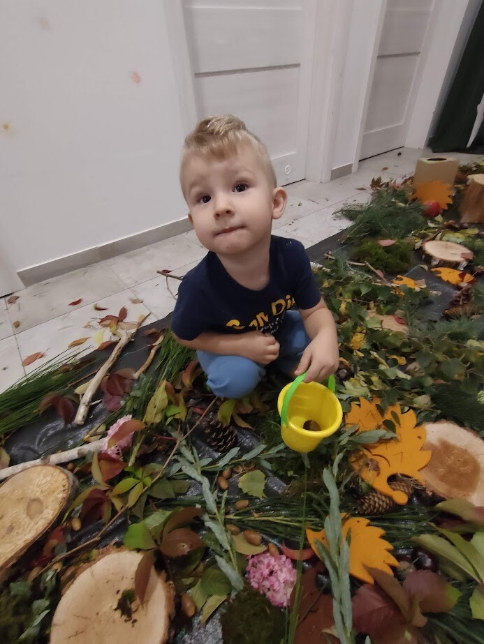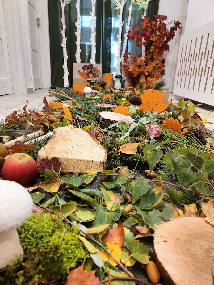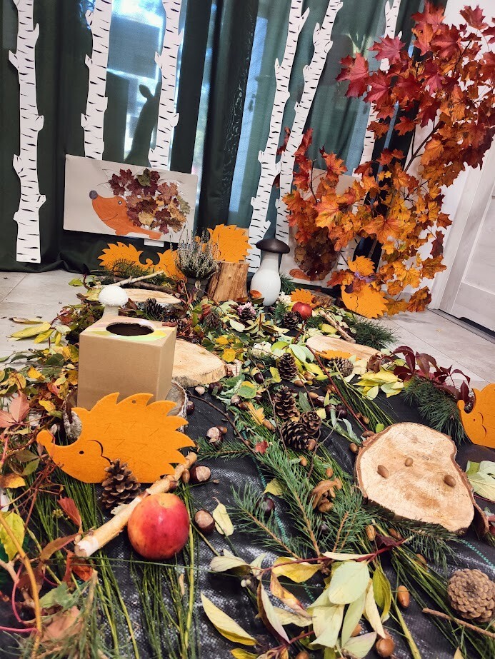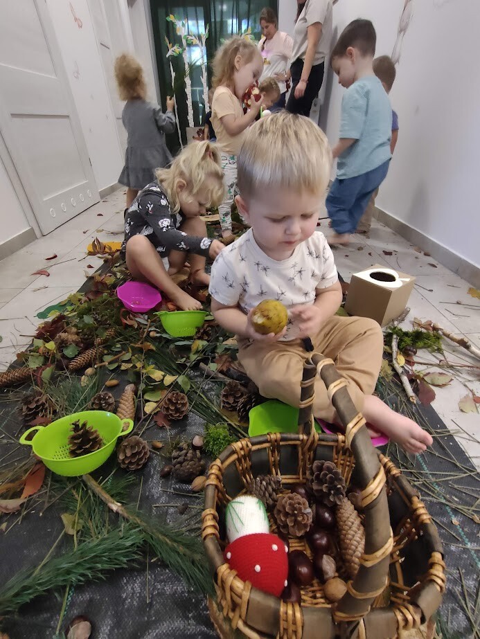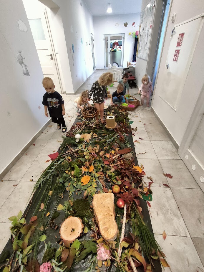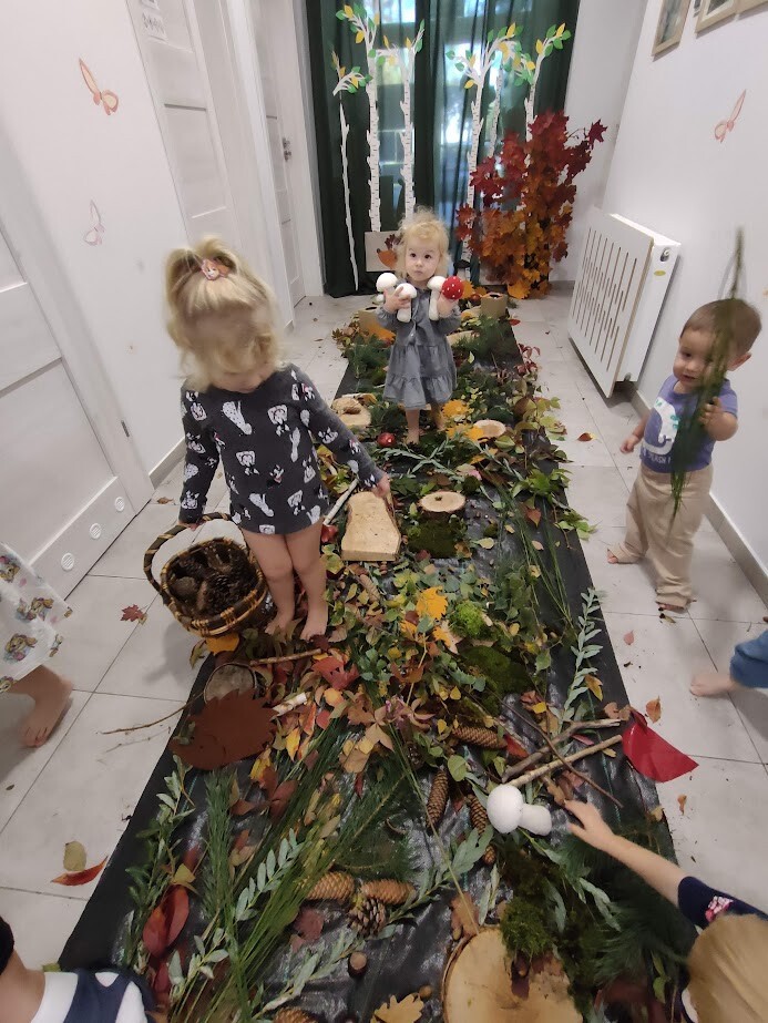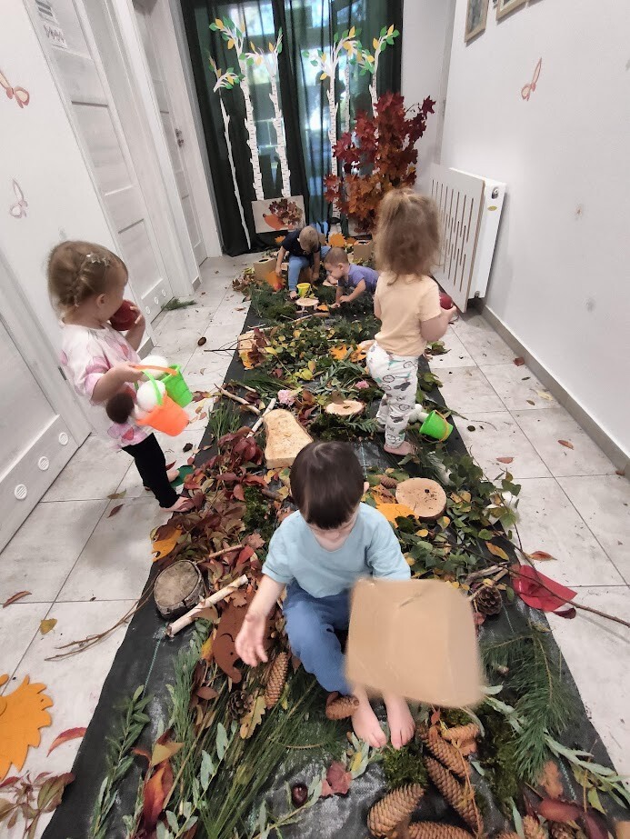 Naturalne materiały, które można spotkać w lesie, ale i nie tylko takie jak: mech, patyki, gałęzie, kasztany, żołędzie, jabłka, liście, grzybki, orzechy laskowe, drewniane kołki, suszona lawenda - to wszystko pojawiło się na ścieżce sensorycznej. Dzieci z niedowierzaniem spoglądały na przygotowane miejsce, ostrożnie wchodziły i badały przygotowane miejsce. Nie wszystkie dzieci zdecydowały się na bose wędrówki. Zabawa z czasem okazała się niesamowitym przeżyciem, zapach lawendy unosił się w powietrzu. Zabawy patykami, kosztowanie jabłek ma nieco inny wymiar kiedy można swobodnie poczuć się jak na łonie natury.
