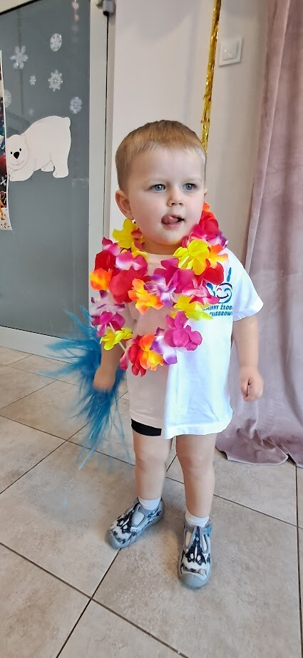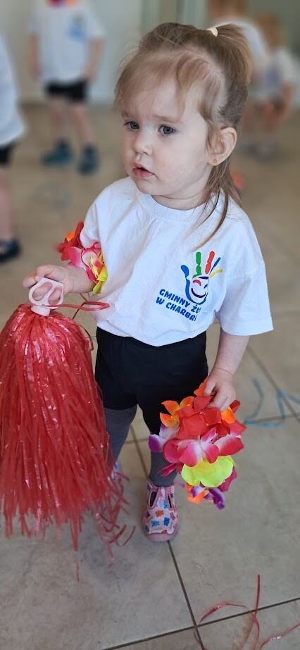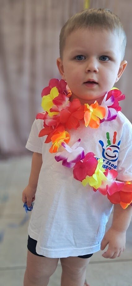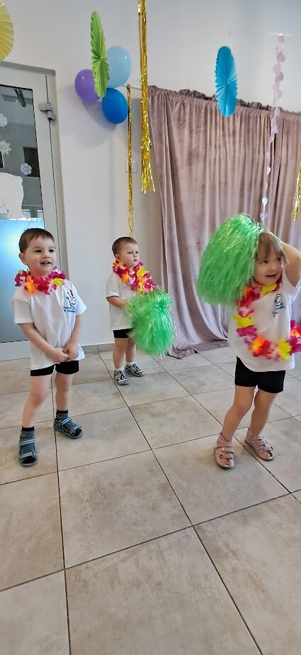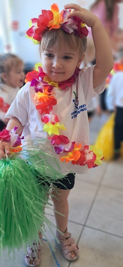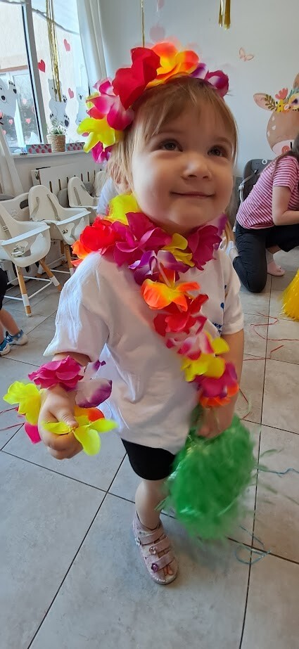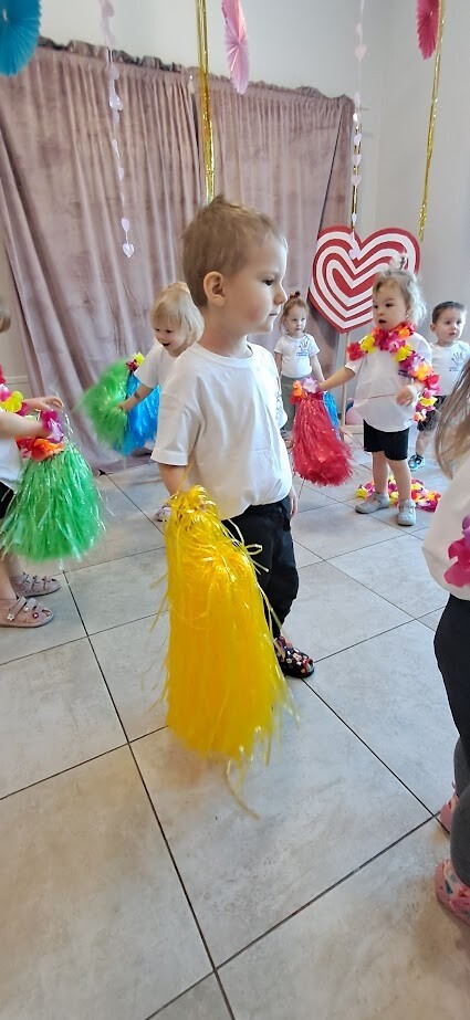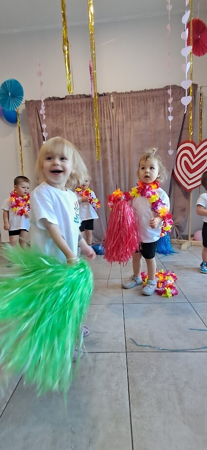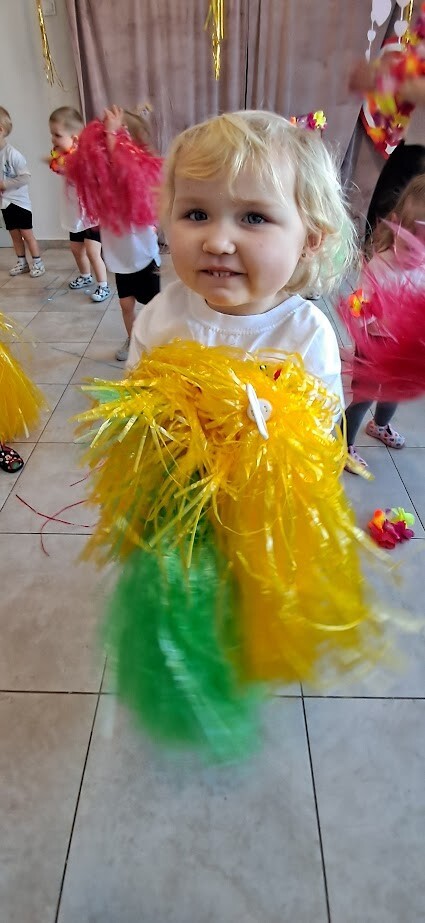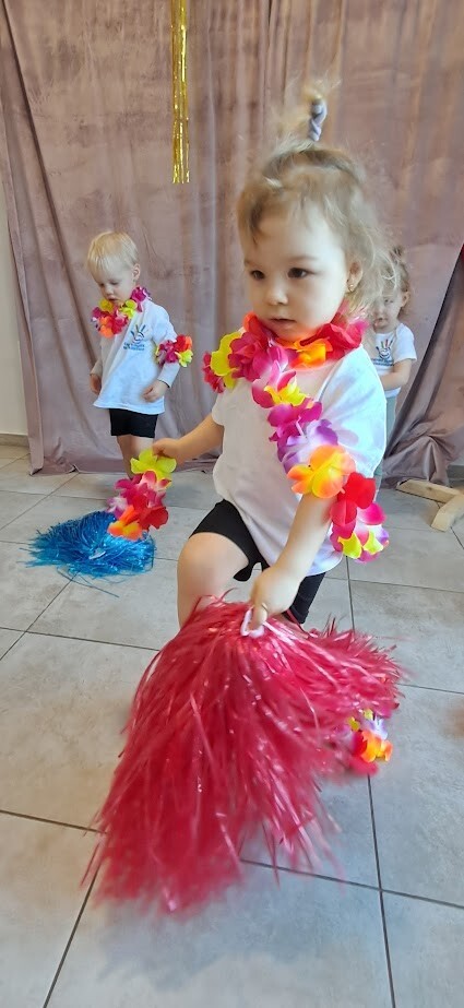 Zumba to świetny sposób na połączenie ruchu, zabawy i muzyki. Zajęcia te wzmacniają koordynację ruchową i ogólną sprawność fizyczną. W tańcu zostały wykorzystane rekwizyty takie jak, pompony, oraz łańcuchy hawajskie. Mali żłobkowicze bawili się przy utworach tj ,,Waka Waka'', ,,Cziki cziki cza'' nie zabrakło uśmiechu, oraz dobrej zabawy.