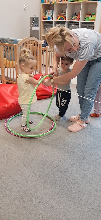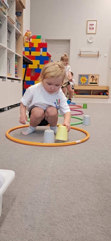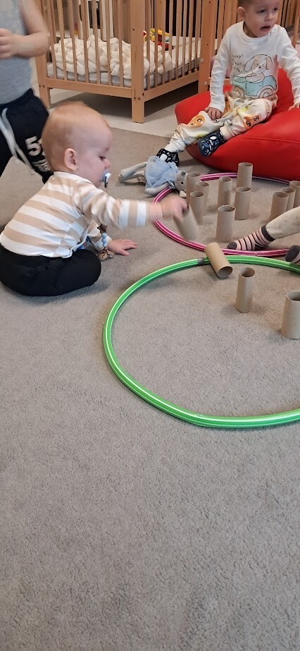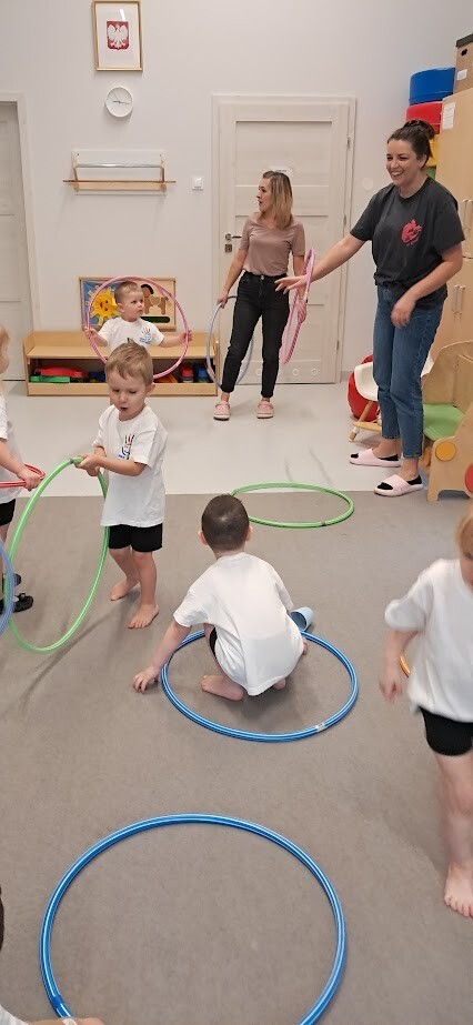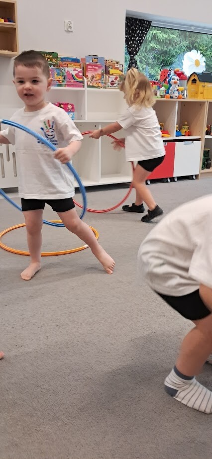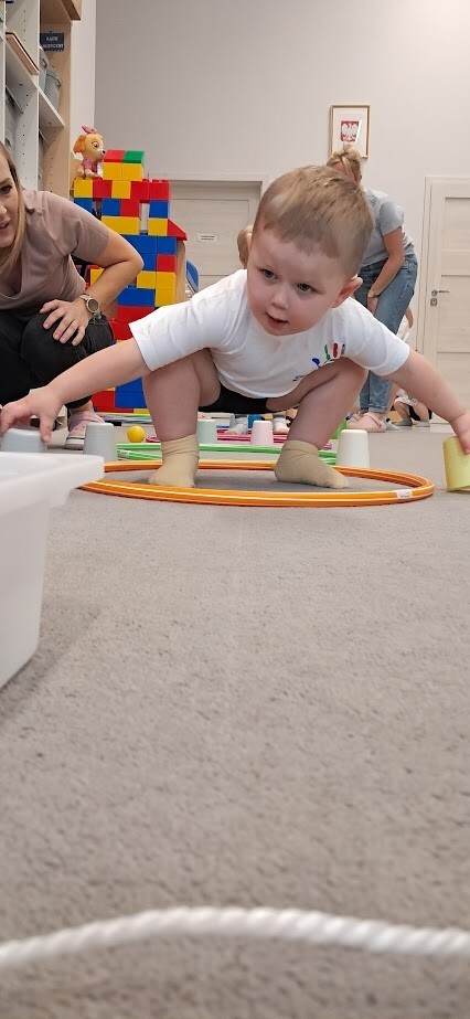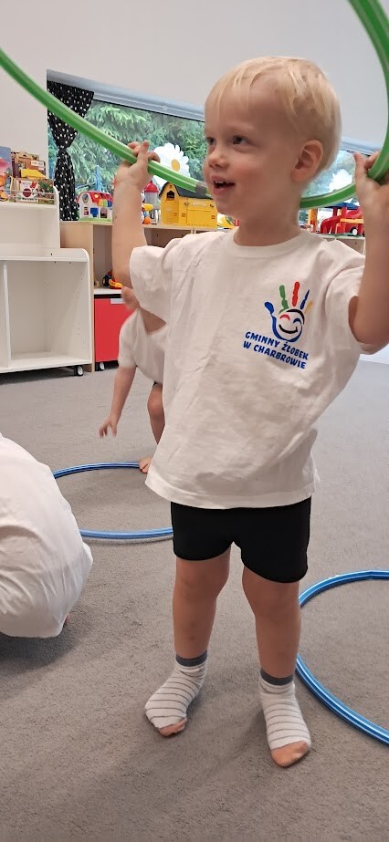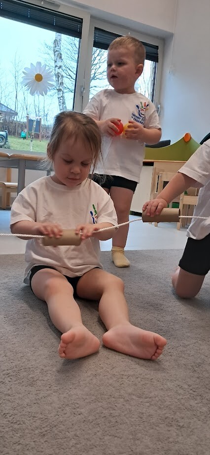 Dzieci z wielką ochotą przekładały przedmioty tj. rolki po papierze toaletowym z kół hula-hop rozwijając tym samym precyzję i celność ruchów. Nawlekały rolki na sznurek, próbowały kręcić kołem hula-hop, układały piłeczki do odpowiedniej obręczy zgodnie z kolorem. Każda proponowana zabawa spotkała się z dużym zainteresowaniem wśród dzieci.