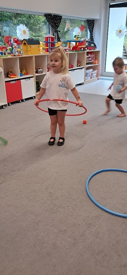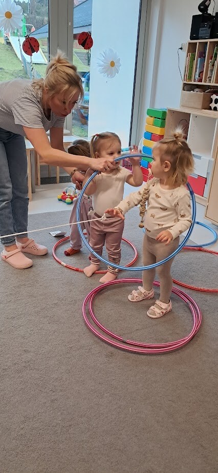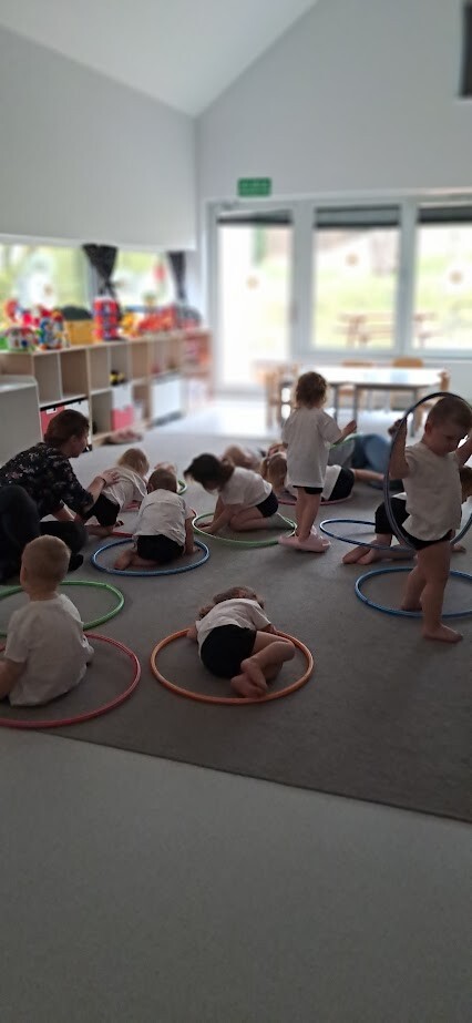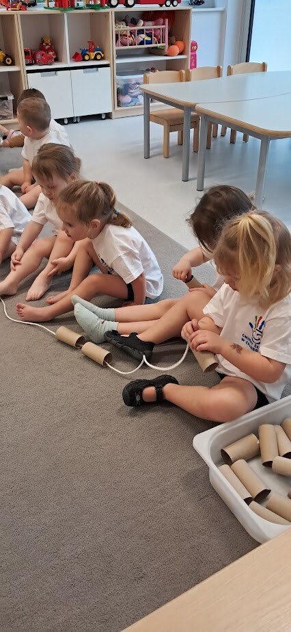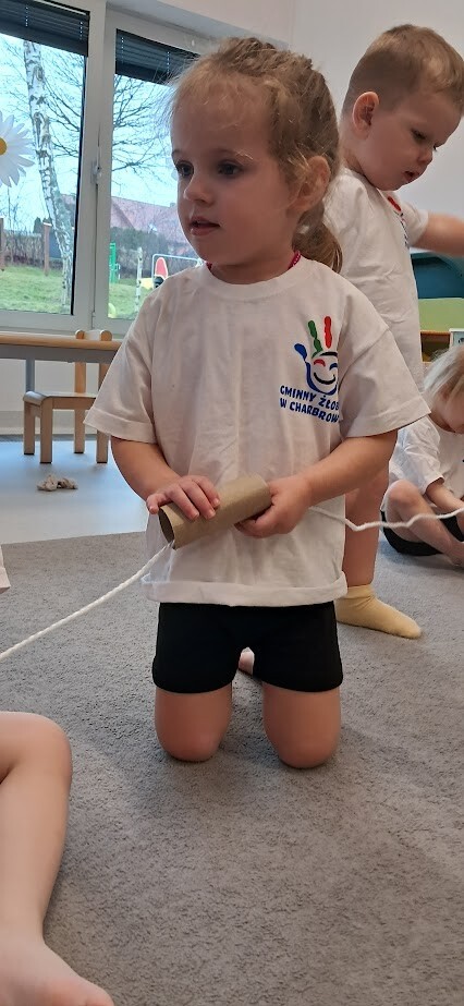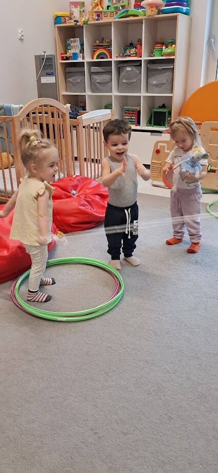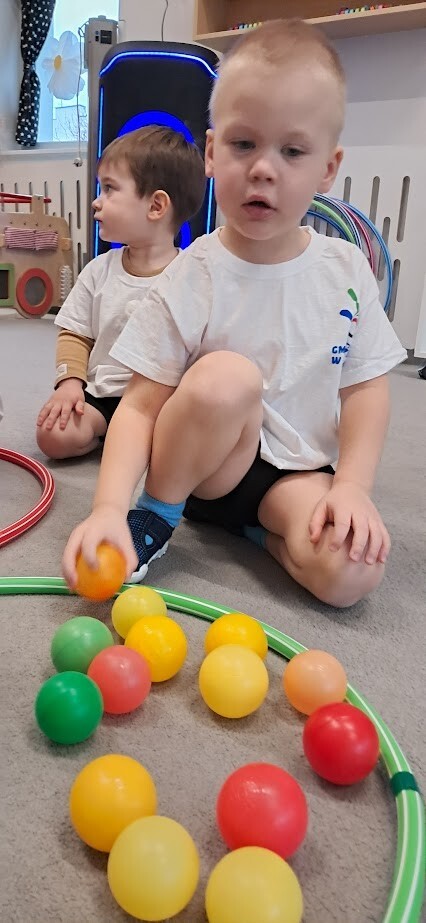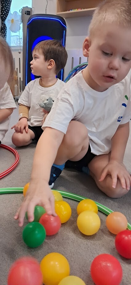 Dzieci z wielką ochotą przekładały przedmioty tj. rolki po papierze toaletowym z kół hula-hop rozwijając tym samym precyzję i celność ruchów. Nawlekały rolki na sznurek, próbowały kręcić kołem hula-hop, układały piłeczki do odpowiedniej obręczy zgodnie z kolorem. Każda proponowana zabawa spotkała się z dużym zainteresowaniem wśród dzieci.