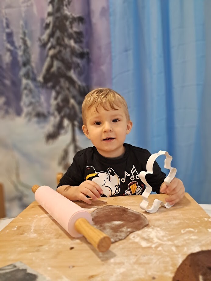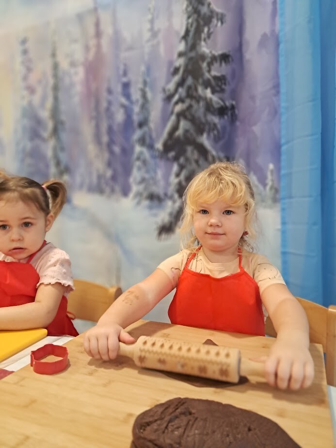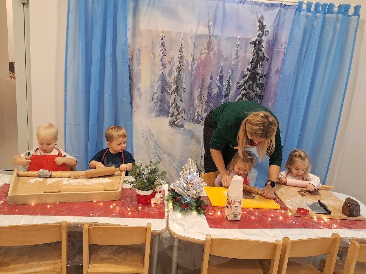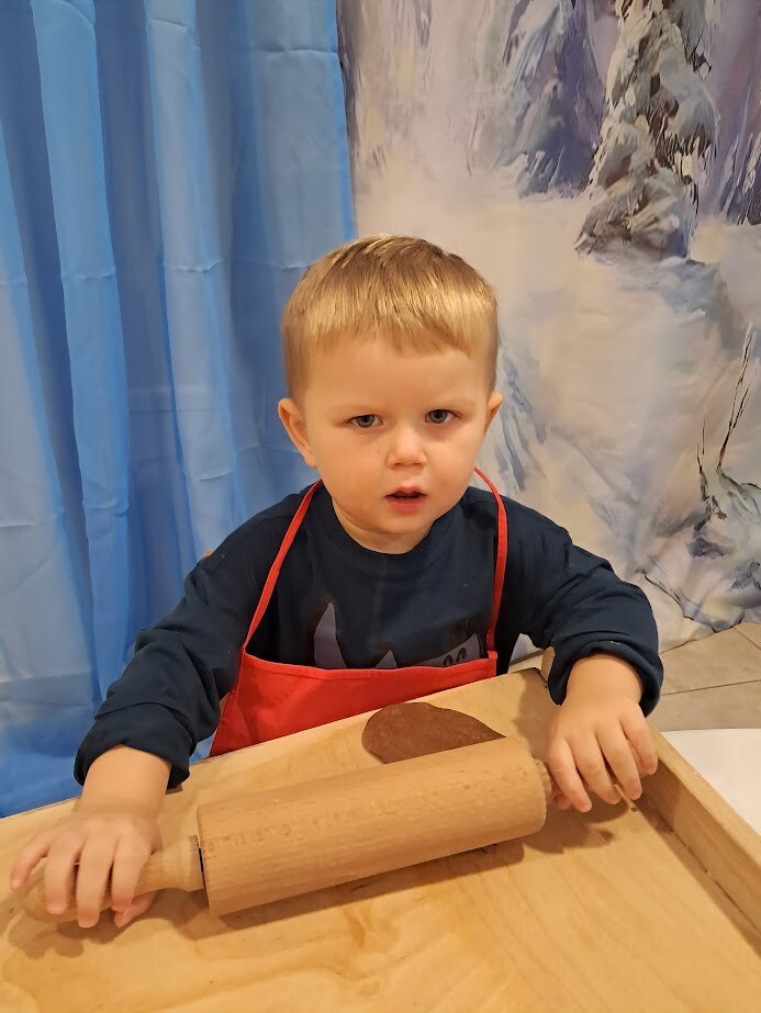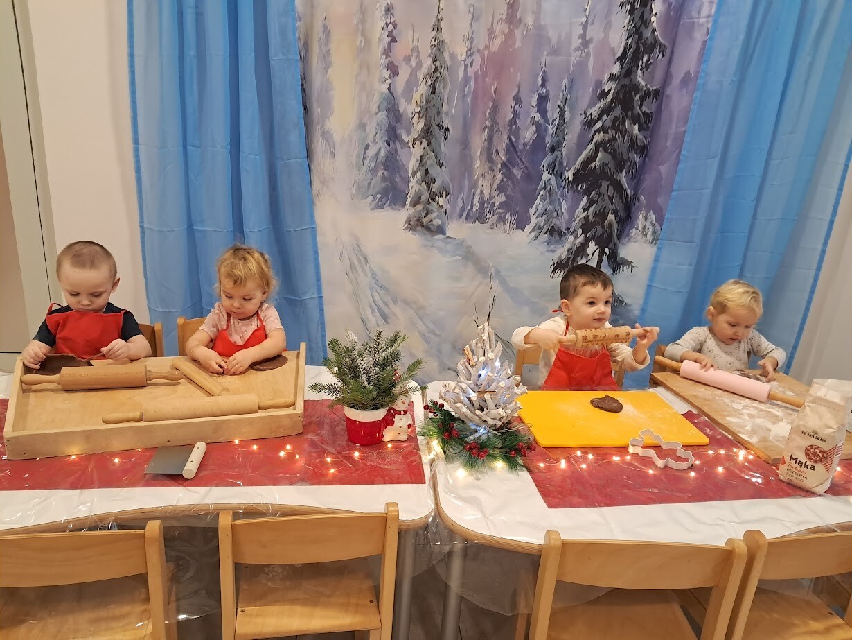 Czas przedświąteczny kojarzy się także z pieczeniem pierniczków, czego nie mogło zabraknąć w naszym żłobku. Zapach przypraw korzennych unosił się w powietrzu. Przy dźwiękach muzyki zimowej dzieci z wielkim zaangażowaniem skupiły się na wałkowaniu i wykrawaniu ciasteczek. Trudno nam było odciągnąć żłobkowiczów od tego zajęcia. Cieszymy się ogromnie oraz zachęcamy do wspólnym prac w kuchni zwłaszcza w okresie przedświątecznym.