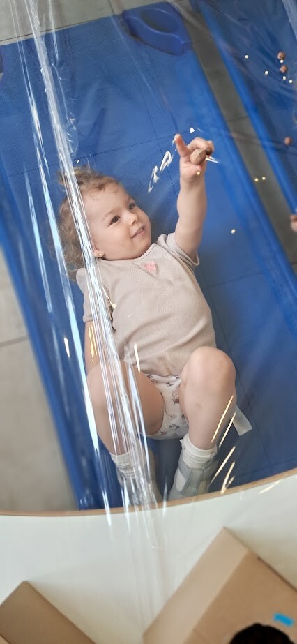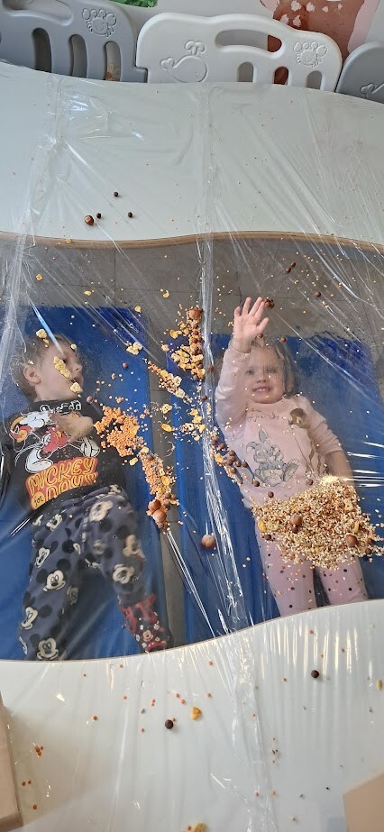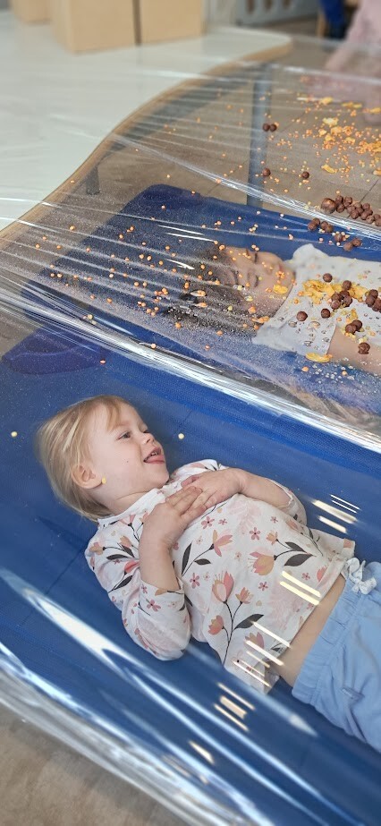 Deszcz emocji- leżąc na leżaczkach przykrytych folią spożywczą, dzieci doświadczają różnych bodźców: