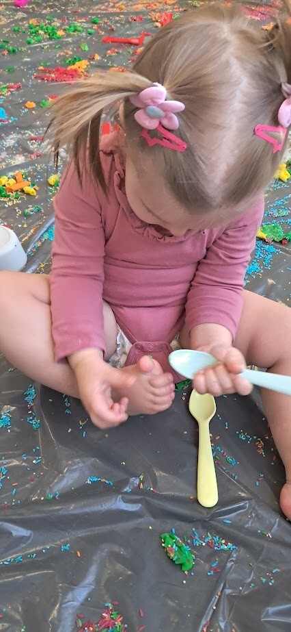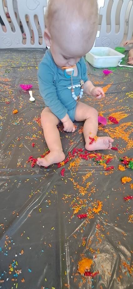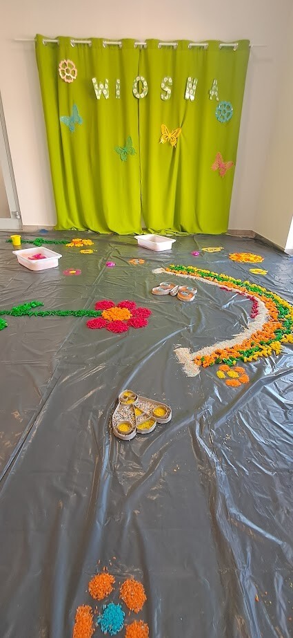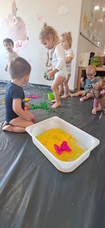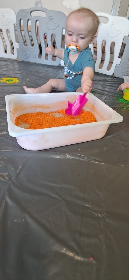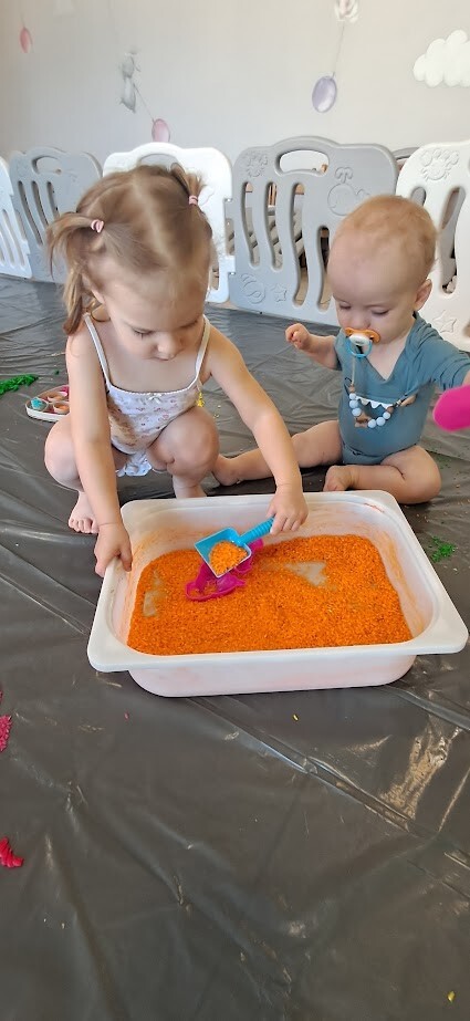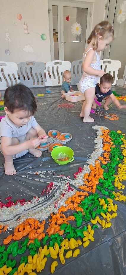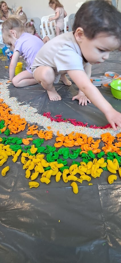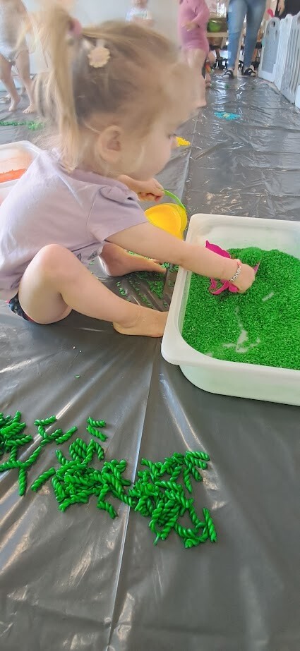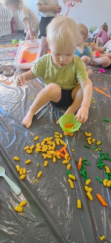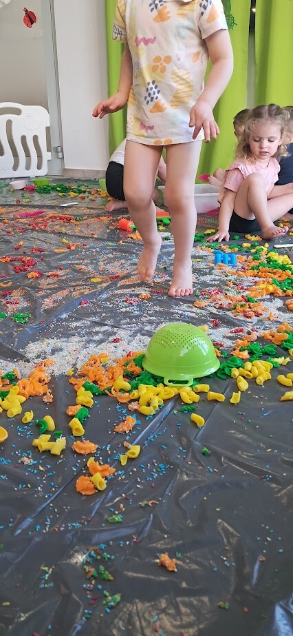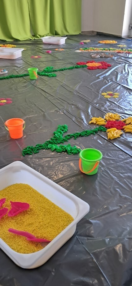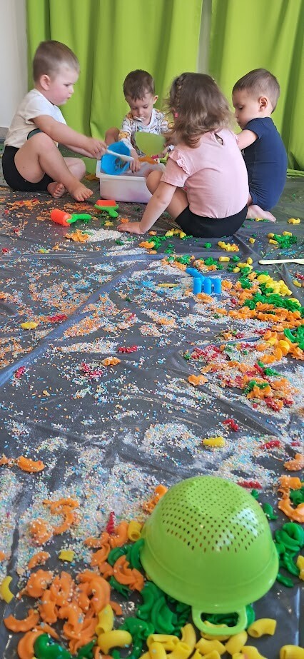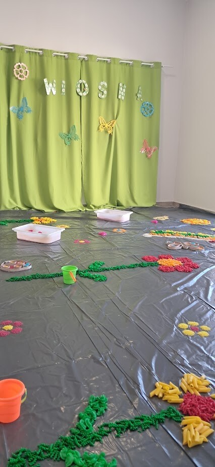 Kolejna propozycja zabaw sensorycznych z wykorzystaniem produktów jadalnych, takich jak ryż i makaron. Zabawa polegała na poszukiwaniu oznak wiosny, przy dźwiękach natury (ptaków, szumu lasu) dzieci spacerowały po ułożonej kompozycji w gołych stopach. Kolejnym zadaniem było przesypywanie, zgniatanie, prezentowanego materiału czyli pełne doświadczanie wszystkimi zmysłami.