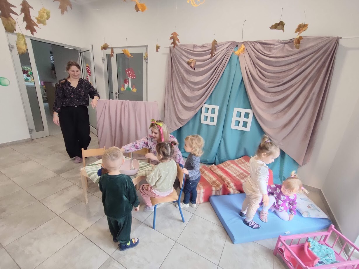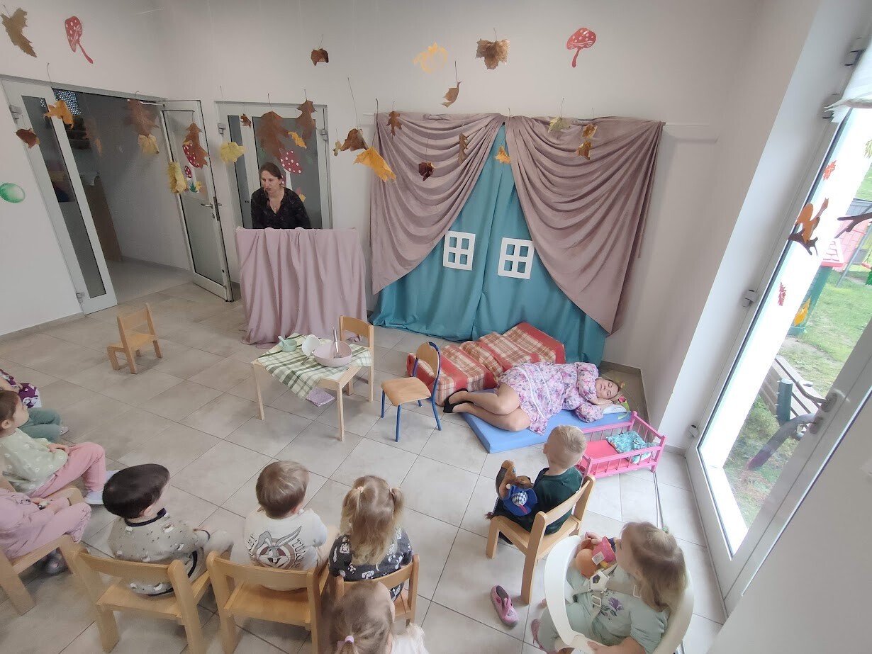 Dzieci z wielkim zainteresowaniem oglądały przedstawienie teatralne w zaaranżowanej scenerii.