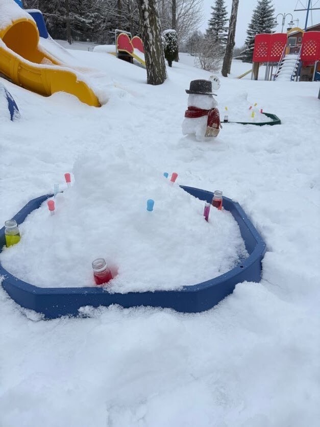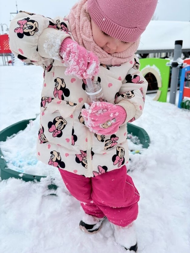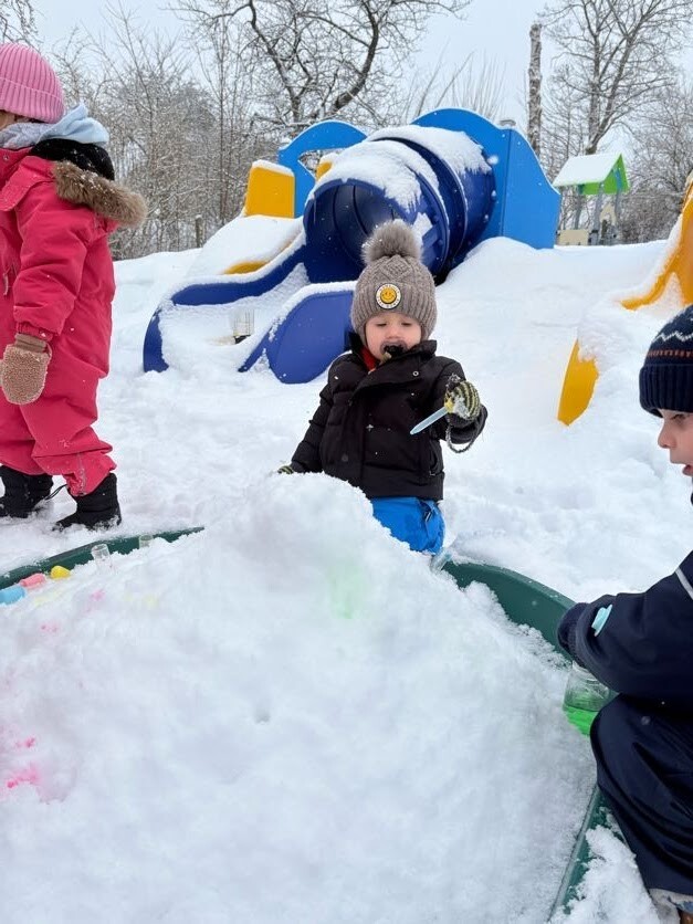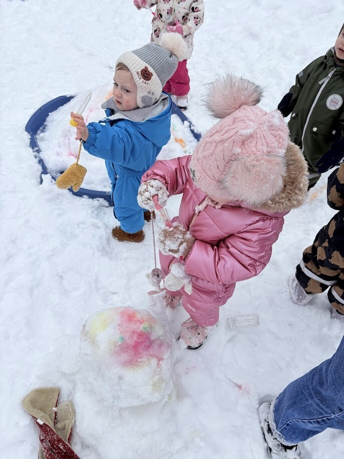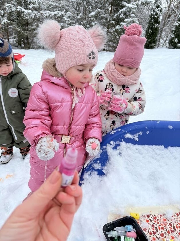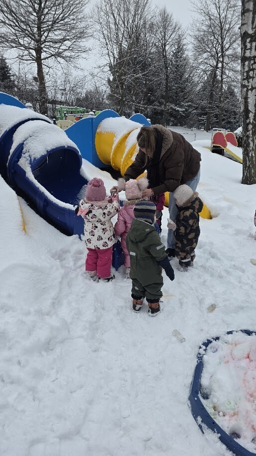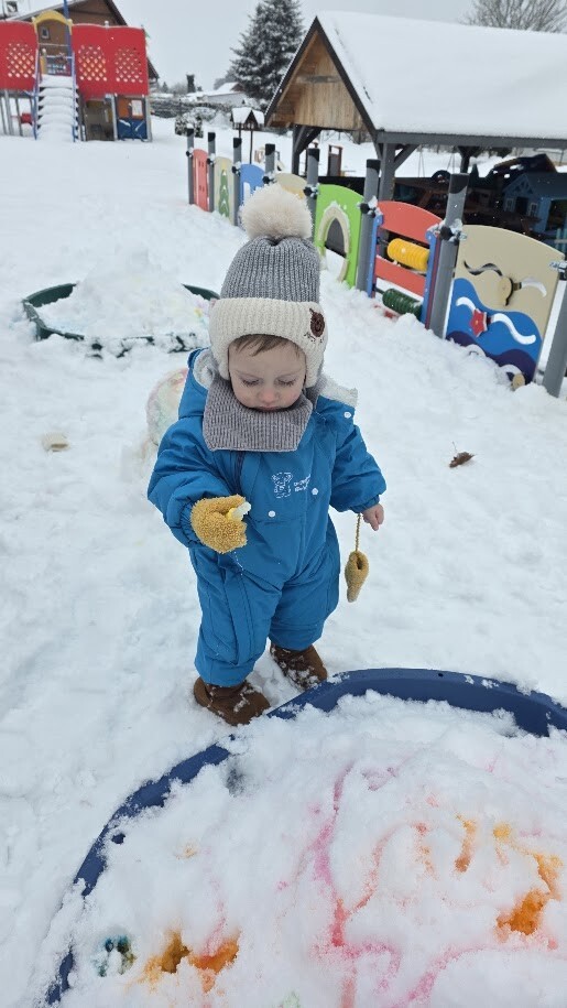 Zajęcia sensoryczne na śniegu sprawiły dzieciom mnóstwo radości pozwoliły im doświadczać zimy wszystkimi zmysłami. Podczas zabawy maluchy kolorowały śnieg za pomocą pipet i barwinków spożywczych- z ogromnym zaciekawieniem obserwowały, jak biały puch zmienia barwy i tworzy kolorowe wzory. Eksperymentowanie z kolorami było dla nich fascynującym doświadczeniem i okazją do rozwijania kreatywności.