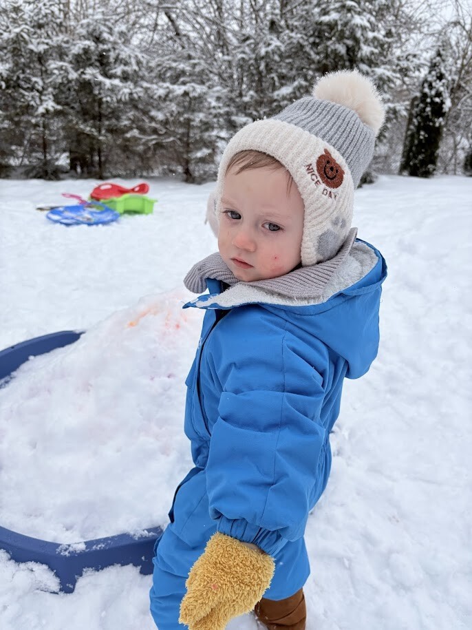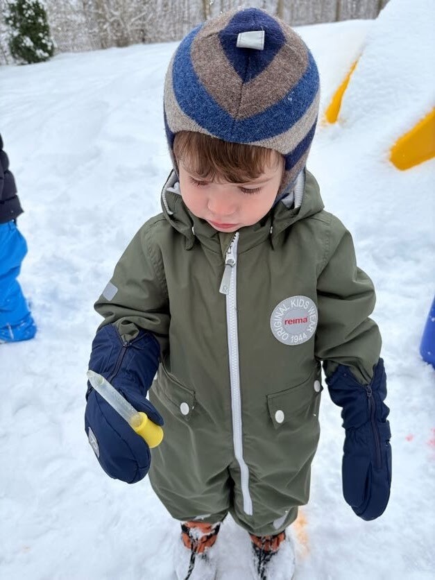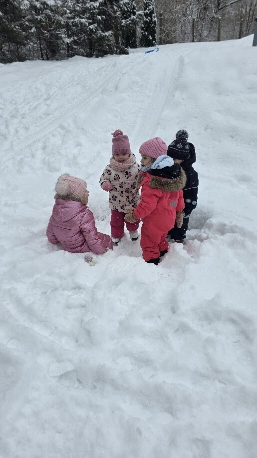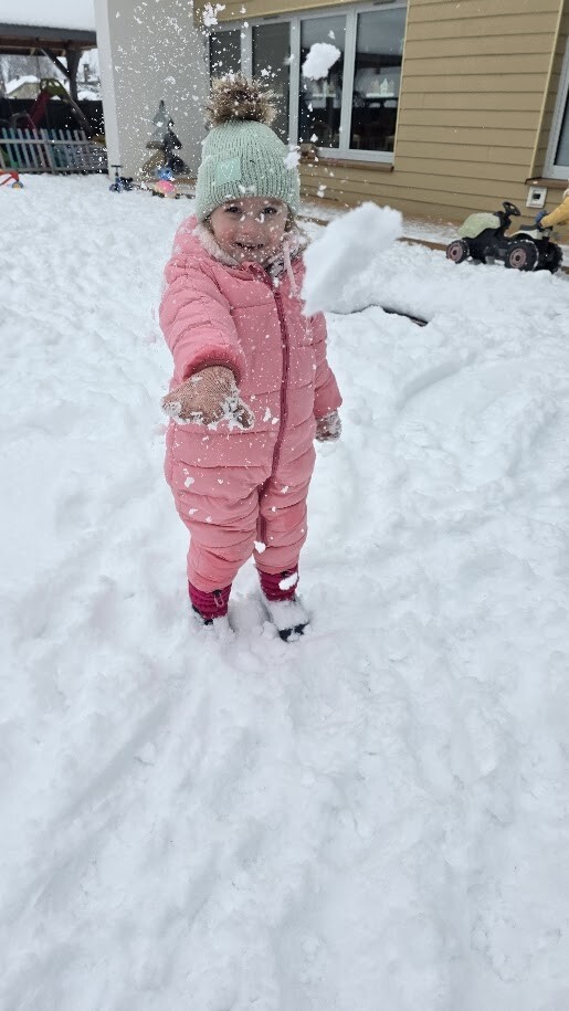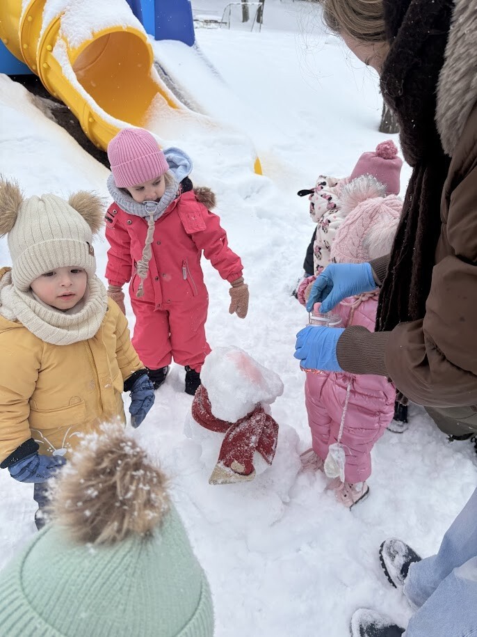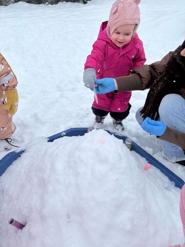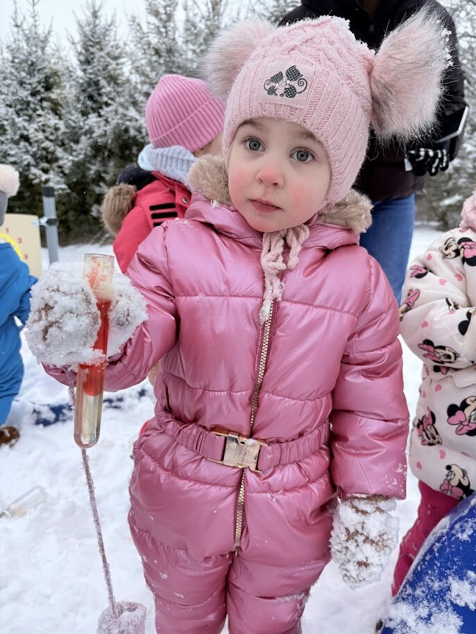 Zajęcia sensoryczne na śniegu sprawiły dzieciom mnóstwo radości pozwoliły im doświadczać zimy wszystkimi zmysłami. Podczas zabawy maluchy kolorowały śnieg za pomocą pipet i barwinków spożywczych- z ogromnym zaciekawieniem obserwowały, jak biały puch zmienia barwy i tworzy kolorowe wzory. Eksperymentowanie z kolorami było dla nich fascynującym doświadczeniem i okazją do rozwijania kreatywności.