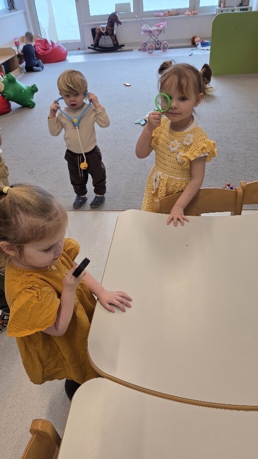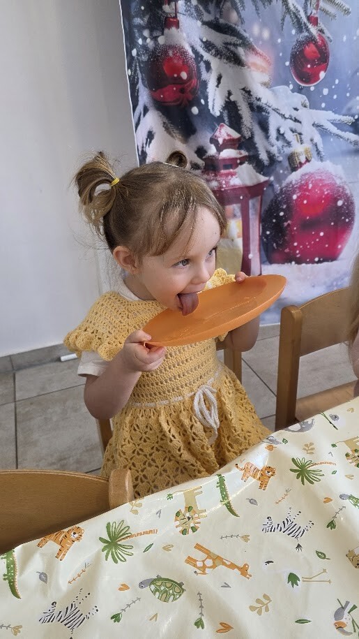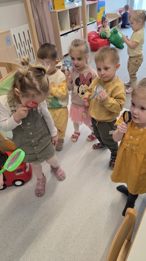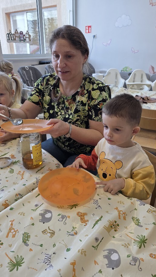 Następnie maluszki wzięły udział w zabawie ,,W poszukiwaniu miodku''. podczas której z wielkim zaangażowaniem szukały ulubionego przysmaku Puchatka. Gdy miodzik został odnaleziony, dzieci mogły go skosztować, co sprawiło im ogromną radość.