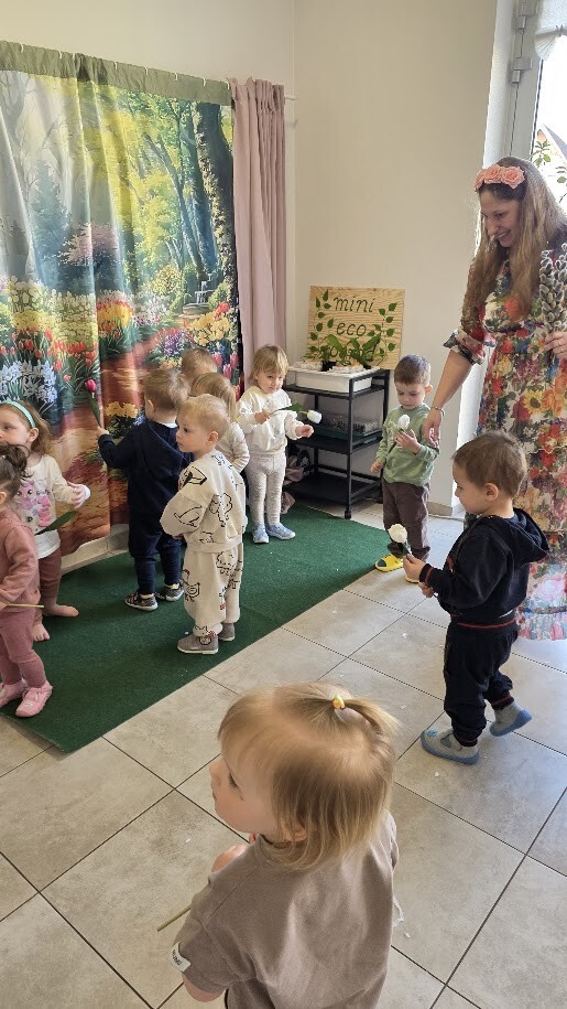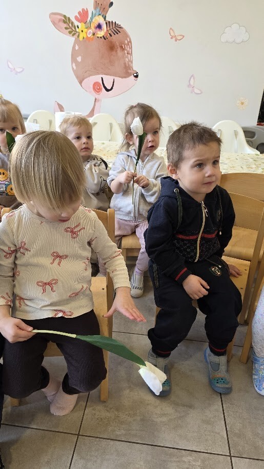 W dniu dzisiejszym, aby ukazać dzieciom zmianę pór roku ciocie przygotowały teatrzyk pt. "Witaj wiosno, żegnaj zimo". Historia opowiadała o Pani Zimie, która nie chciała odejść, chciała, aby dzieci założyły czapki i szaliki i zjeżdżały na sankach. Zima sypała śniegiem i tańczyła przy utworze Vivaldiego "Cztery pory roku". Zniecierpliwiona Pani Wiosna nie mogła dłużej już czekać, przywędrowała z bukietem bazi kotków w kwiecistej sukience i z wiosennym bukietem kwiatów. Dzieci prędko zabrały się do zmiatania i zbierania płatków śniegu. Pożegnalnym uściskiem maluszki pozdrowiły Panią Zimę i zaprosiły, aby przyszła w przyszłym roku w grudniu. Ze słoneczkiem przebijającym się przez okna i kwiatami w ręku dzieci tańczyły radośnie uszczęśliwione, faktem cieplejszych dni i wspaniałych zabaw na dworze.