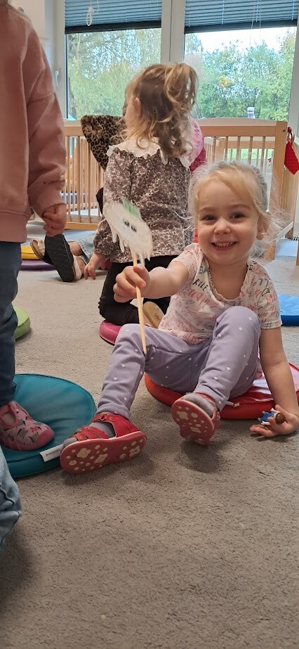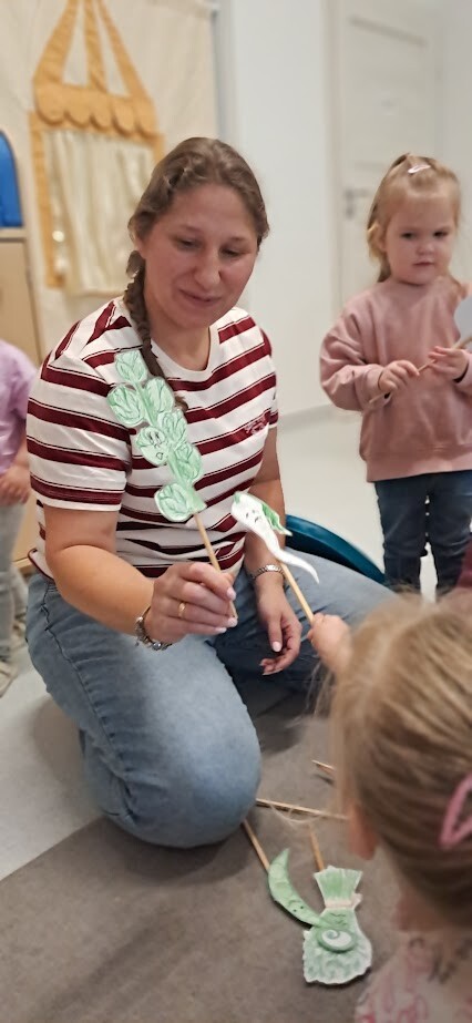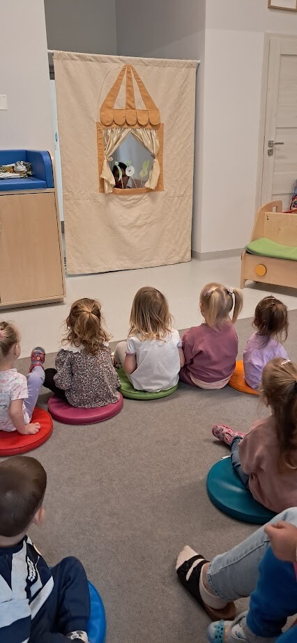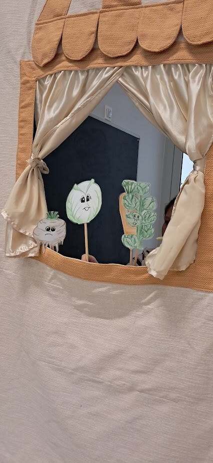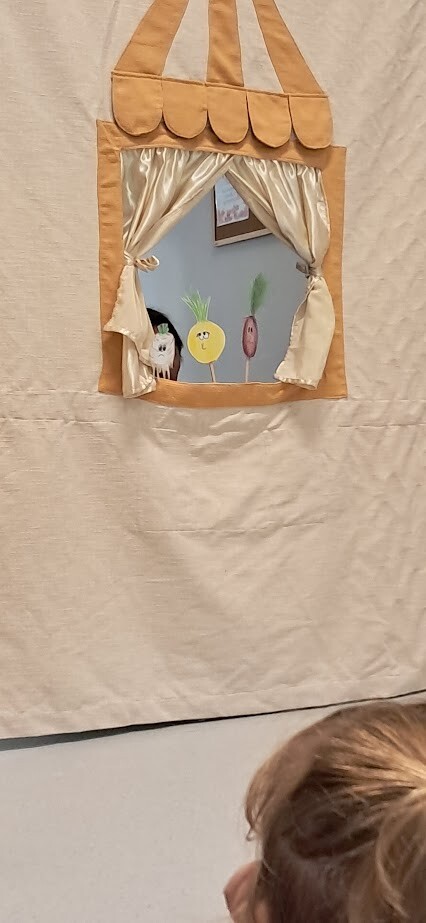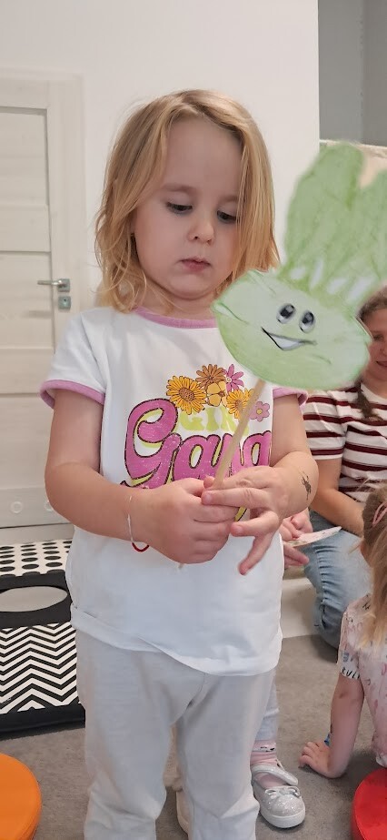 Obejrzały też teatrzyk przygotowany przez ciocię pt ,,Na Straganie'' oparty na wierszu Jana Brzechwy. Barwne postacie warzyw, zabawne dialogi i melodyjne rymy wywołały wiele uśmiechów, a jednocześnie pomogły utrwalić nazwy warzyw i wzbogaciły słownictwo najmłodszych