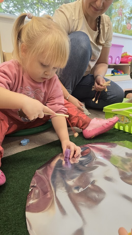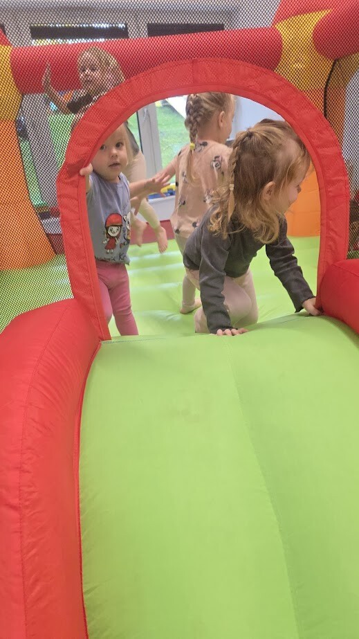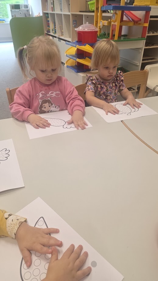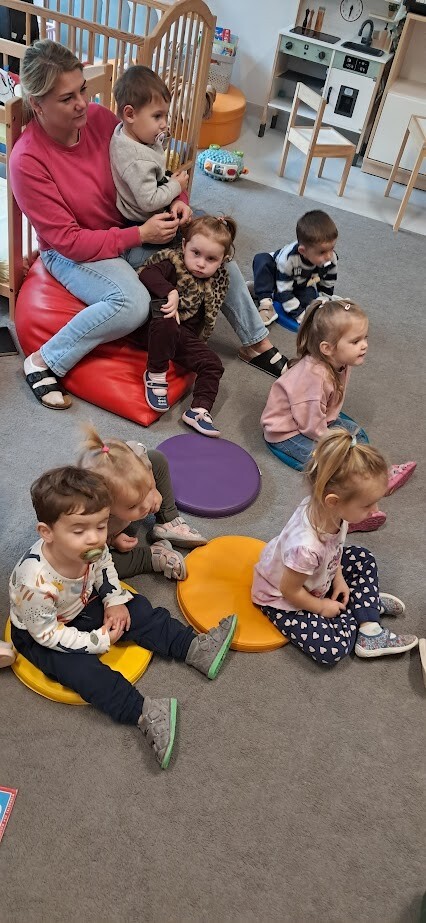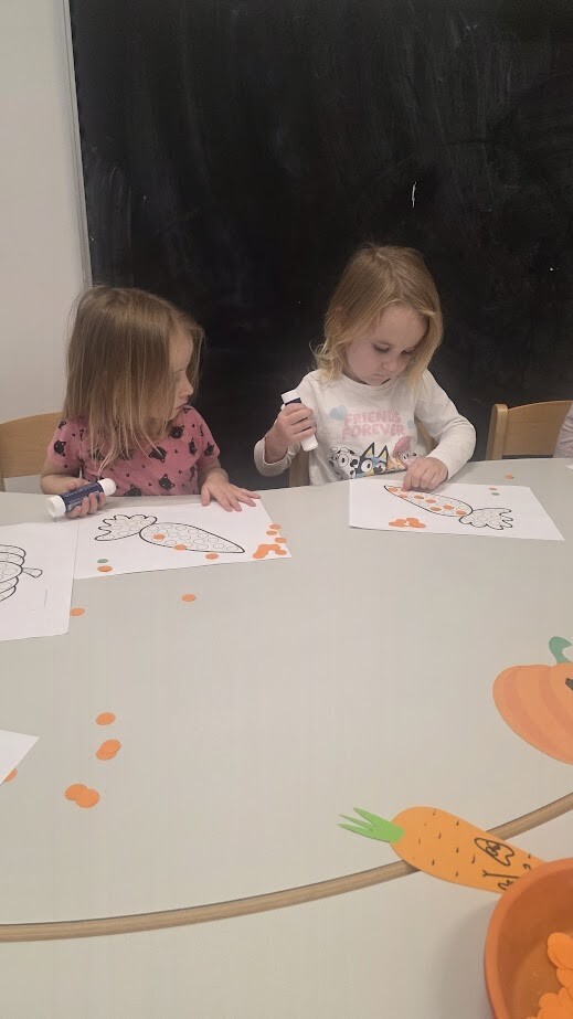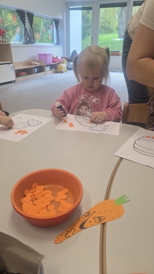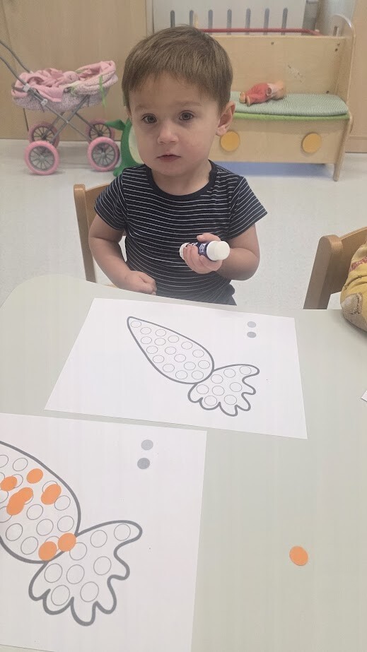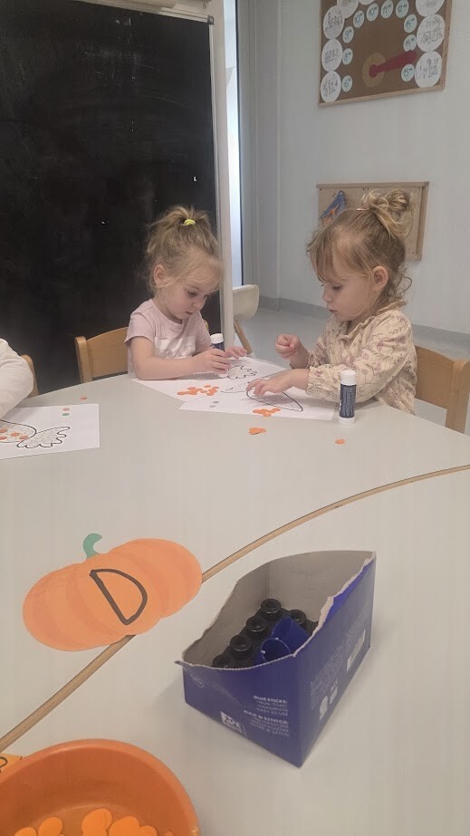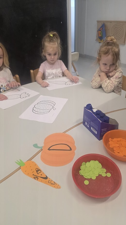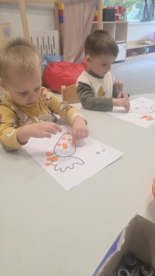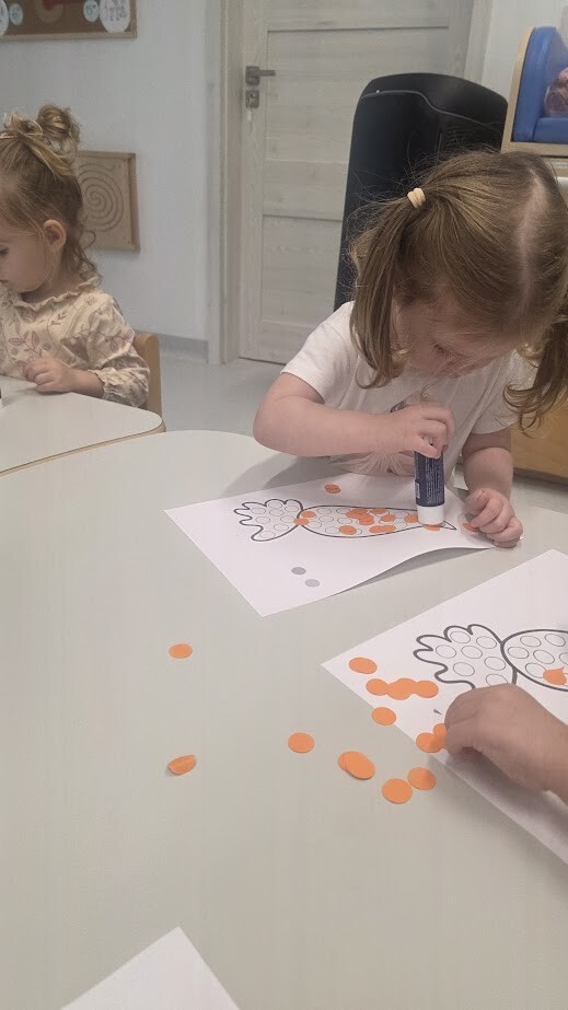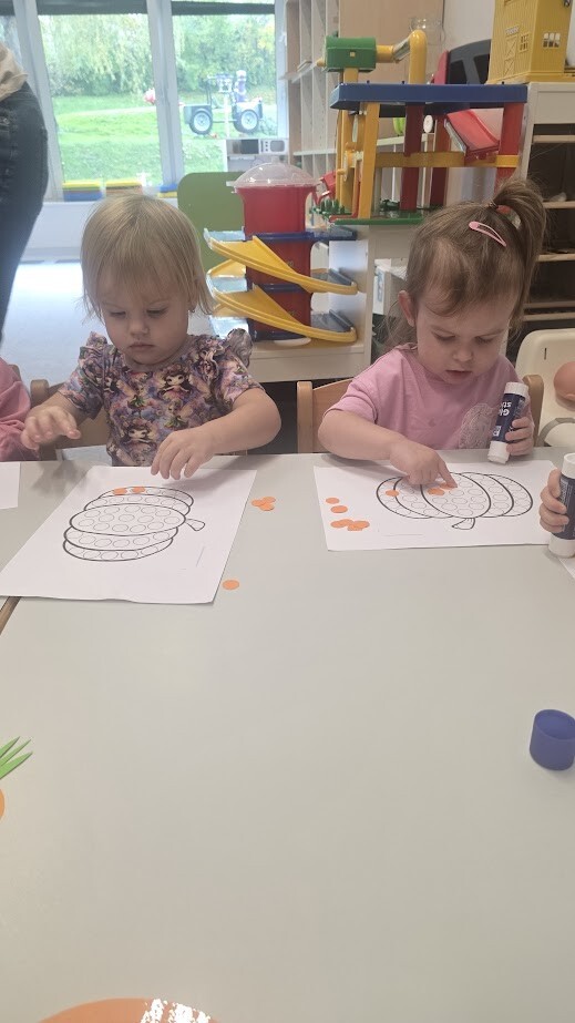 Podczas zajęć plastycznych maluchy tworzyły kolorowe prace dynie i marchewkę wyklejały kropeczkami w bardzo dużym skupieniu wspierając rozwój koordynacji oko-ręka.