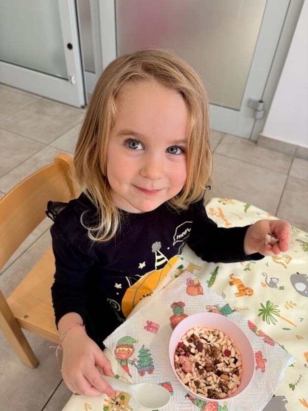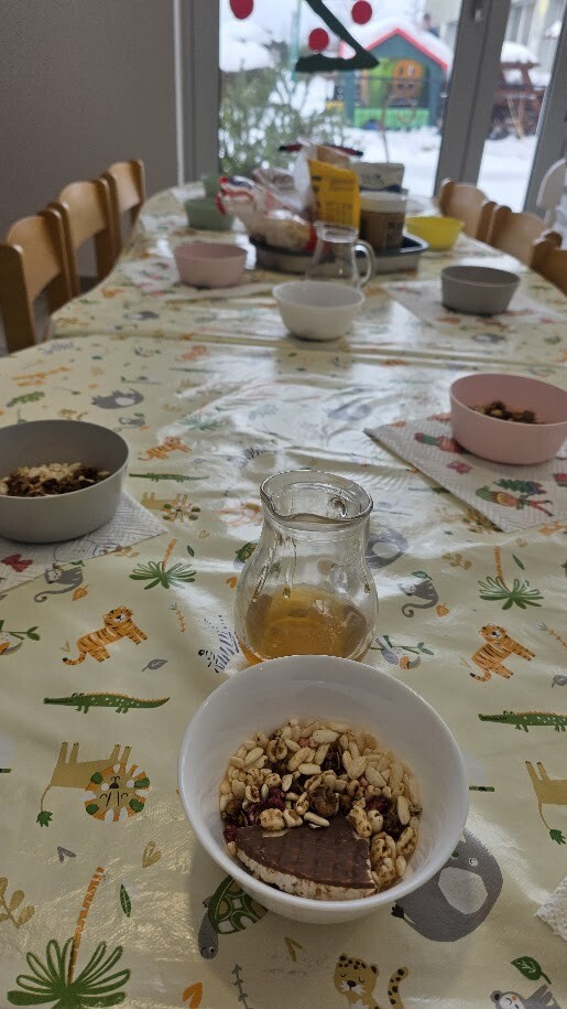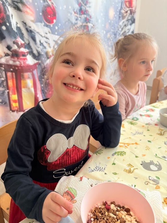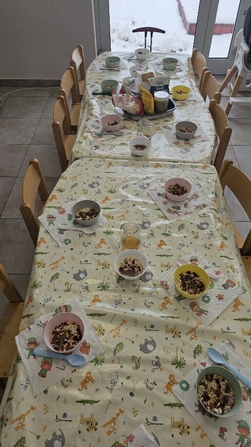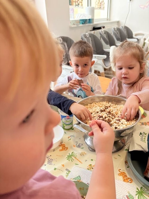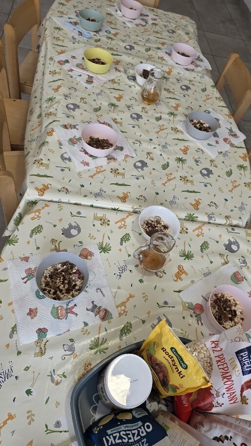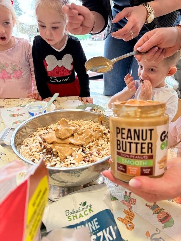 Maluchy zaangażowaniem mieszały składniki, formowały batoniki i obserwowały, jak z prostych produktów powstaje pyszna przekąska. Zajęcia wspierały rozwój sensoryczny, koordynację oko-ręka kształtowały zdrowe nawyki żywieniowe już od najmłodszych lat.