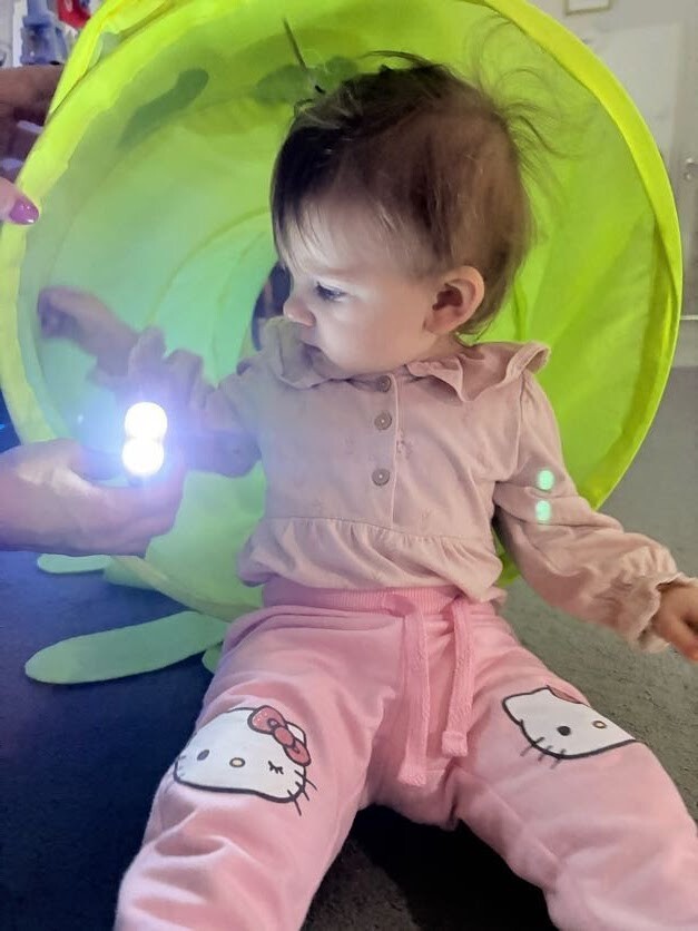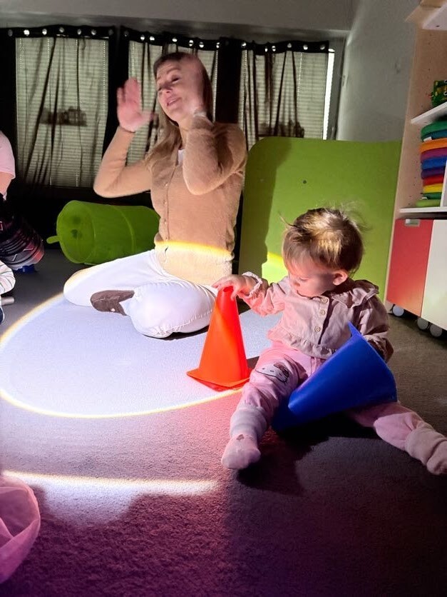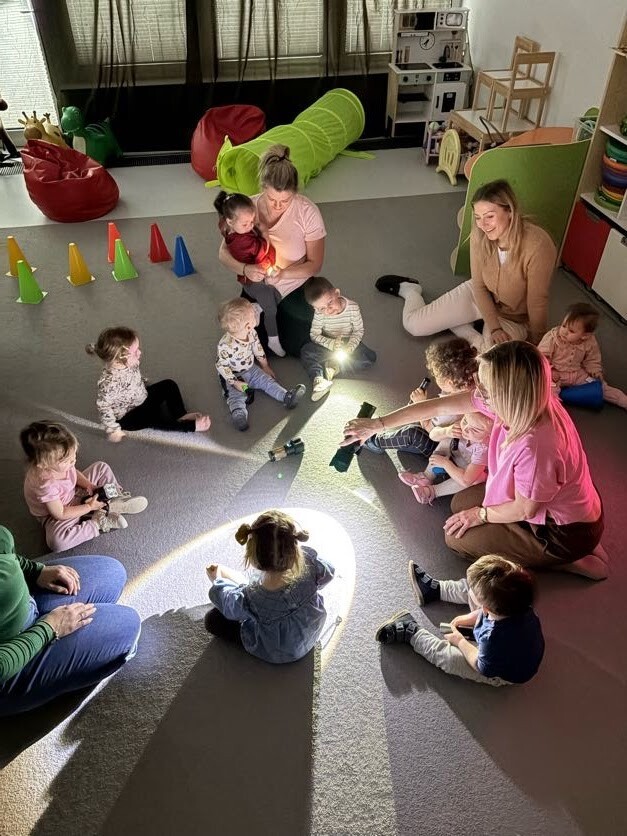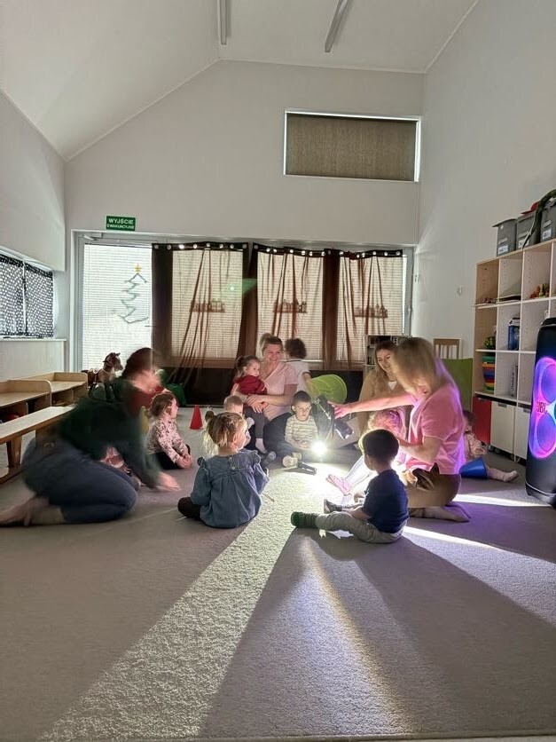 Zabawy ruchowe światełko pojawia się blisko dzieci, maluszki podchodzą i wykonują skoki do świetlnego kółka to dynamiczna i radosna część zajęć która wzmacnia refleks i koordynację.