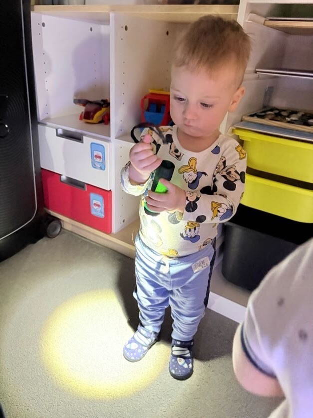 Zabawa rozpoczęła się wspólnym kręgiem Ciocia Sylwia zapala latarkę i wprowadza dzieci w zabawę. Gdy światło pada na dziecko wita sie ono machając rączką i mówiąc ,,cześć''